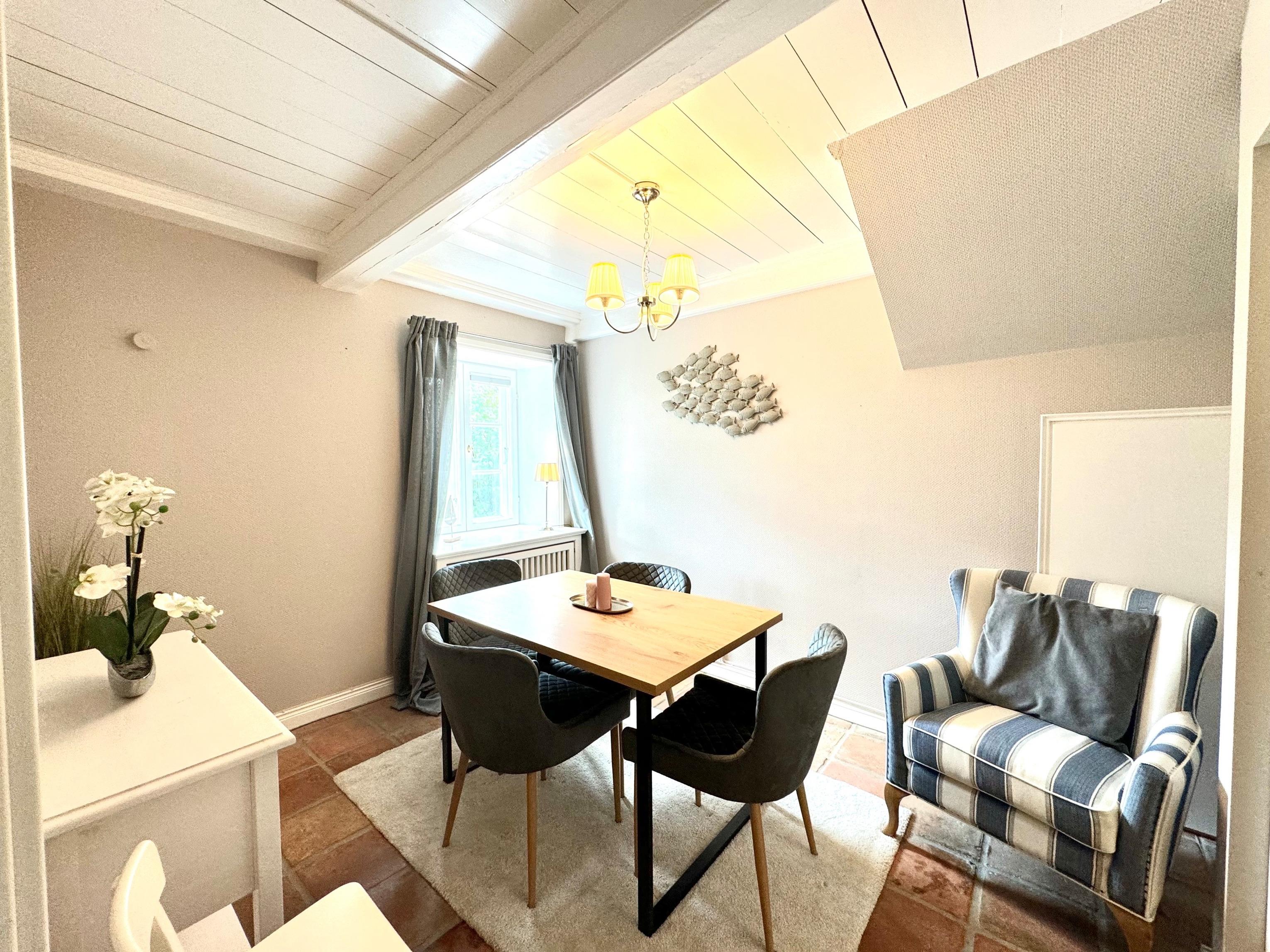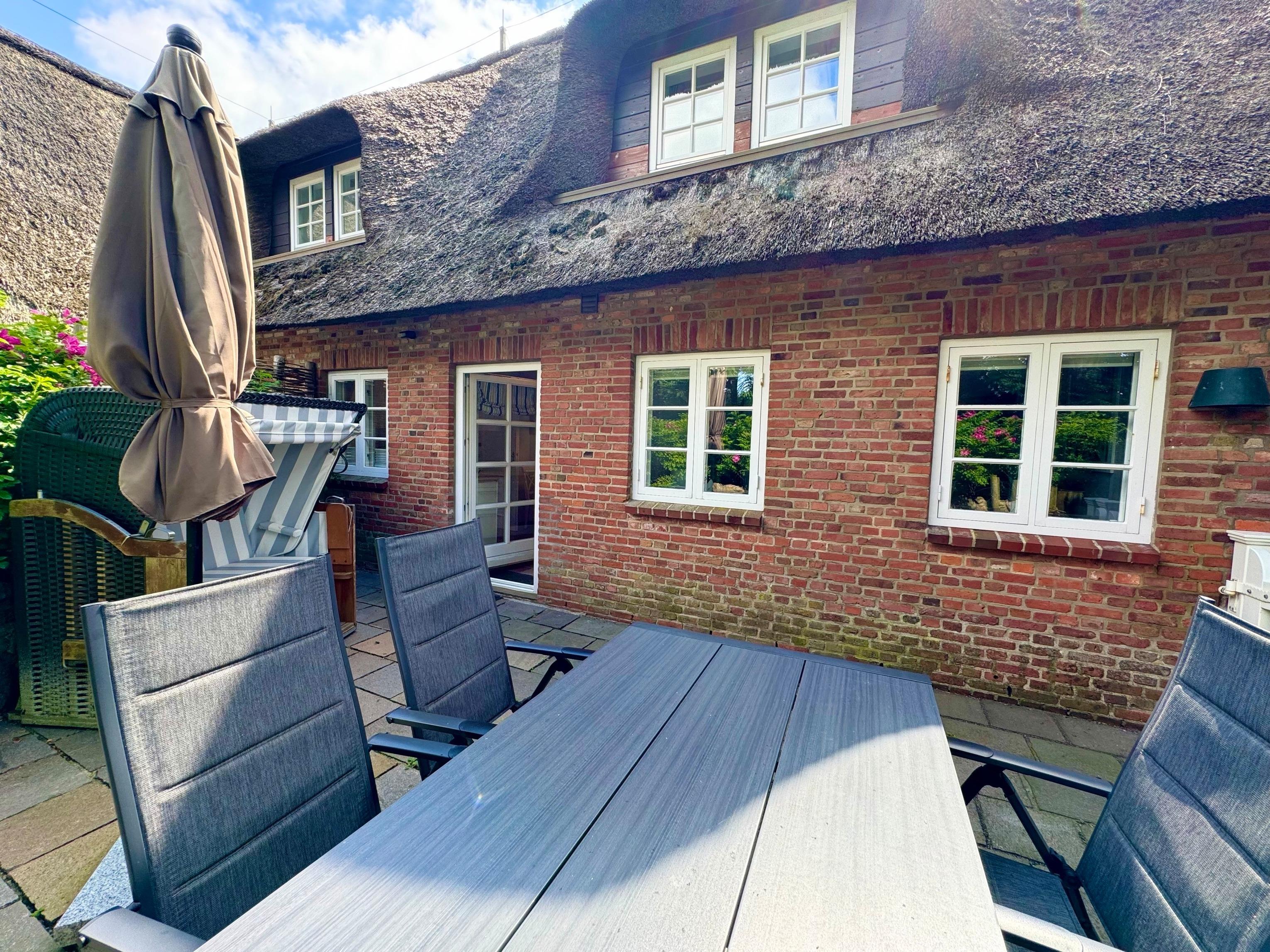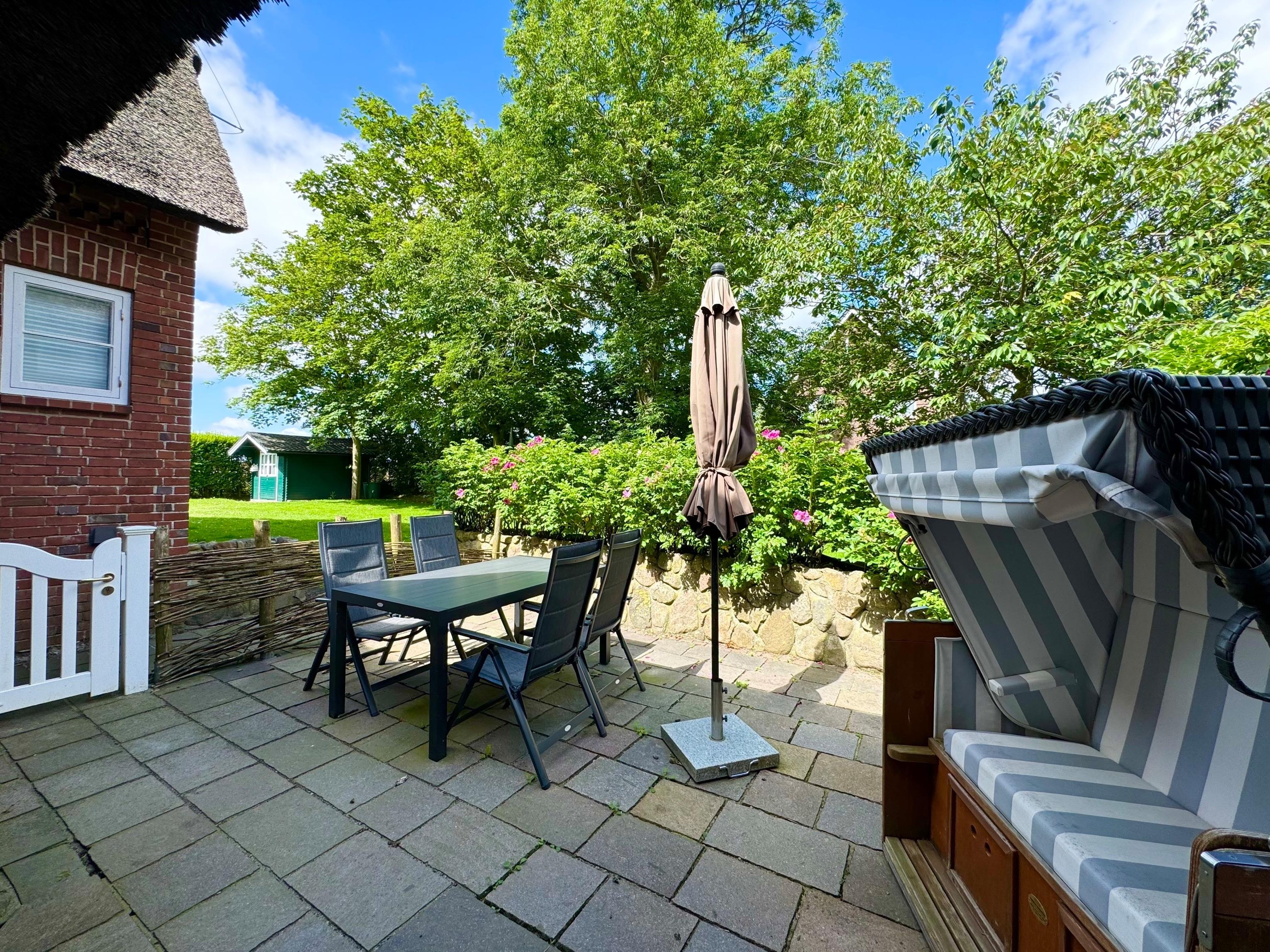 Charmante Ferienwohnung im historischen Reetdachhaus auf Föhr mit Terrasse und Pkw-Stellplatz, ideal für ruhige Urlaubstage.