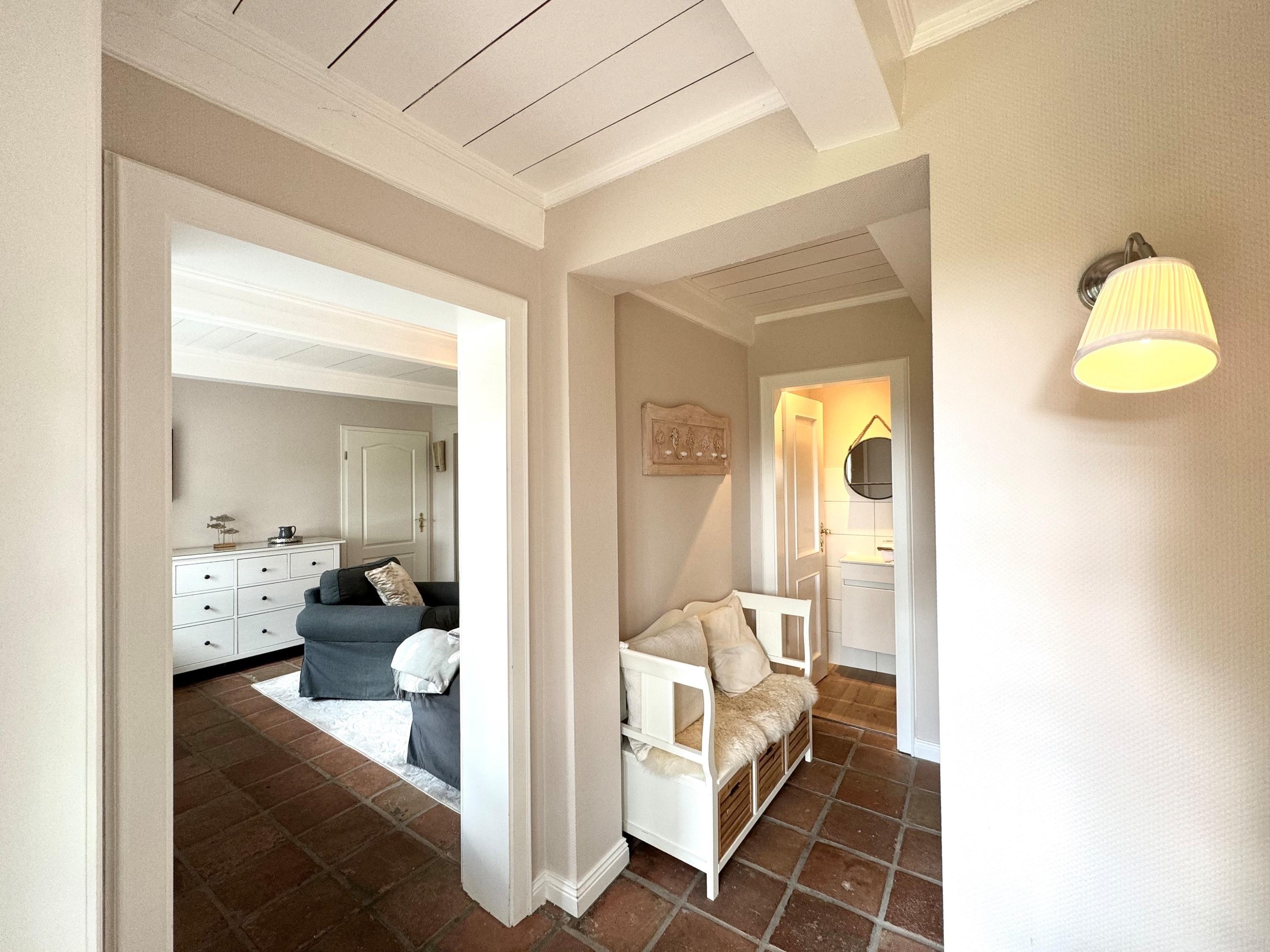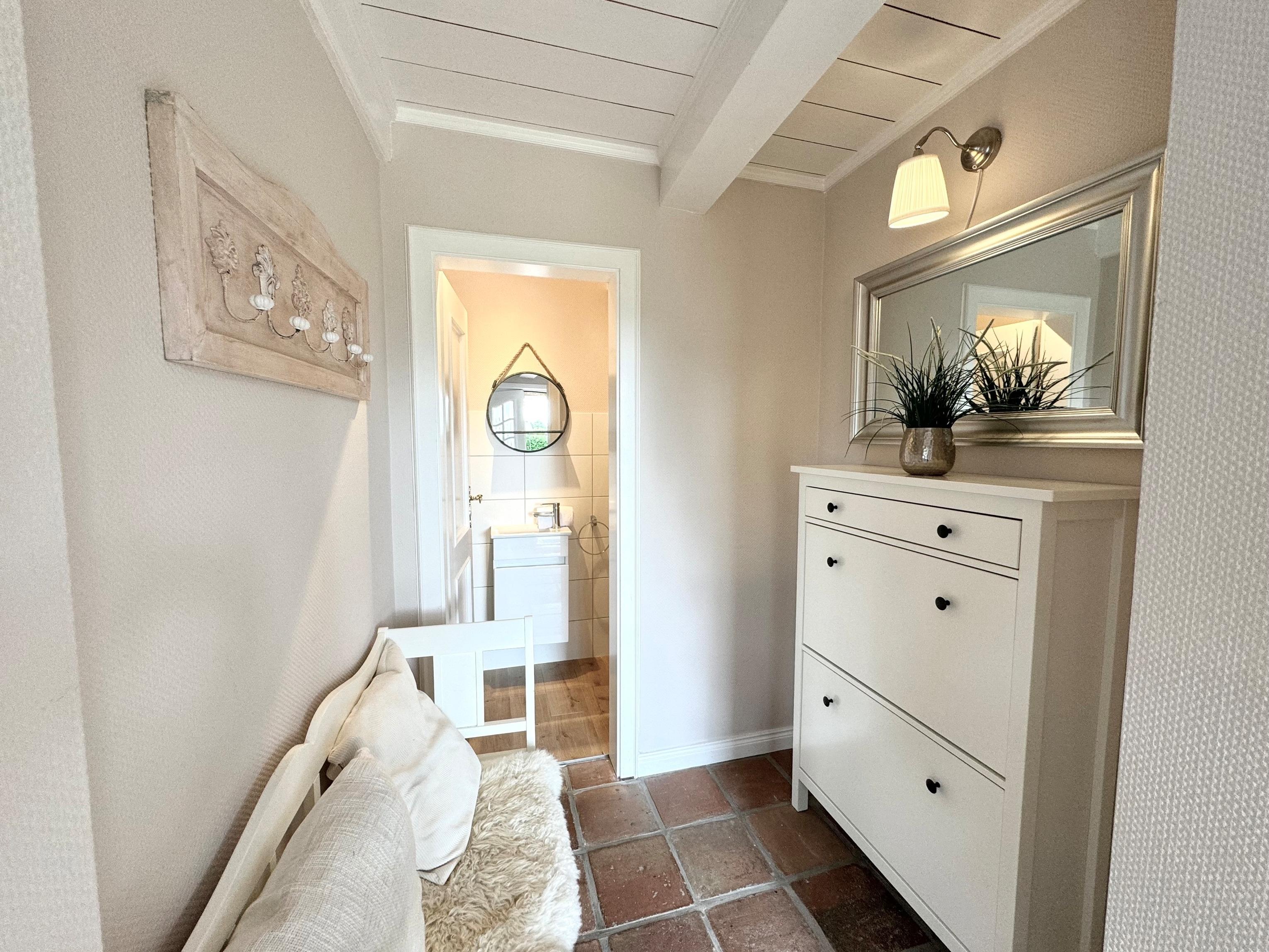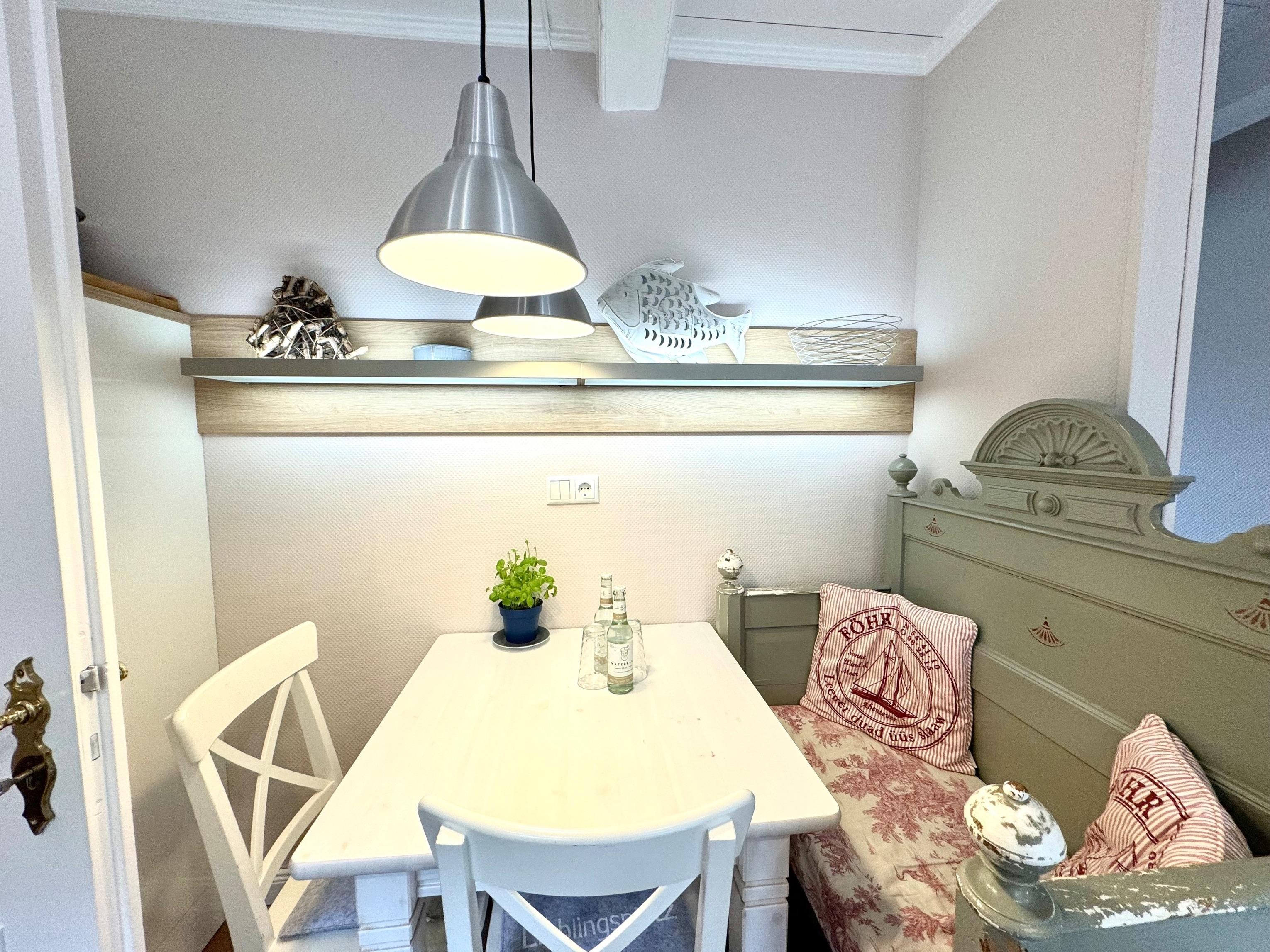 Charmante Ferienwohnung im historischen Reetdachhaus auf Föhr mit Terrasse und Pkw-Stellplatz, ideal für ruhige Urlaubstage.