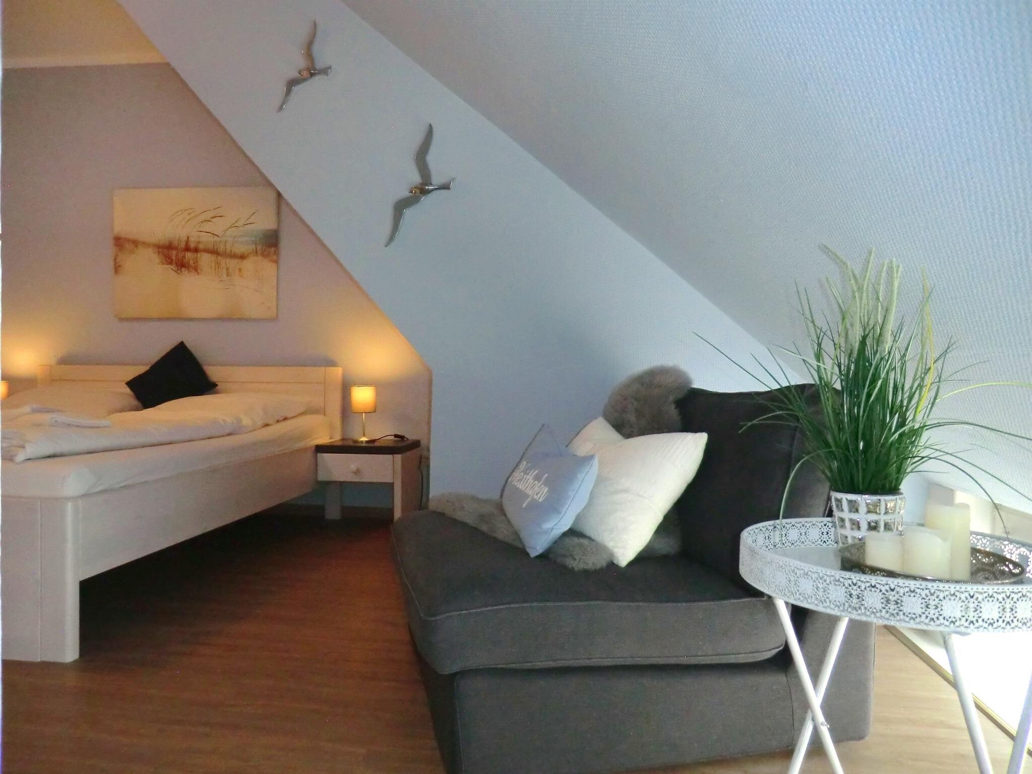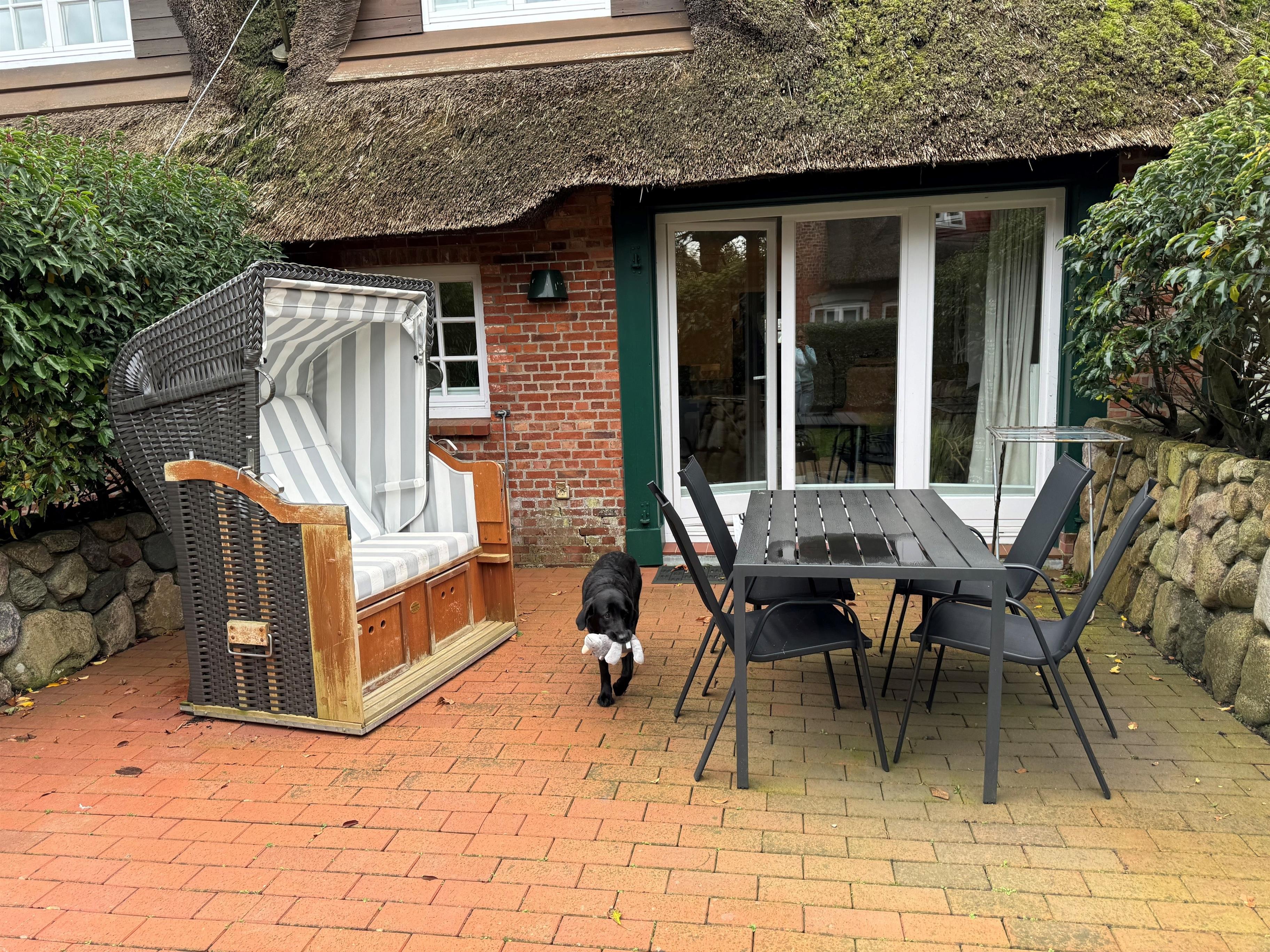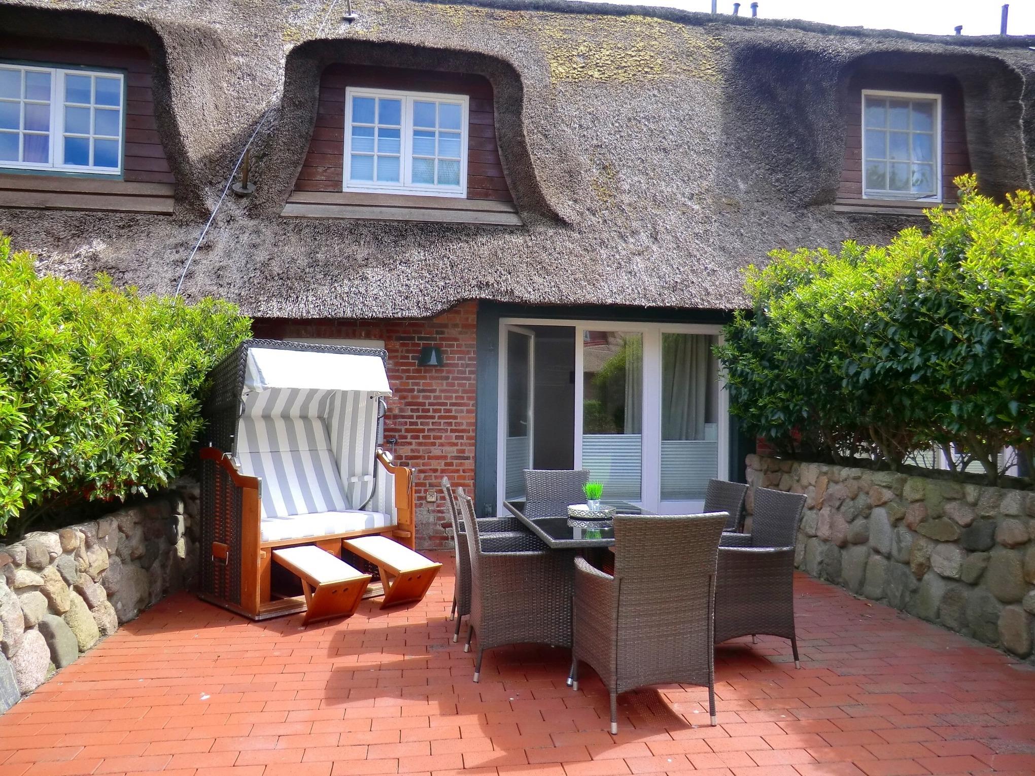 Gemütliche Ferienwohnung im historischen Herrenhof mit Terrasse und Strandkorb in Wrixum auf Föhr, ideal für 4 Personen.