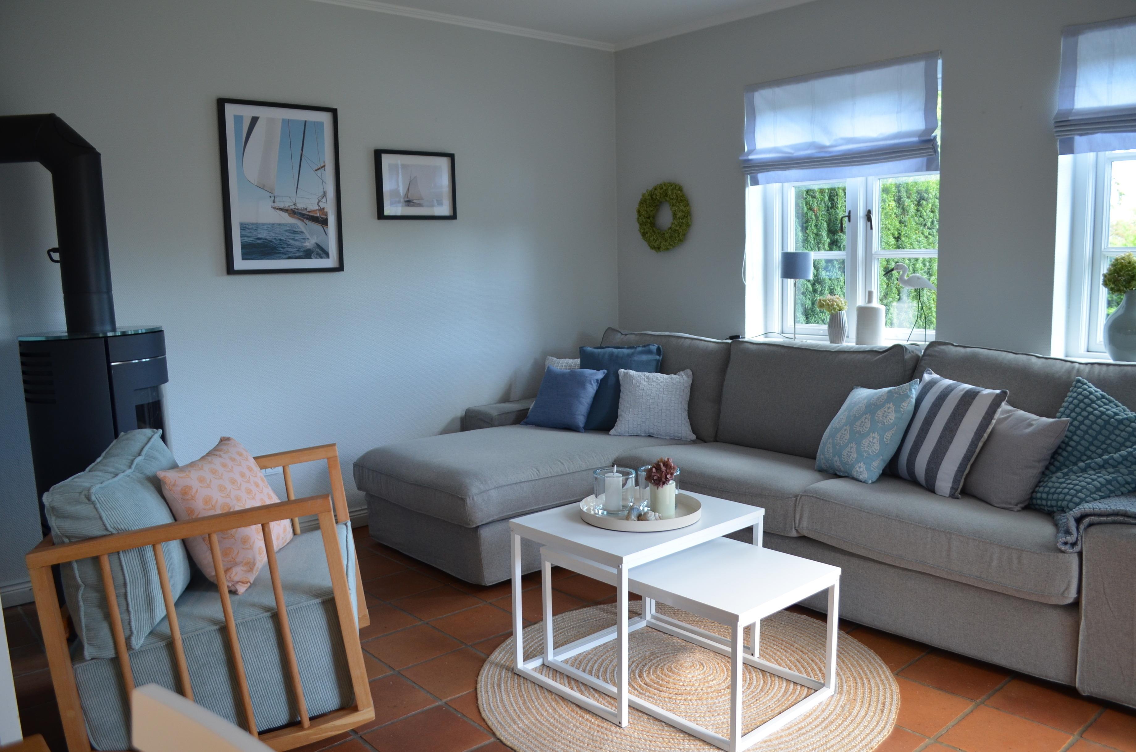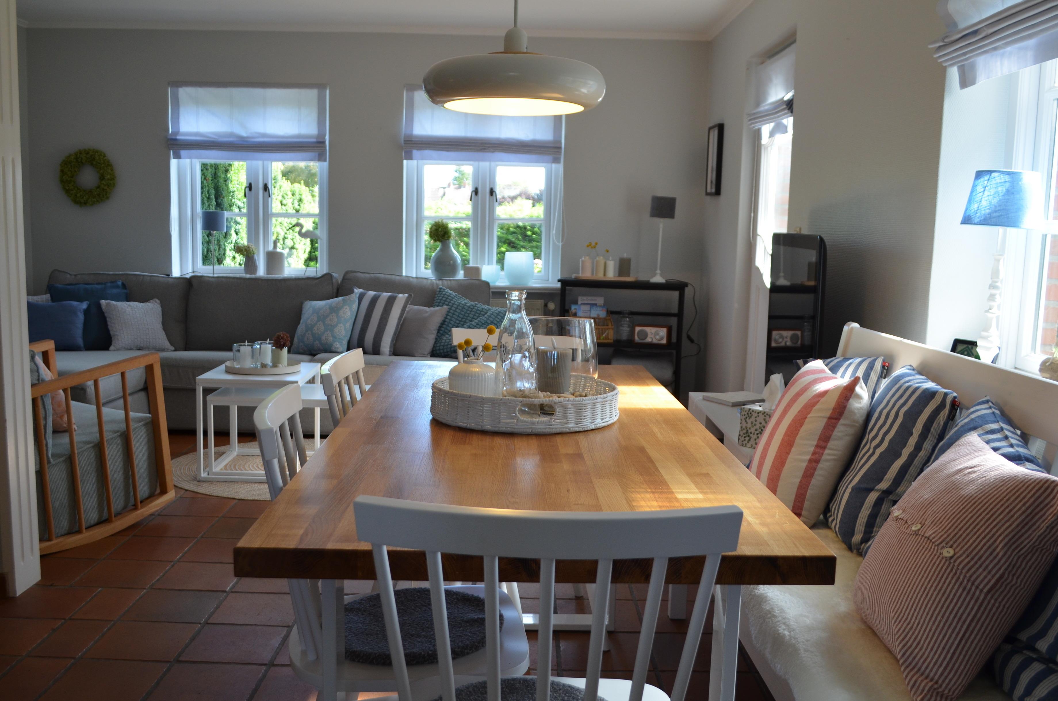 Das Wohn-Esszimmer ist offen und großzügig geschnitten und lädt zum Entspannen und zu gemeinsamen Mahlzeiten ein. Dieser Bereich ist mit der voll ausgestatteten Küche verbunden. In der kalten Jahreszeit bietet der Kaminofen wohlige Wärme und Gemütlichkeit. Vom Wohnbereich hat man einen direkten Zugang zur Südterrasse, dem großen Garten und Ihrem Strandkorb.