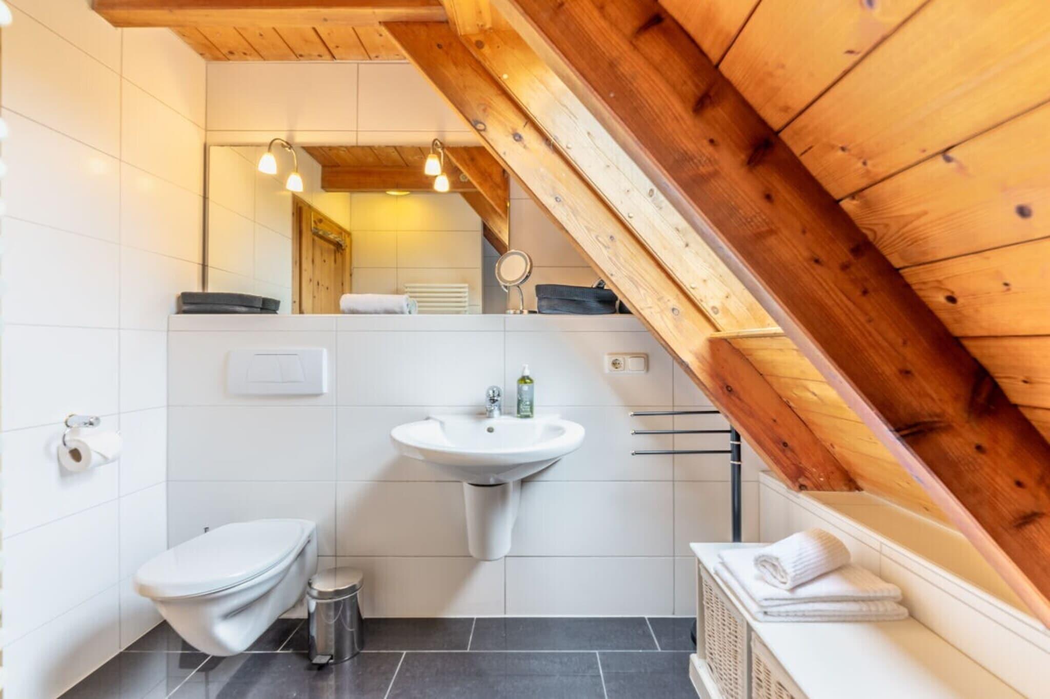 Schlafzimmer Die Ferienwohnung erstreckt sich über zwei Etagen und verfügt über drei komfortable Schlafzimmer, in denen jeder Gast seinen eigenen Rückzugsort findet. Das moderne Design kombiniert gemütliche Elemente mit Funktionalität. Wohnzimmer Im offenen Wohnbereich mit Sofaecke und Esstisch können Sie gesellige Abende verbringen, während das große Fenster viel Tageslicht hereinlässt und eine einladende Atmosphäre schafft. Für Unterhaltung sorgt ein Fernseher sowie eine Spielekonsole. Küche Die voll ausgestattete Küche lädt dazu ein, kulinarische Köstlichkeiten zuzubereiten. Sie finden hier einen 4-Platten-Herd, Backofen, Kühlschrank mit Gefrierfach, Spülmaschine und alle notwendigen Küchenutensilien. Nach einem langen Tag am Strand können Sie sich auf der geschützten Terrasse entspannen, die mit Gartenmöbeln ausgestattet ist. Badezimmer Die Ferienwohnung bietet ein modernes Badezimmer mit bodengleicher Dusche, Waschbecken und WC, und auch hier fehlt es nicht an Komfort. Ein Haartrockner und ausreichend Stauraum machen Ihr Wohlbefinden perfekt.