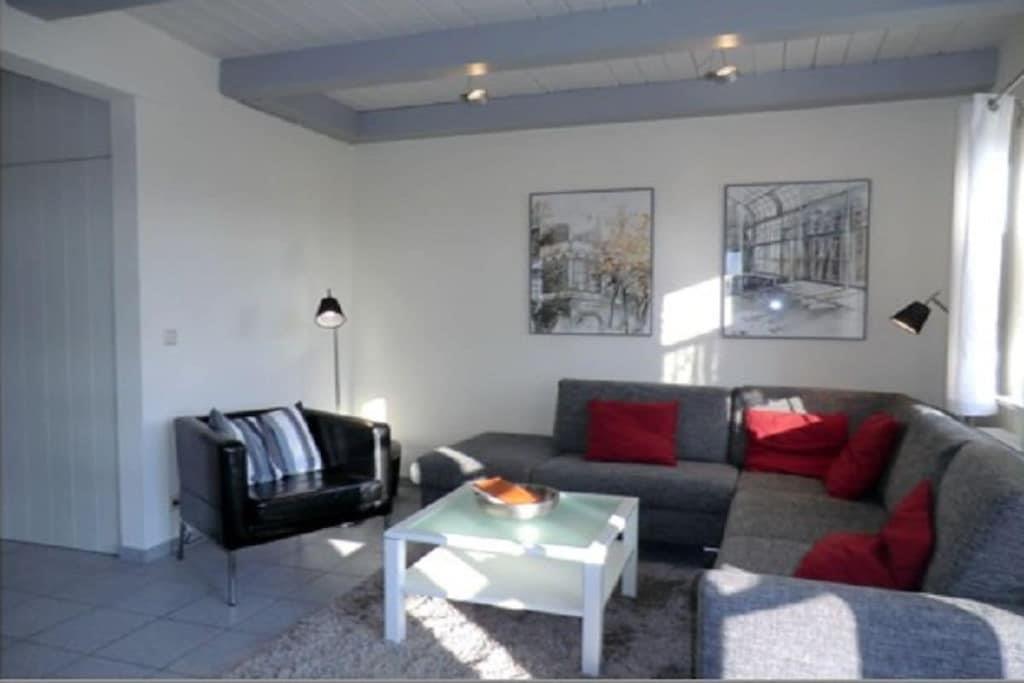 In der 1. Etage: (Schlafzimmer(, Doppelbett, TV), Schlafzimmer(, Einzelbett, Einzelbett), Schlafzimmer(, Einzelbett, Einzelbett)) , , Küche(Kochplatte, Kaffeemaschine, Backofen, Kühlschrank), Wohn/Esszimmer(, , TV, Esstisch), Badezimmer(, Toilette, Dusche, Waschbecken), Badezimmer(, Toilette, Badewanne, Waschbecken), Internet, Trockner, Waschmaschine, Heizung, Terrasse(Gartenmöbel), Parkplatz, Bügelbrett, Bügeleisen, Trockenschrank