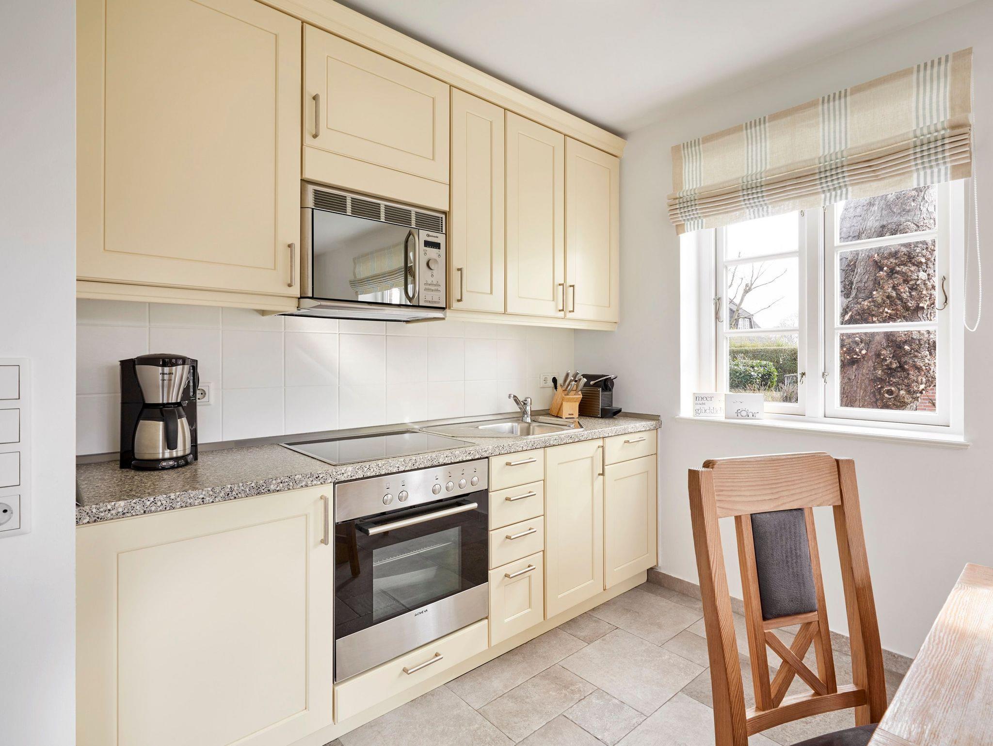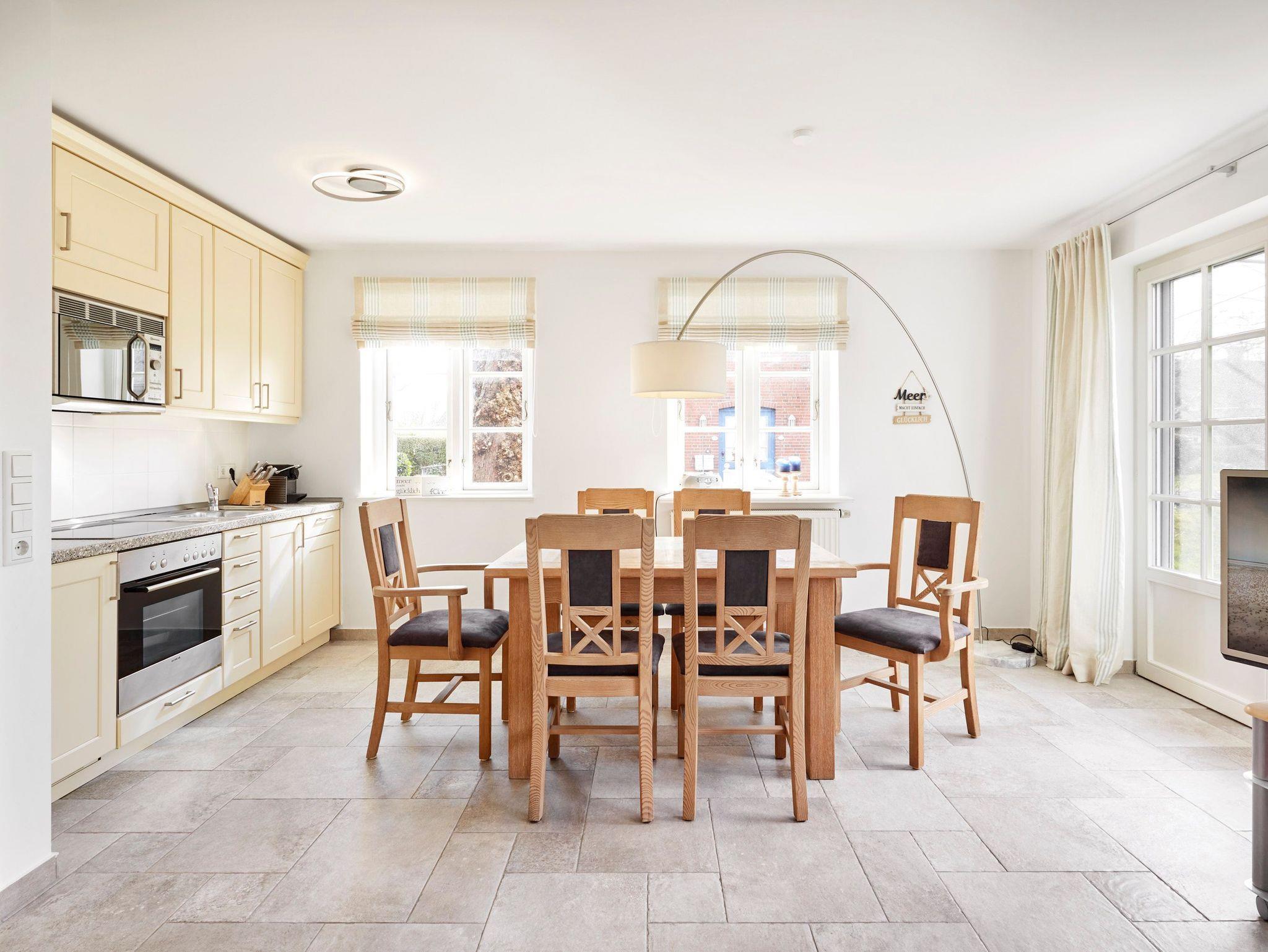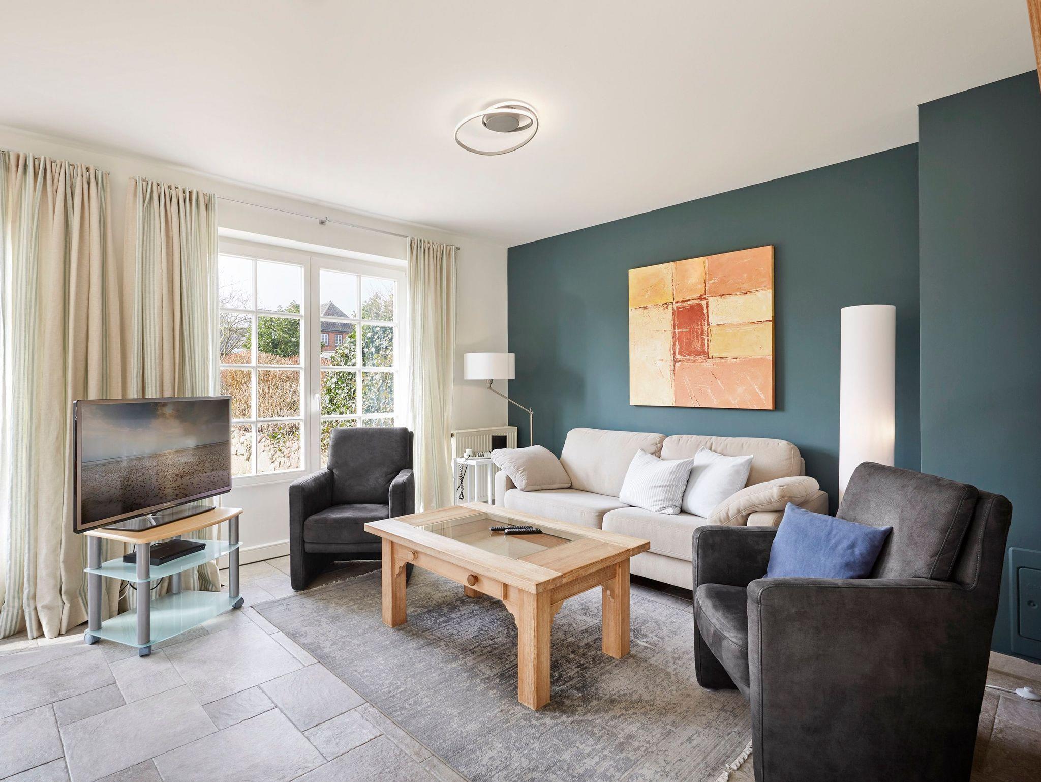 Erleben Sie Ruhe und Komfort im reetgedeckten Haus Kastanie nahe Wyk auf Föhr, nur wenige Fahrradminuten vom Strand entfernt.