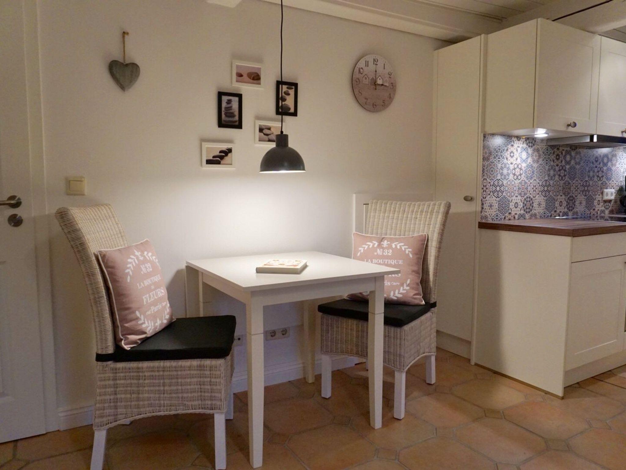 Die im Dezember 2018 renovierte Ferienwohnung ist für 2 Personen und ein Baby geeignet und verfügt über eine maritime und komfortable Einrichtung. Im Erdgeschoss befindet sich ein geschmackvoll eingerichteter Wohn- und Essbereich mit einer modernen Küchenzeile. Das angrenzende Schlafzimmer verfügt über ein Doppelbett und ein kleines Duschbad. Haustiere sind in der Wohnung nicht erlaubt. In etwa 100 Metern Entfernung befindet sich ein kleiner Park mit Strandkörben und Bänken, der zum Entspannen einlädt. Von Frühjahr bis Herbst blühen dort Rosen und Obstbäume in einer bunten Farbenpracht. Ruhige Radwege führen von der Wohnung aus zu den umliegenden Inseldörfern und durch die Landschaft. Mit dem Fahrrad ist der Ort Wyk in weniger als 10 Minuten zu erreichen. Dort gibt es Sehenswürdigkeiten wie den Hafen, die Promenade mit kleinen Geschäften und Gastronomie, ein Wellenbad, die Schutzstation Wattenmeer und einen langen Sandstrand mit Blick auf die Halligen. In Wrixum gibt es fußläufig vom Haus entfernt einen Bäcker, ein Restaurant und einen Fahrradverleih.