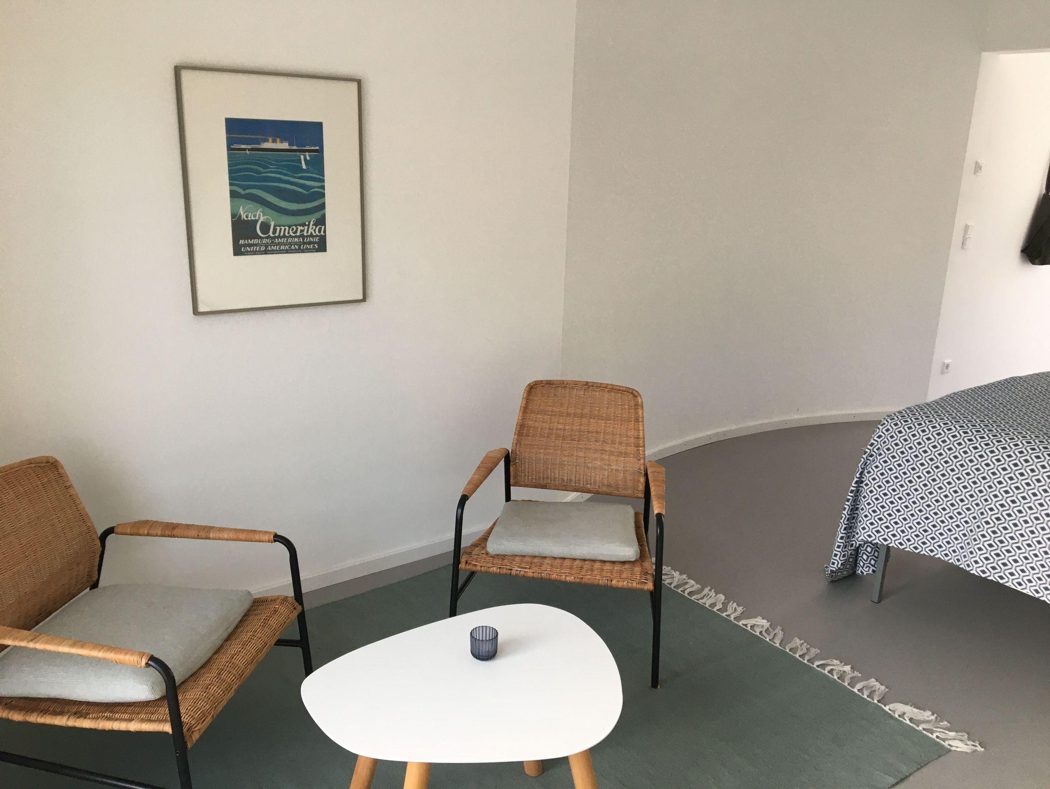 Der Wohnbereich des Apartments ist mit maßangefertigten Einbauschränken und einem Queensize Doppelbett (Breite 1,60 m) vom Tischler ausgestattet. Das Queensize Bett hat zwei Lattenroste mit jeweils verstellbaren Kopf.-und Fußteil, sowie zwei hochwertigen Matratzen von Schlaraffia. Zum Wohnbereich gehören außerdem zwei bequeme Couchsessel, nebst Couchtisch, sowie eine Kommode, die weiteren Stauraum bietet.
