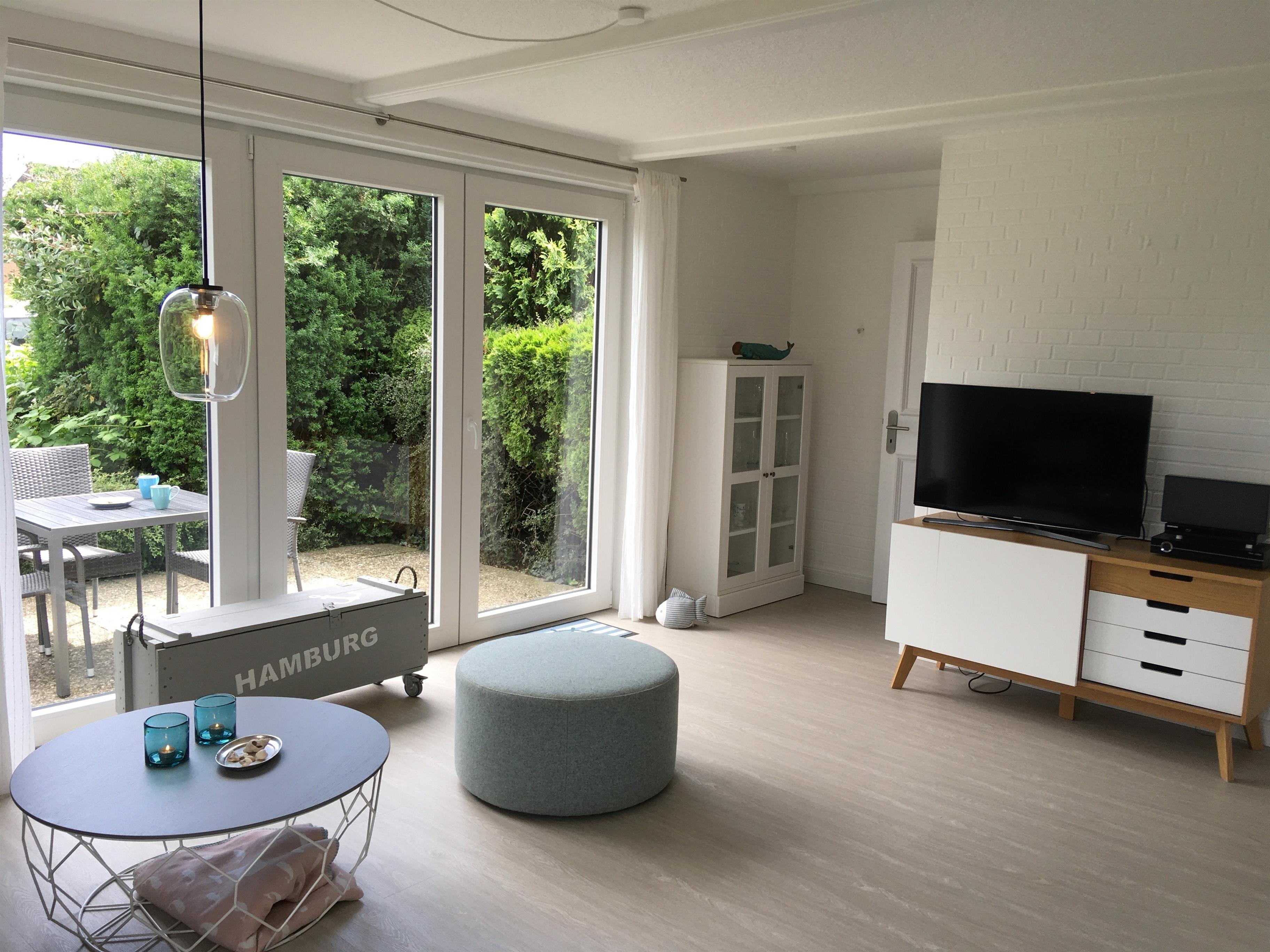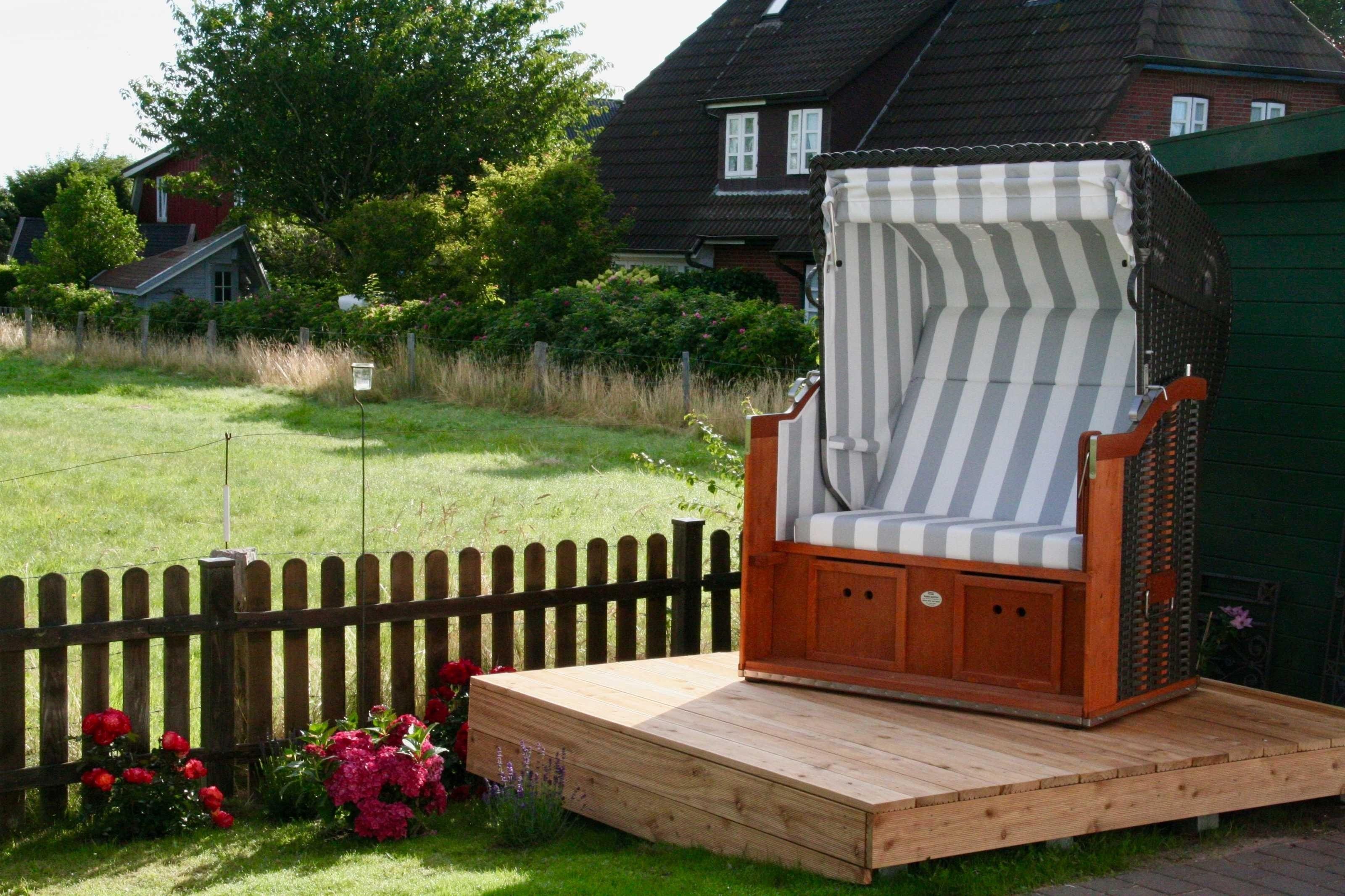 Gemütliches Ferienhaus in Wrixum mit zwei Terrassen, Strandkorb und nordischer Einrichtung, ideal für ruhigen Urlaub nahe Strand und Stadt.