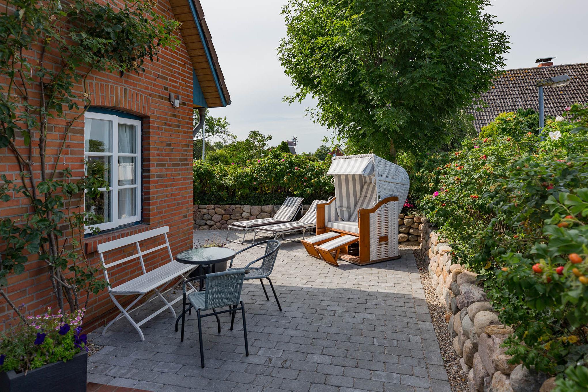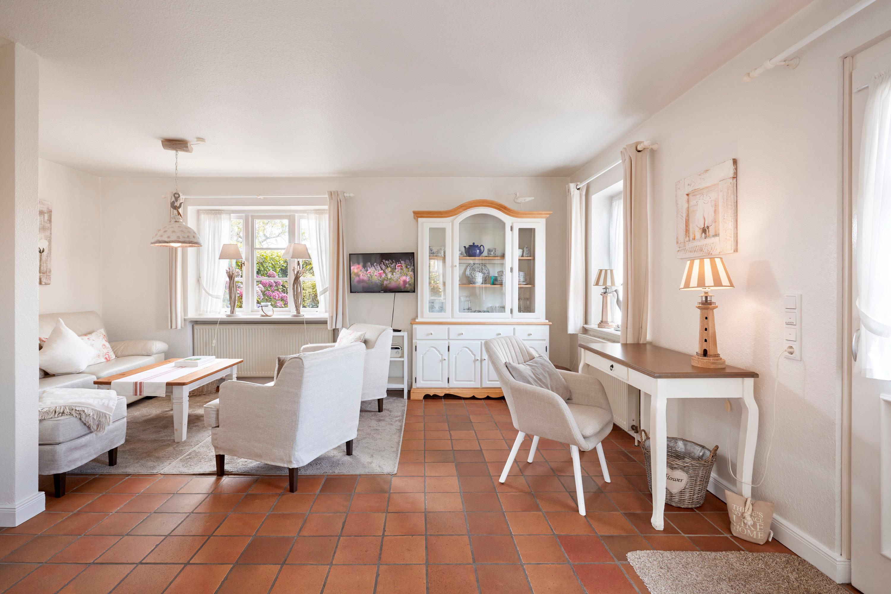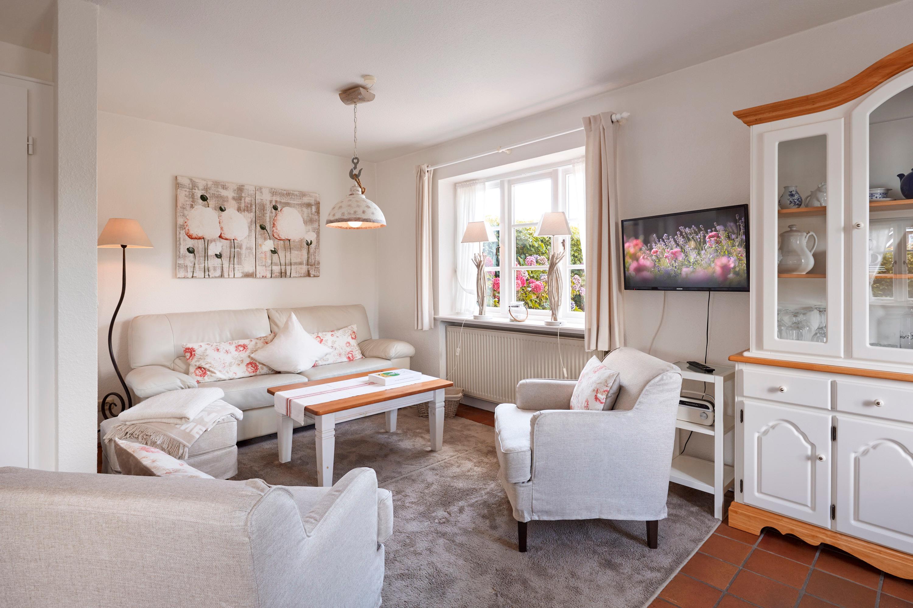 Willkommen im Rosen Huus 2. Der Duft alter friesischer Rosensorten empfängt Sie schon vor dem Haus und unterstreicht den unvergleichbaren Charme dieser Doppelhaushälfte. Die Lage in Wrixum, dem romantischen Dorf mit der Windmühle, ist ideal für Erholungsuchende. Trotzdem sind das lebhafte Städtchen Wyk, der Strand, Surfen, Tennis, Reiten und der traumhafte Golfplatz ganz in der Nähe. Diese Lage macht das Wohnen in ländlicher Umgebung so reizvoll. Sie werden sich in dieses Haus verlieben.