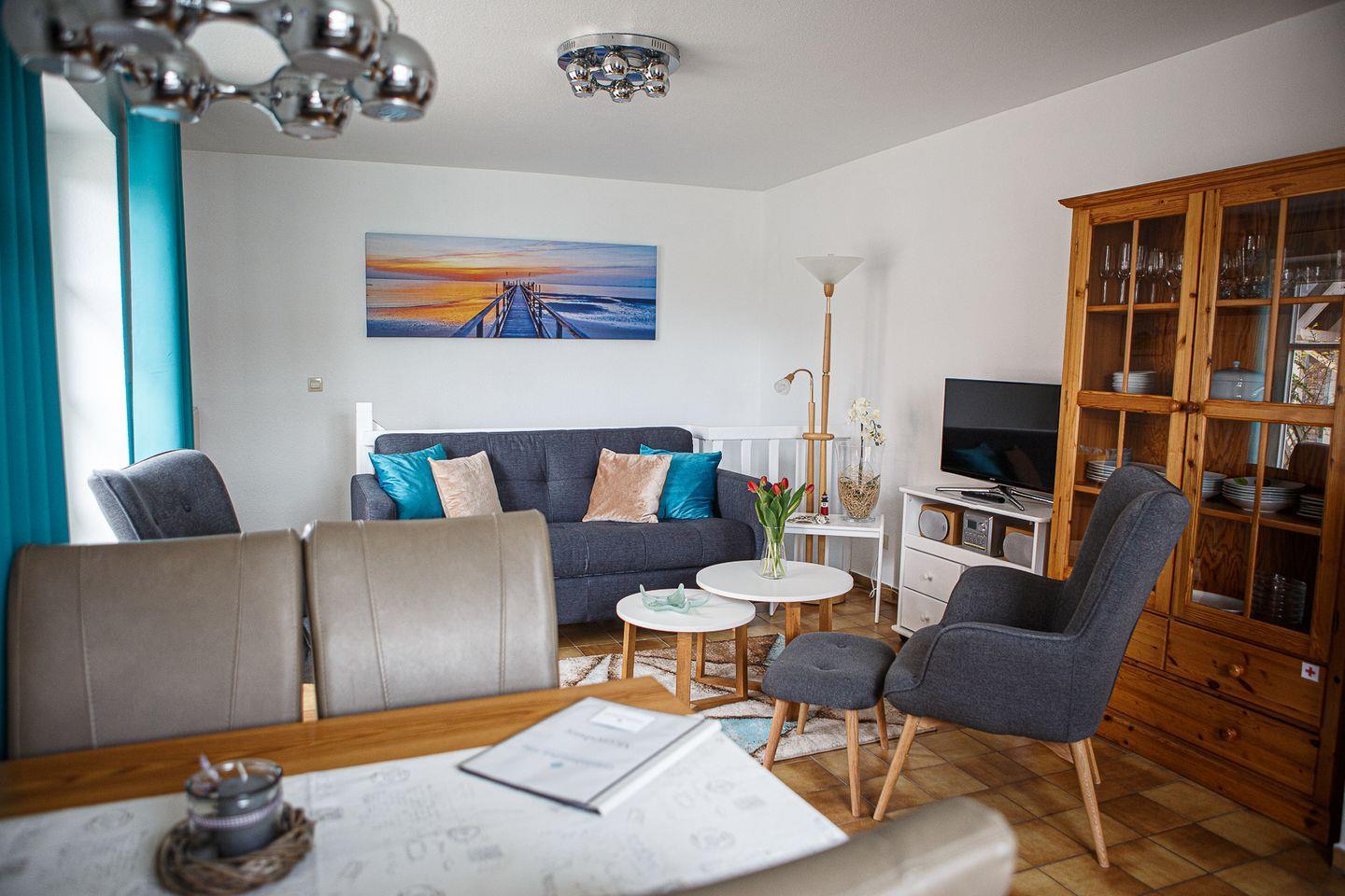 Die „Meeresburg“ ist geschmackvoll eingerichtet und bietet Platz für bis zu 2 Personen. Der offene Wohnbereich ist hell und einladend, mit komfortablen Möbeln, die zum Entspannen einladen. Hier können Sie nach einem erlebnisreichen Tag die Seele baumeln lassen und die ruhige Atmosphäre genießen.