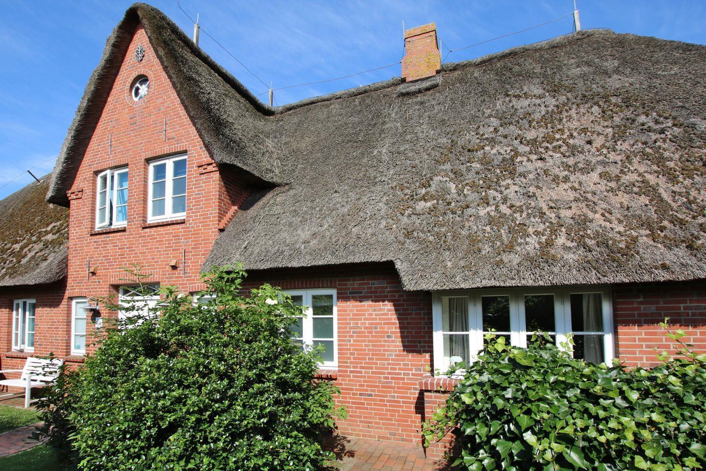 Gemütliche und komfortable Ferienwohnung in Wrixum mit 3 Zimmern im Reetdachhaus - Nichtraucher - sehr schönes Wohnzimmer mit 2er Ledercoach mit Schlaffunktion, 1 Sessel mit Hocker, Kamin, Flatscreen-TV, Radio, Telefon, Terrassenzugang - Offener Küchenbereich: Vollausgestattete Küche mit Essplatz für 5 Personen - Schlafzimmer 1 mit Doppelbett (180 cm breit) und zwei Kleiderschränken - Bad en Suite mit Dusche/WC (2018 komplett neu) - Schlafzimmer 2 mit Einzelbett, kleinem Schreibtisch und Flatscreen -TV, Telefon – Gäste WC im EG, (2018 komplett neu) W-LAN, Kinderreisebett, Kinderhochstuhl, 1 Haustier auf Anfrage und gegen Gebühr, weitere ausschließlich auf Anfrage - gemütliche Terrasse mit Terrassenmöbel und Garten - Waschmaschine und Trockner zur gemeinschaftlichen Nutzung auf Münzbasis. - eigener Parkplatz am Haus -eine E-Ladestation für 2 Autos befindet sich in ca. 100 m entfernt an der Marsch - zum Zentrum von Wyk sind es 2 Kilometer, zum Strand 2 bis 3 Kilometer, Bäcker in unmittelbarer Nachbarschaft