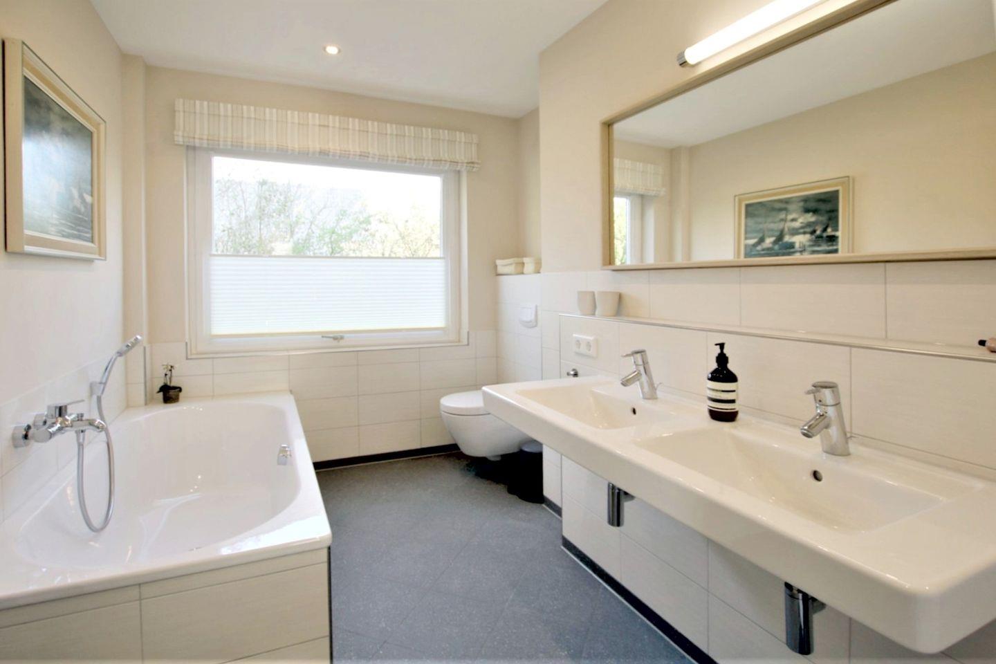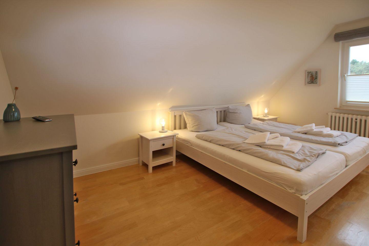 Im 1.OG befinden sich zwei weitere Schlafzimmer. Das eine mit zwei Einzelbetten, Sitzecke und Kommode und das andere mit Doppelbett (1,80x2,00m), SAT-TV(Smart-TV) und Einbauschrank. Bad 3 im 1.OG mit großer Dusche und WC.