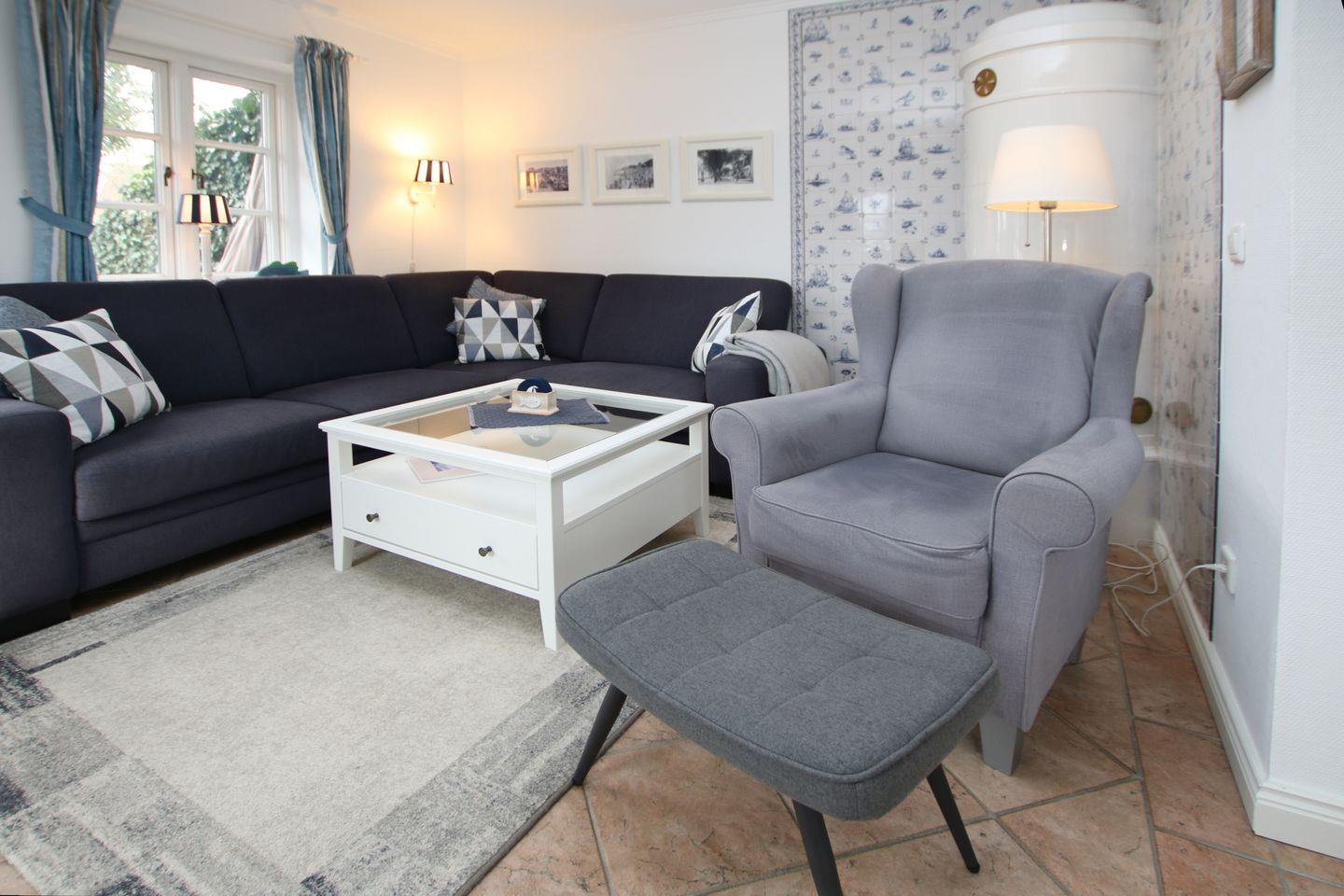 - Wohnzimmer mit Couch, Sesseln, Kaminofen