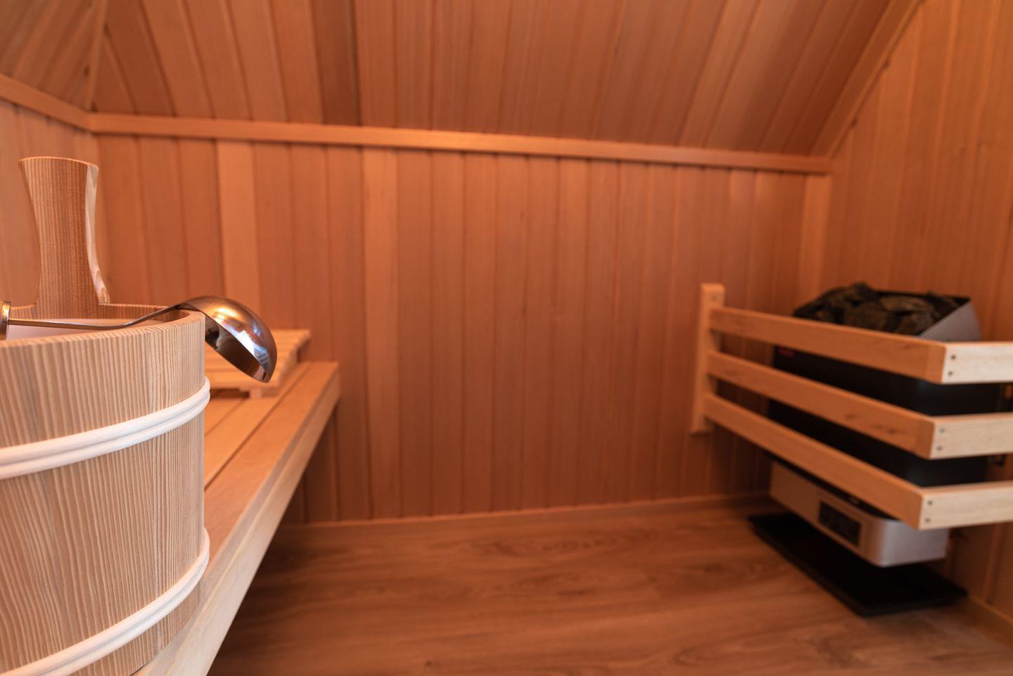 Das Dachgeschoss beherbergt die hauseigene Sauna samt Ruheraum.