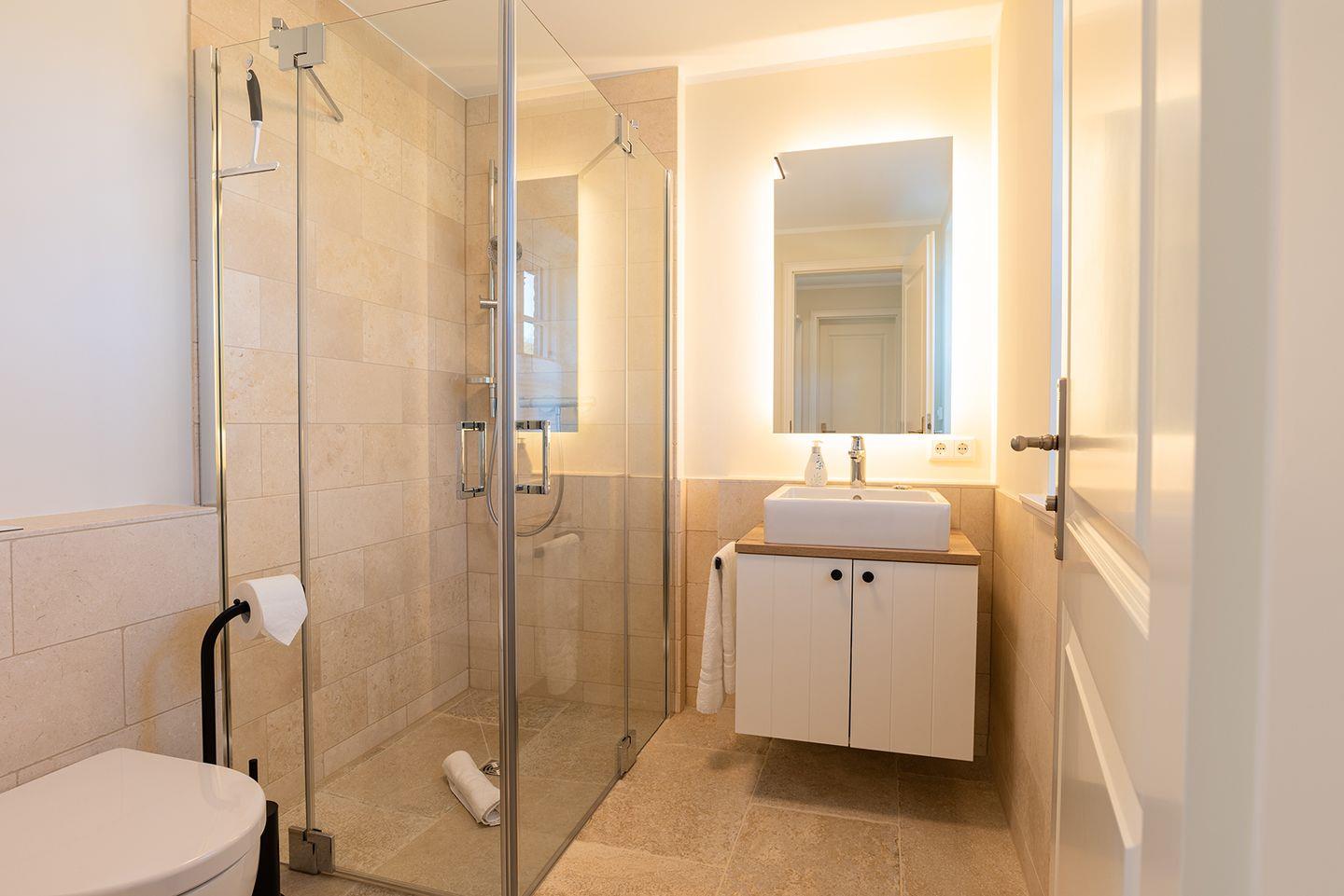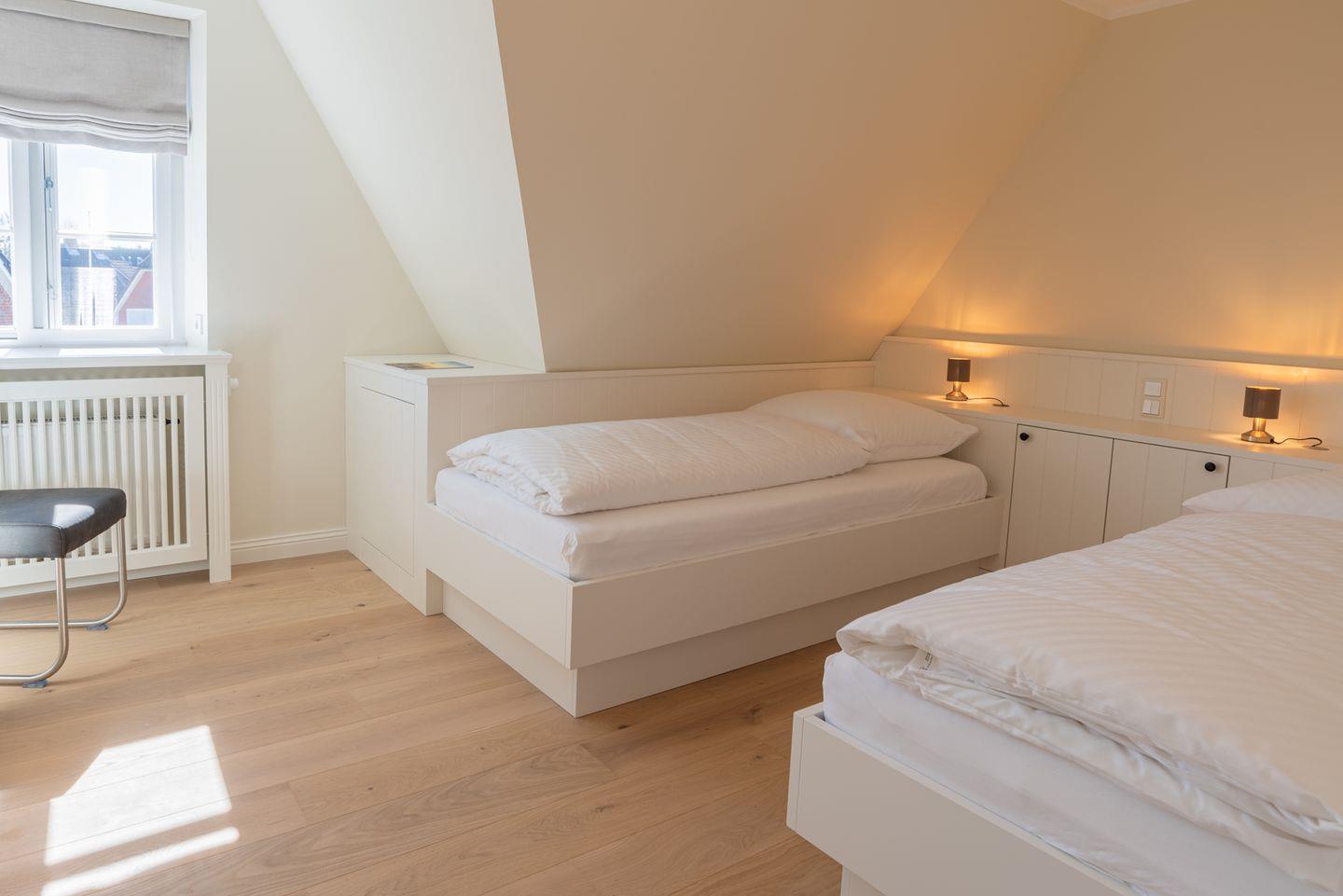 Im Obergeschoss sind die drei Schlafzimmer sowie ein zweites Duschbad gelegen. Zwei Schlafzimmer sind jeweils mit einem Doppelbett ausgestattet, das dritte mit zwei Einzelbetten.