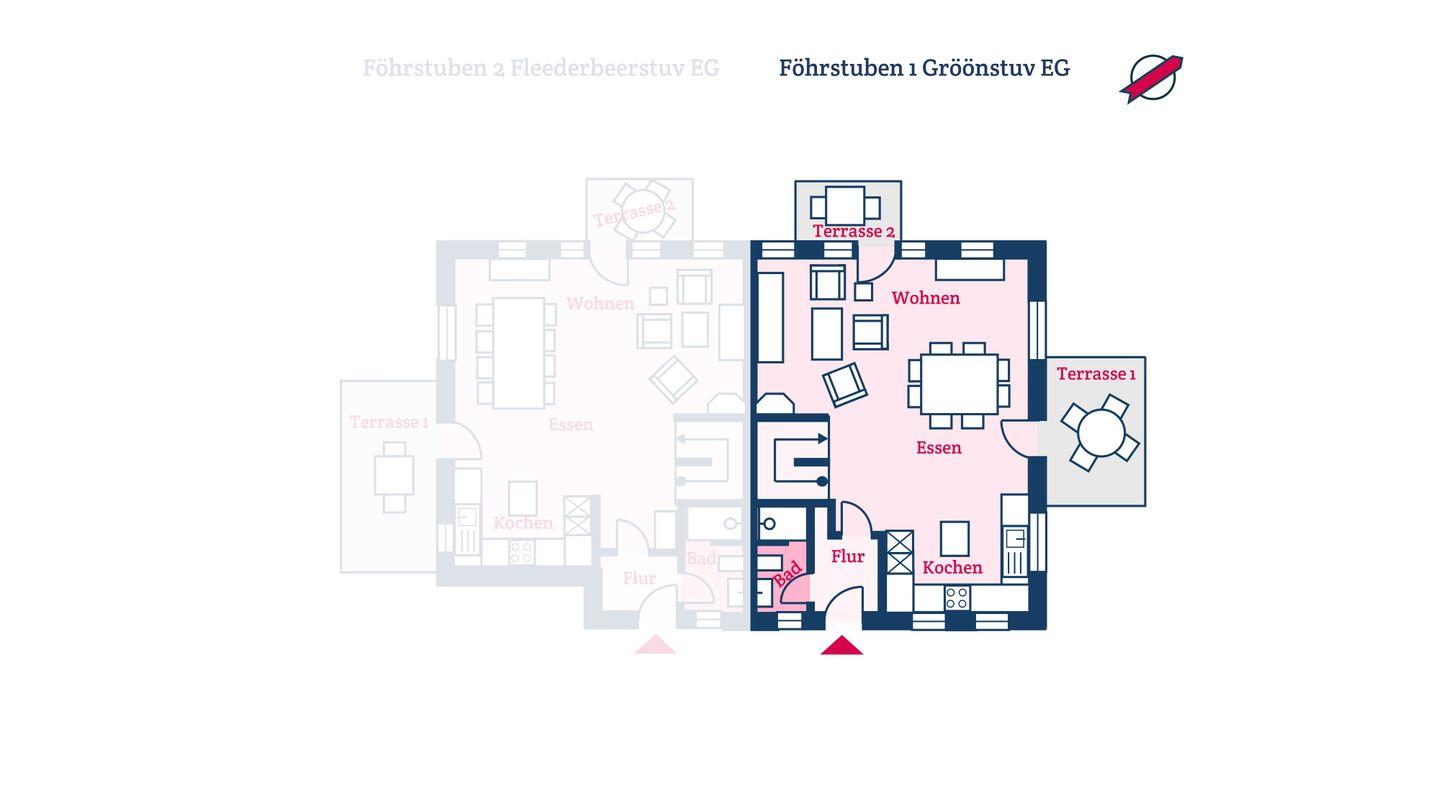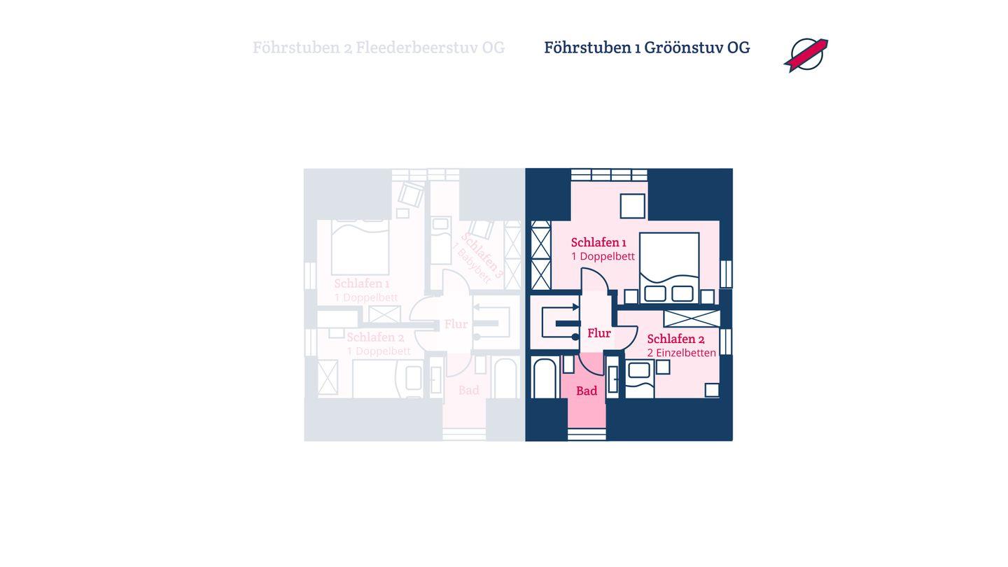 Die Ferienwohnung Gröönstuv im Haus Föhrstuben verfügt über 2 Schlafzimmer und 2 Bäder und bietet somit komfortabel Platz für bis zu 4 Personen zuzüglich einer Kleinkinderaufbettung. Auch bis zu 2 Hunde sind herzlich willkommen.