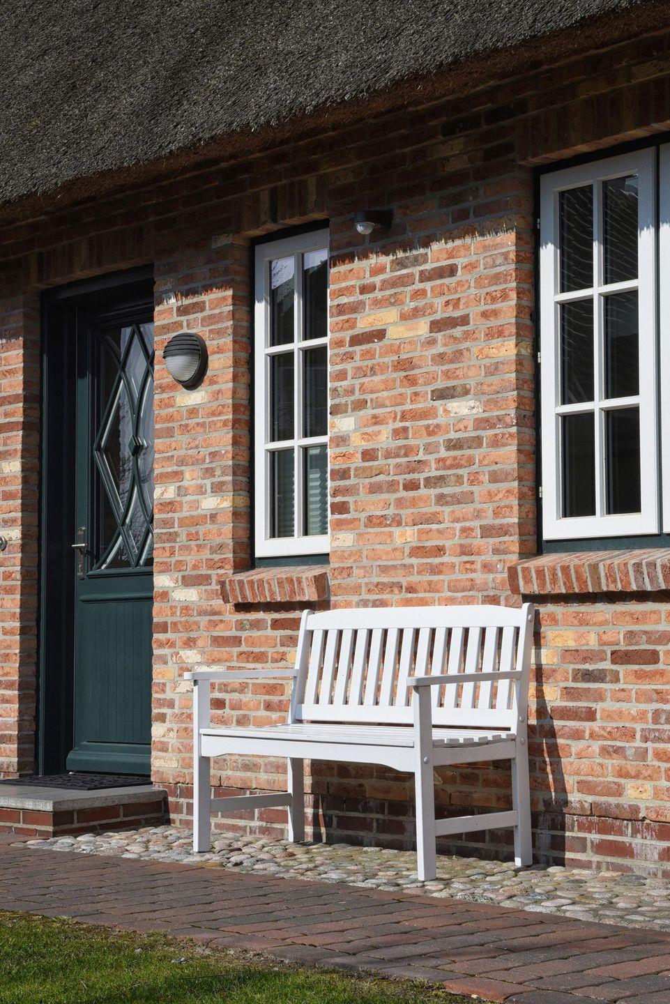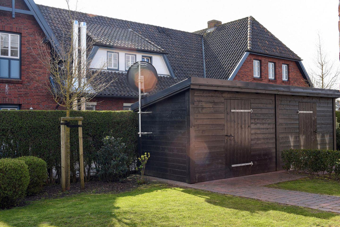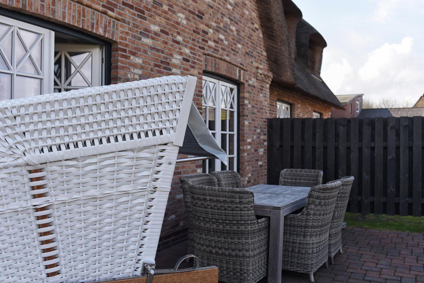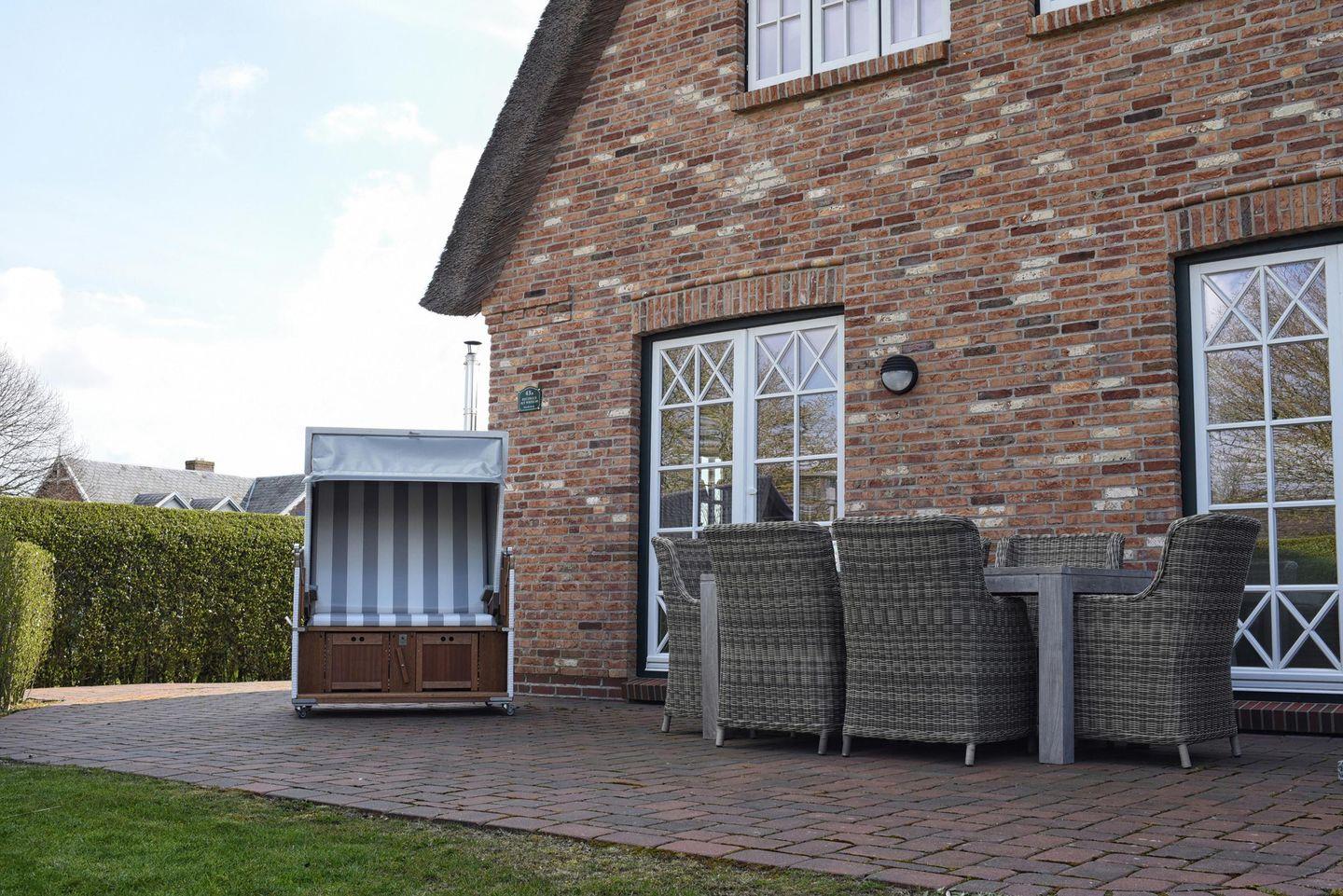 Der Außenbereich ist durch Heckenbepflanzungen und ein Gartentor voll umschlossen. Er zeichnet sich durch die möblierte Terrasse sowie zwei Sonnenliegen aus. Ein PKW-Parkplatz ist ebenfalls vorhanden. Dank der geringen Entfernung zum begehrten Wyker Badestrand, des nichtsdestotrotz ruhig gelegenen Standorts und der Möglichkeit, Fährräder in einem zur Unterkunft gehörenden Holzschuppen unterstellen zu können, ist das Feriendomizil optimal für Urlaube an warmen Tagen des Jahres geeignet. Ein Mylin-Kachelofen sorgt dafür, dass das Reethuus Alt Wrixum auch zur kälteren Jahreszeit oder an stürmischen Nordseetagen zu dem hyggeligen Urlaubsheim wird, nach welchem sich so viele sehnen.