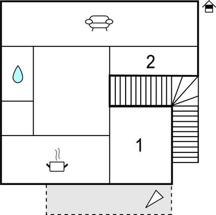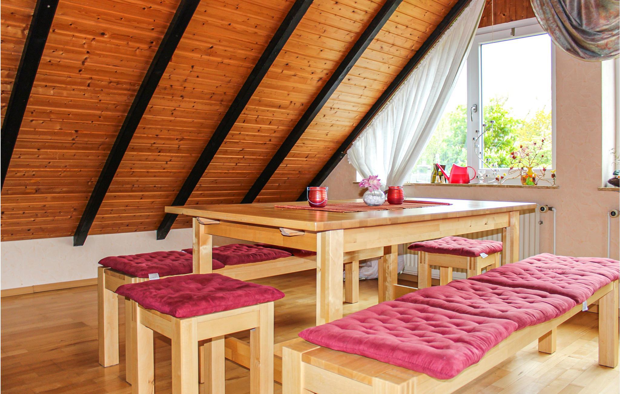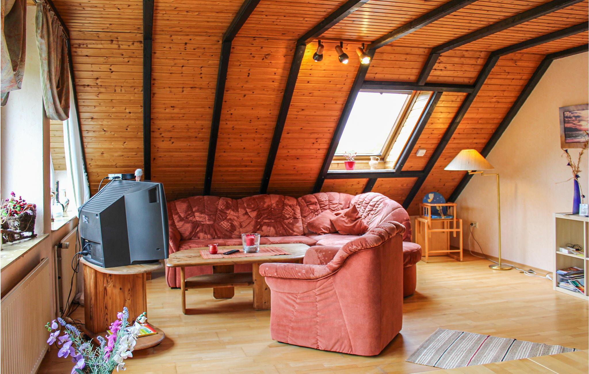 Die Wohnung befindet sich im 1. Obergeschoss des Wohnhauses und verfügt über Dachschrägen. Das Elternschlafzimmer ist mit einem Doppelbett sowie einem Babybett ausgestattet, im zweiten Schlafzimmer befindet sich ein Einzelbett. Im geräumigen Wohnraum sind bis zu vier weitere Schlafplätze vorhanden. Das Badezimmer ist mit Waschmaschine und Badewanne ausgestattet.