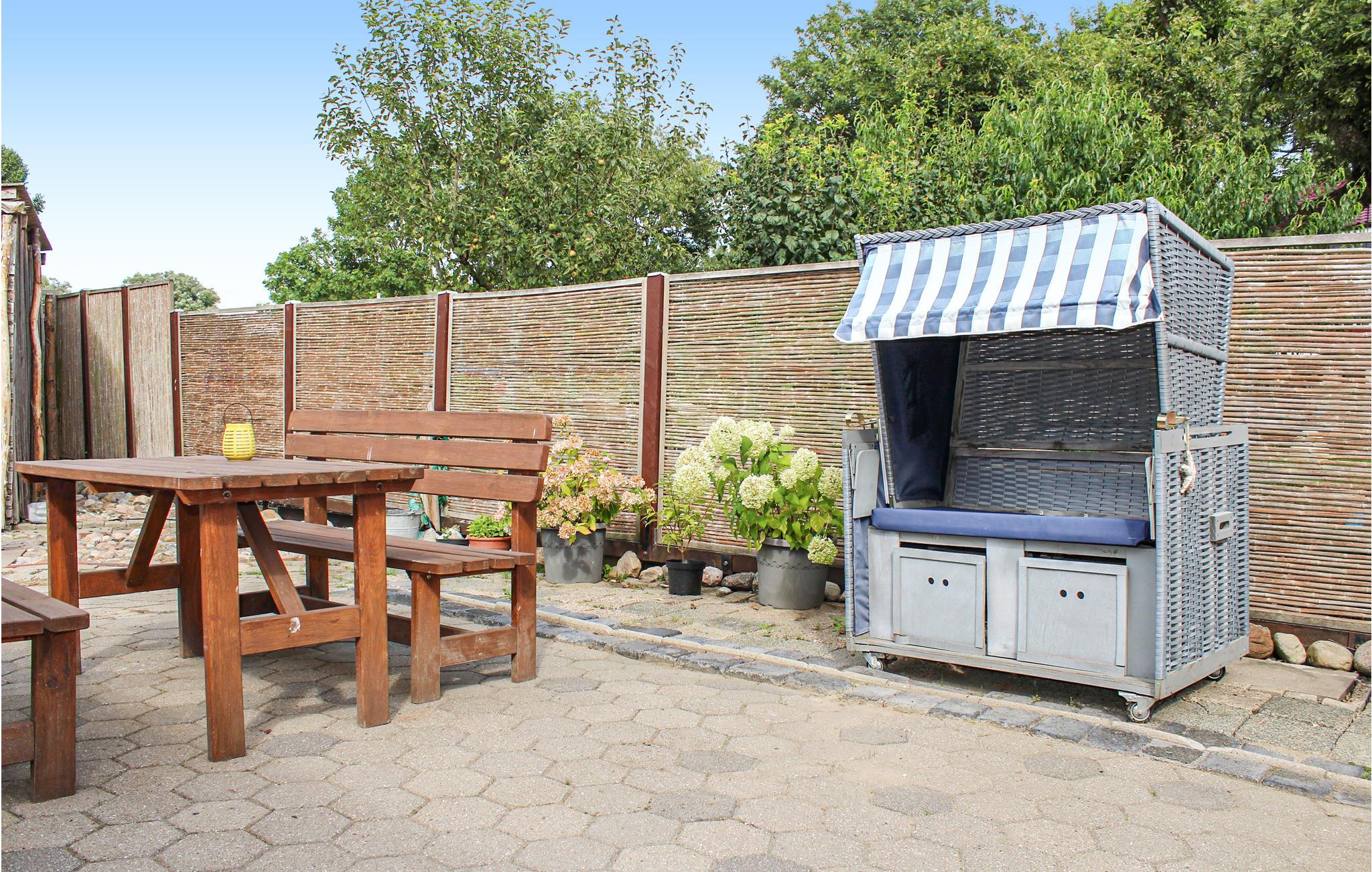 Neben der gemütlichen Wohnung haben Sie auch eine überdachte Terrasse zur eigenen Nutzung auf dem Grundstück. Ein Strandkorb lädt außerdem zu gemütlichen Stunden im Freien ein. Als Highlight gibt es eine Feuerstelle mit gemütlichen Stühlen, an der Sie Grillen oder Stockbrot machen können.