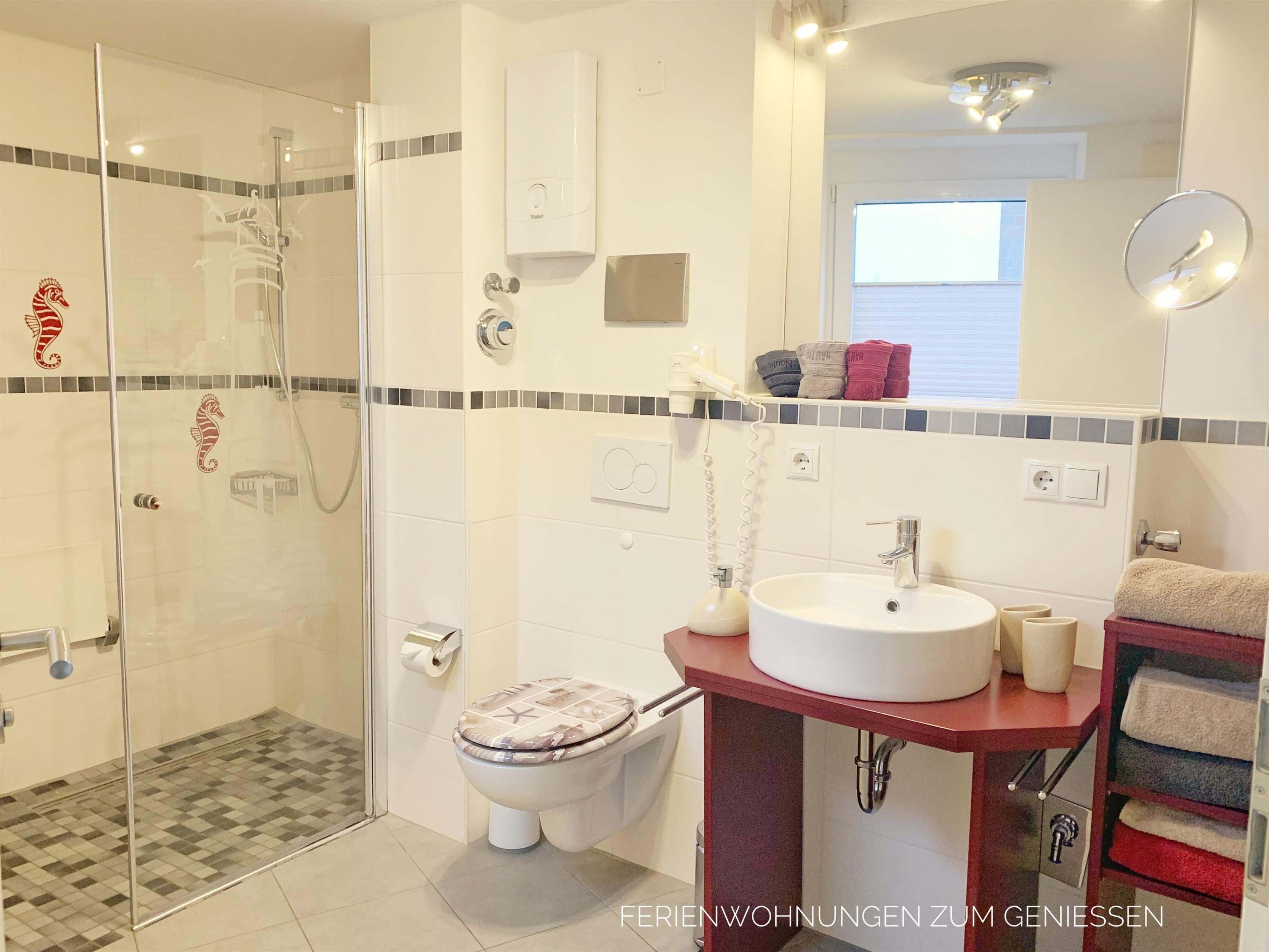 Im schicken Bad erwarten dich eine große, ebenerdige Dusche mit Wand-Sitz und eine Handtuchheizung für extra Komfort. Der offene Wohn- und Essbereich mit Flachbild-TV und Blu-ray-Heimkino lädt zum Entspannen ein - und von hier aus geht’s direkt auf die riesige Loggia, wo du die frische Meeresluft genießen kannst.