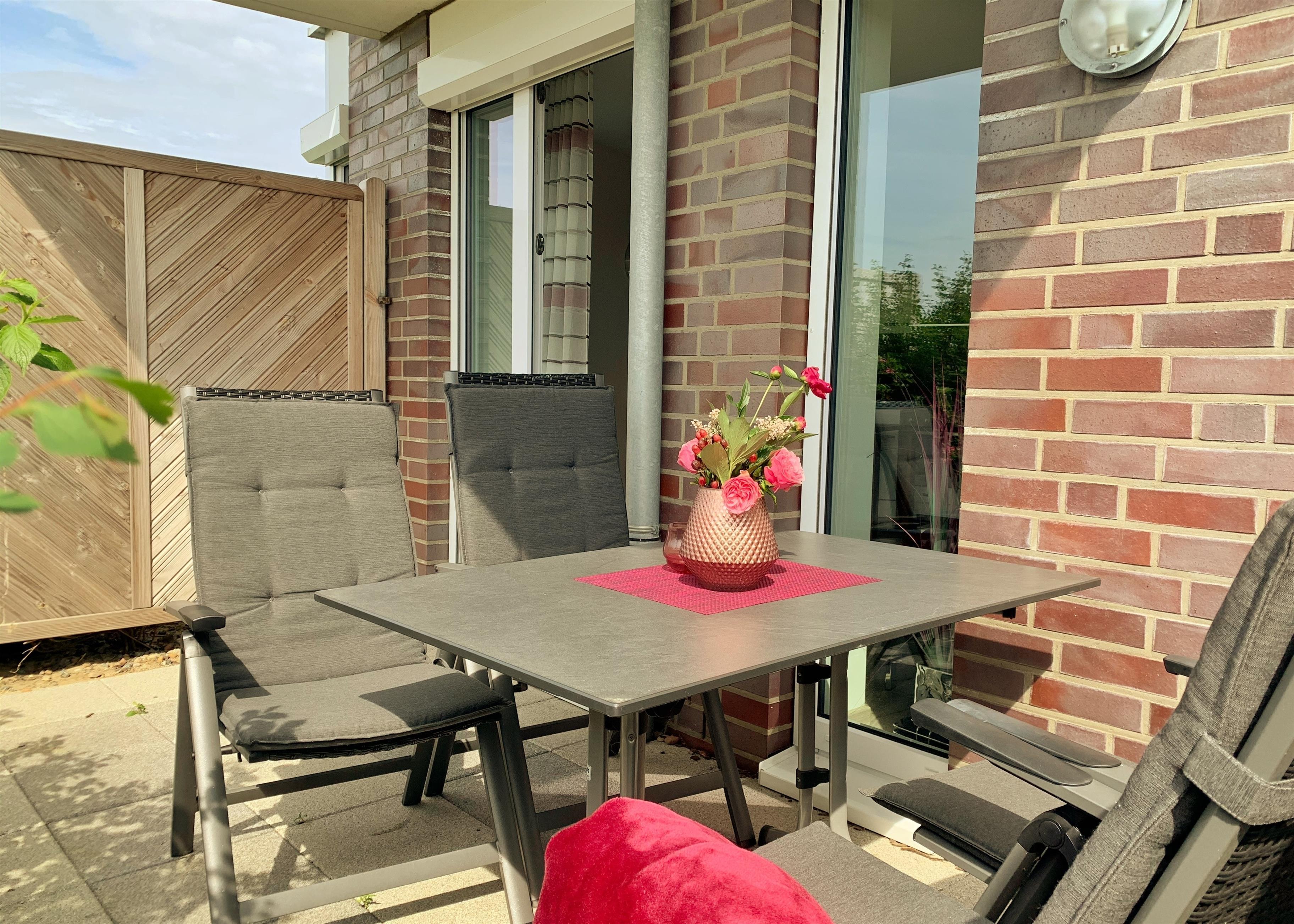 Gemütliche Ferienwohnung an der Nordsee mit Terrasse und Strandkorb, ideal für erholsame Tage am Meer.
