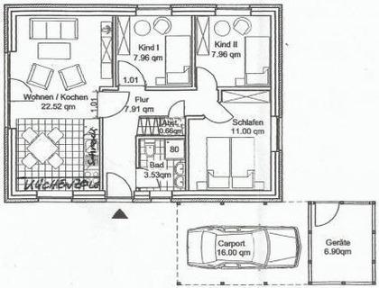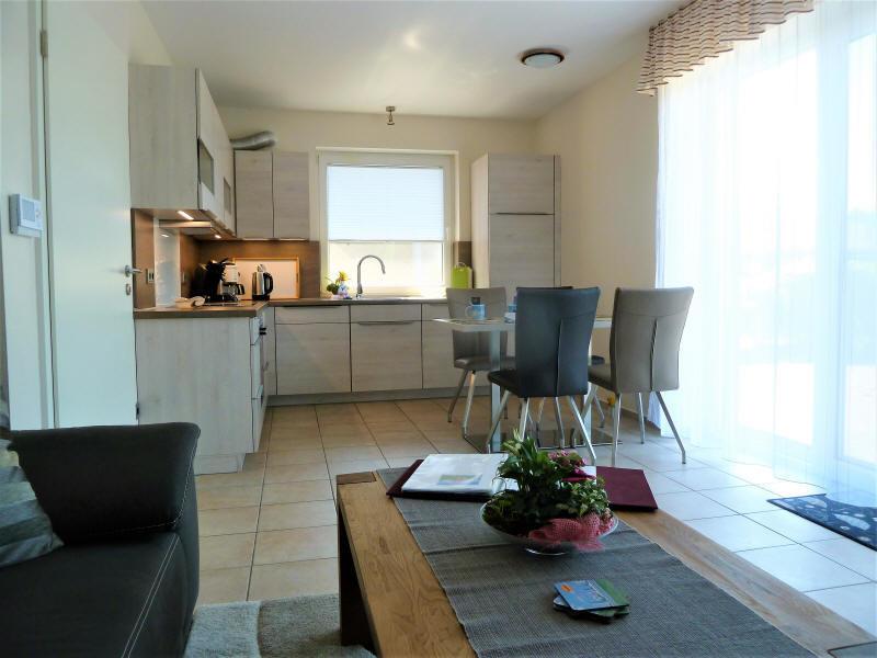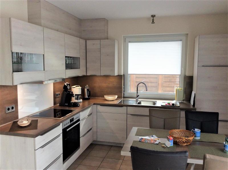Der Wohn- Essraum hat eine gemuetliche Einrichtung mit SAT TV. Die Kuechenzeile ist mit einem Cerankochfeld, Geschirrspueler, Backofen, Waschmaschine und Kuehlschrank mit Gefrierfach ausgestattet. Im Elternschlafzimmer befindet sich ein Doppelbett (160 cm x 200 cm) mit Kleiderschrank . der PKW steht im Carport