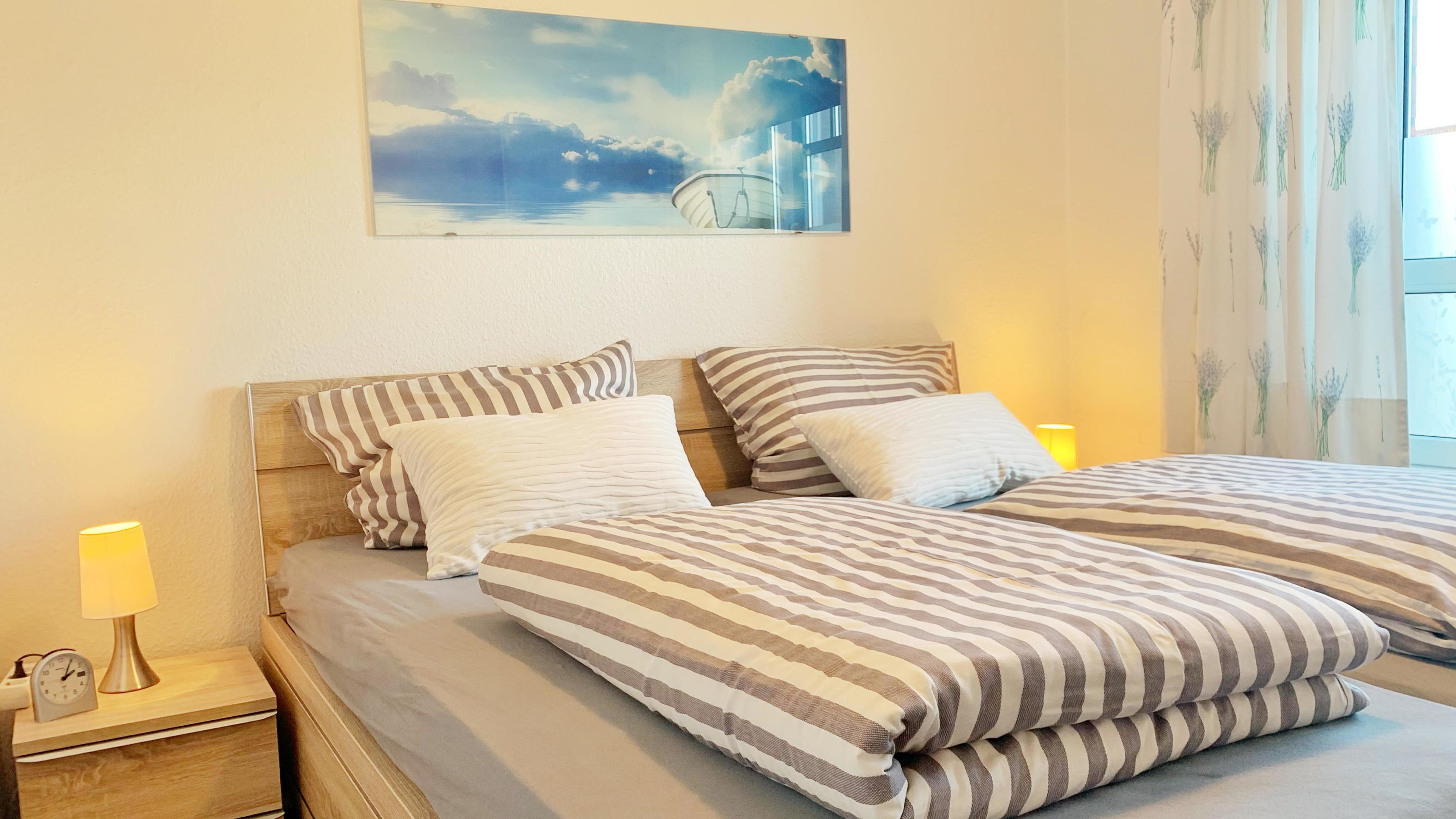 Ein Schlafzimmer mit Doppelbett und ein Kinderzimmer mit Hochbett (2m x 90 cm) bieten Platz für 4 Personen. Beide Schlafzimmer sind mit Kleiderschrank bestückt. Zusätzliche Decken und Kopfkissen auf Wunsch vorhanden. Terrassenbestuhlung vorhanden. Das helle Badezimmer verfügt über Badewanne und Dusche. Nichtraucherwohnung. PKW-Stellplatz vorhanden.