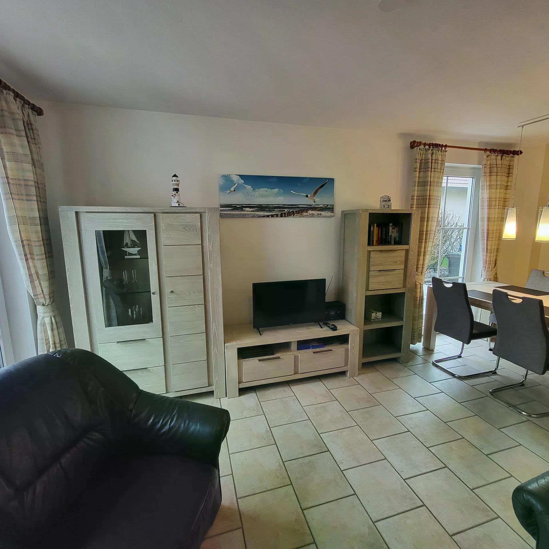 Im Erdgeschoss gibt es einen offenen Wohnbereich mit Flat-TV, Essplatz, komplett ausgestatteter Einbauküche mit Geschirrspüler und Waschmaschine sowie ein Gäste-WC. Vom Wohnraum aus geht es direkt auf die sonnige Terrasse.