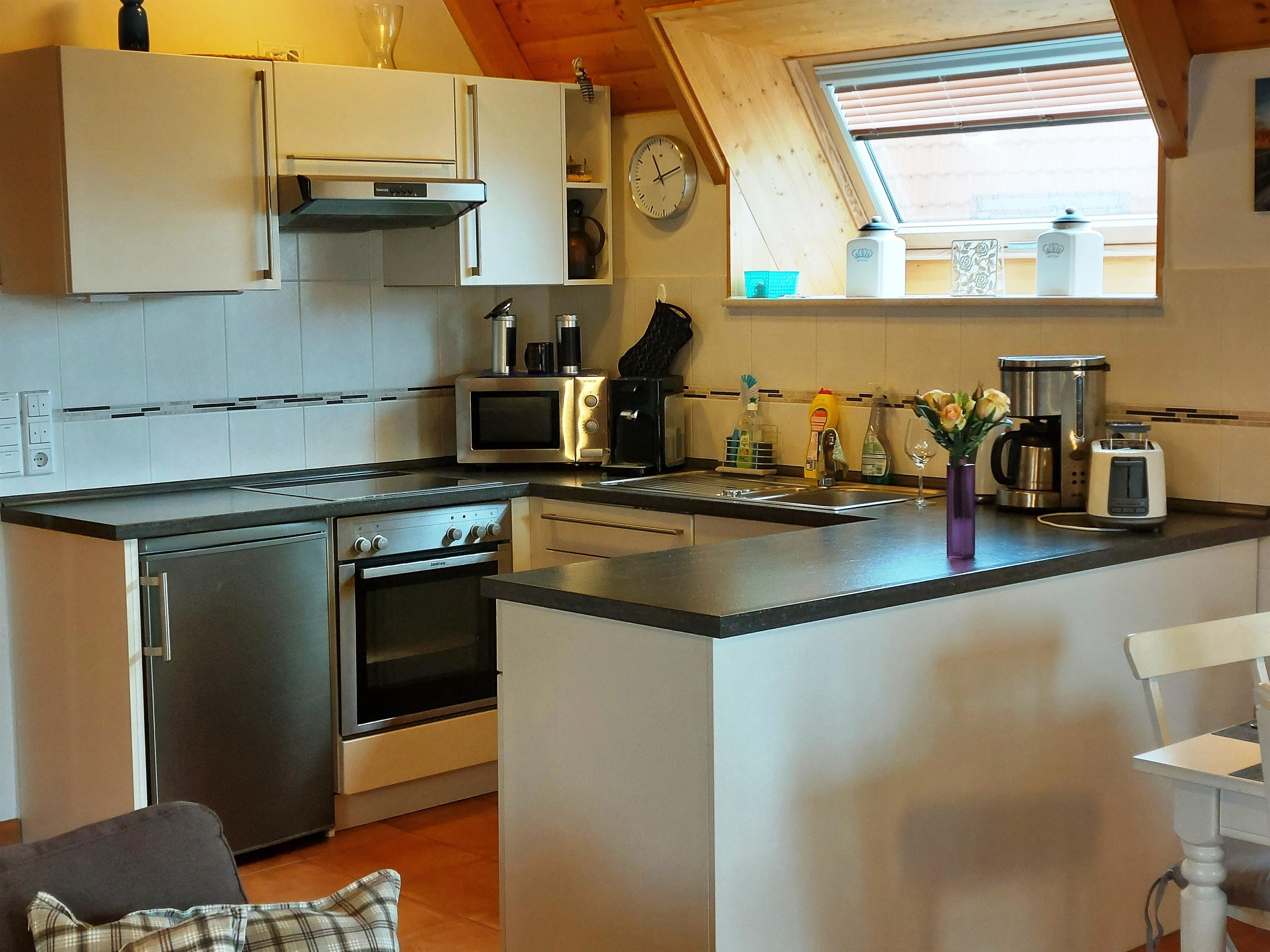 Das Ferienhaus bietet Platz für bis zu 6 Personen und ein Kleinkind im Reisebett. Die im Wohnzimmer integrierte Küche ist vollständig ausgestattet: