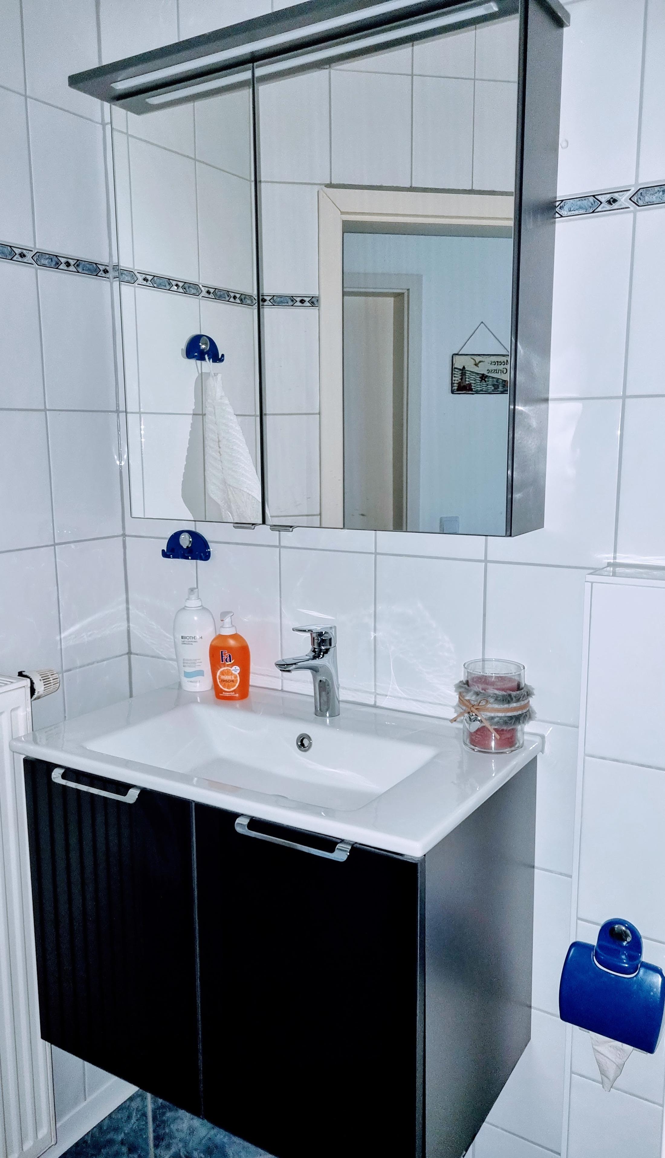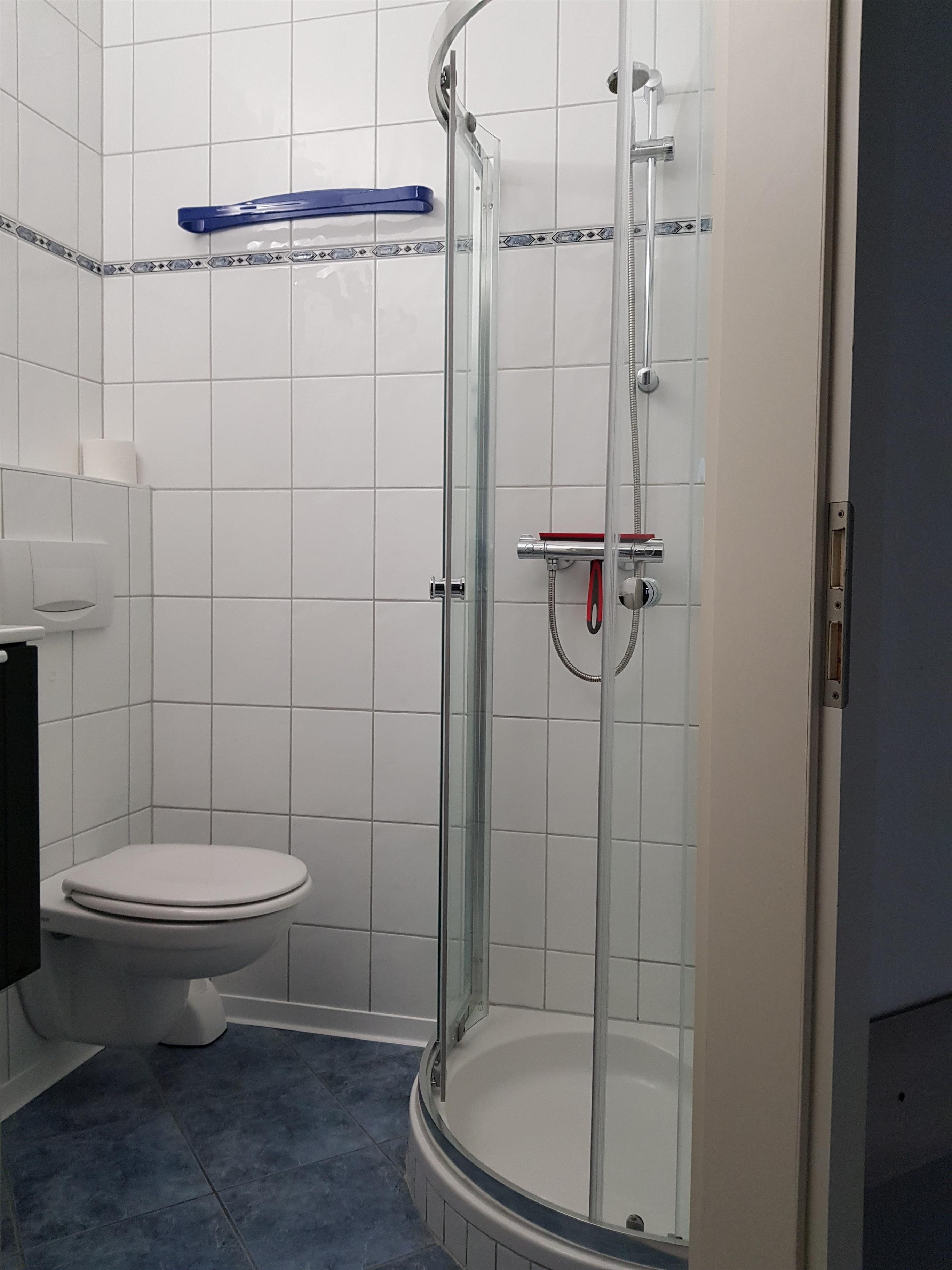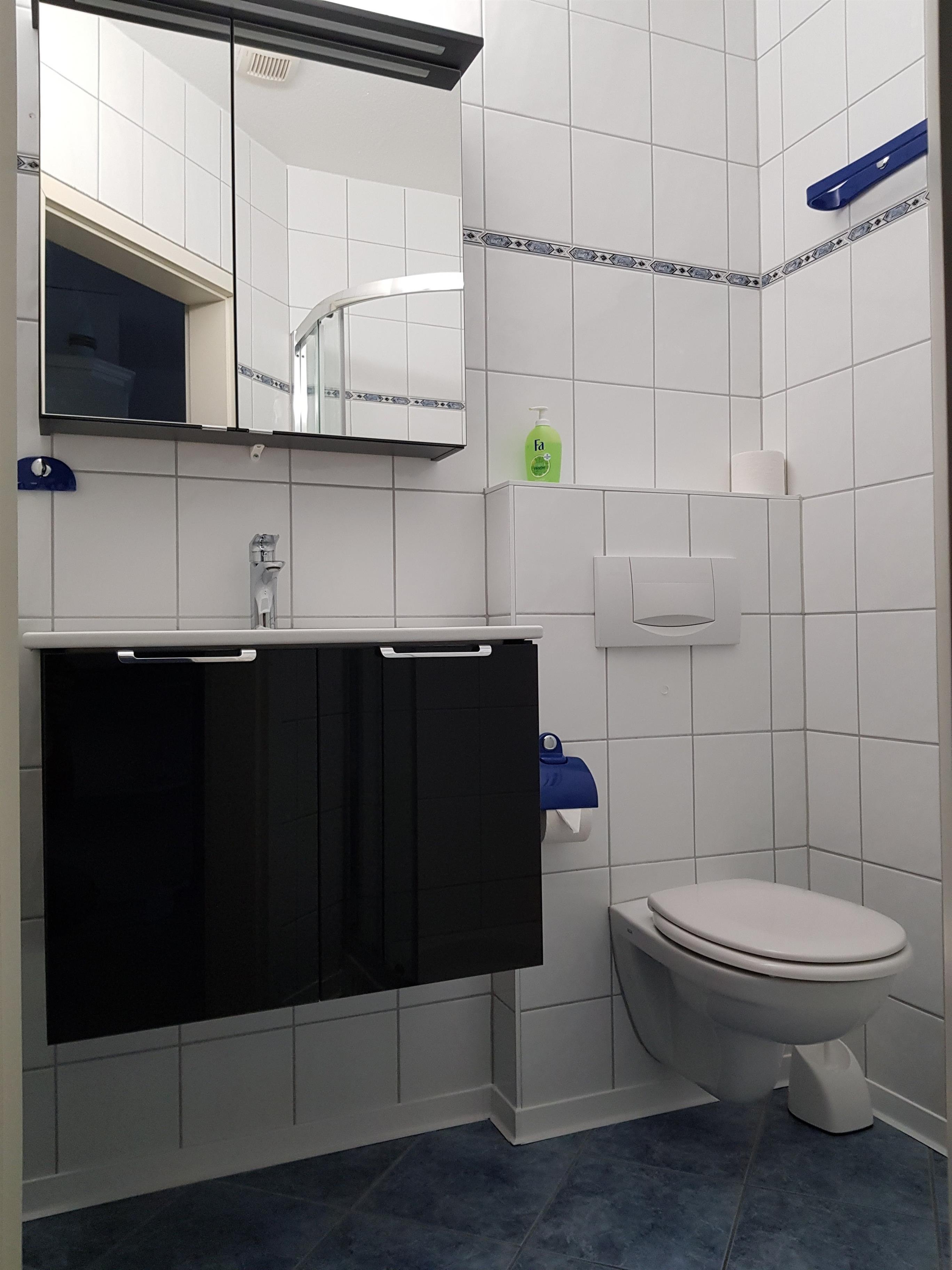 Im Bad sind Dusche, Waschtisch, WC und Spiegelschrank.