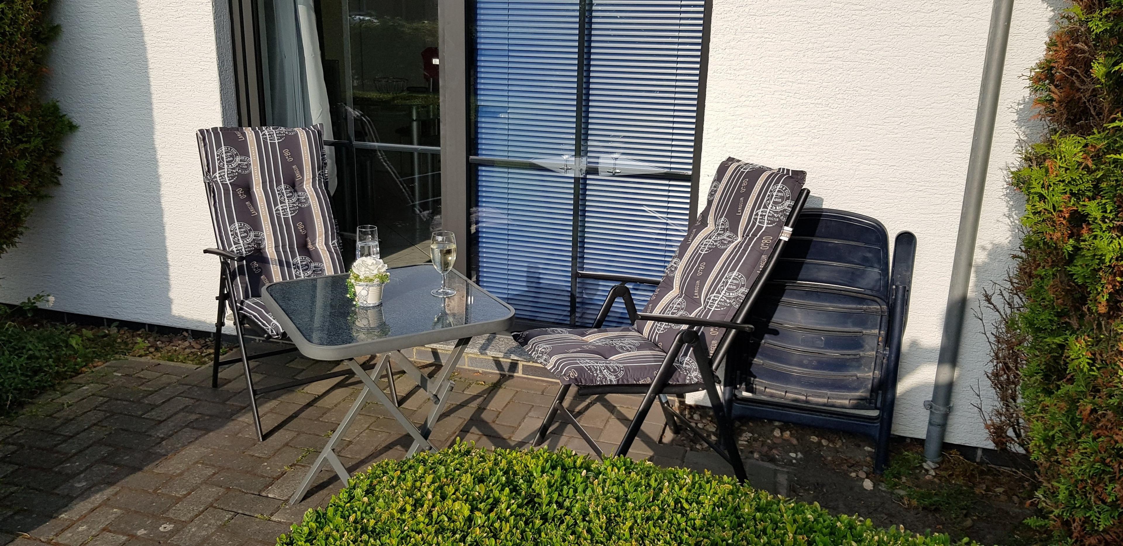 Auf der Südwest-Terrasse sind Sitzgelegenheiten, ein Sonnenschirm /Tisch vorhanden.