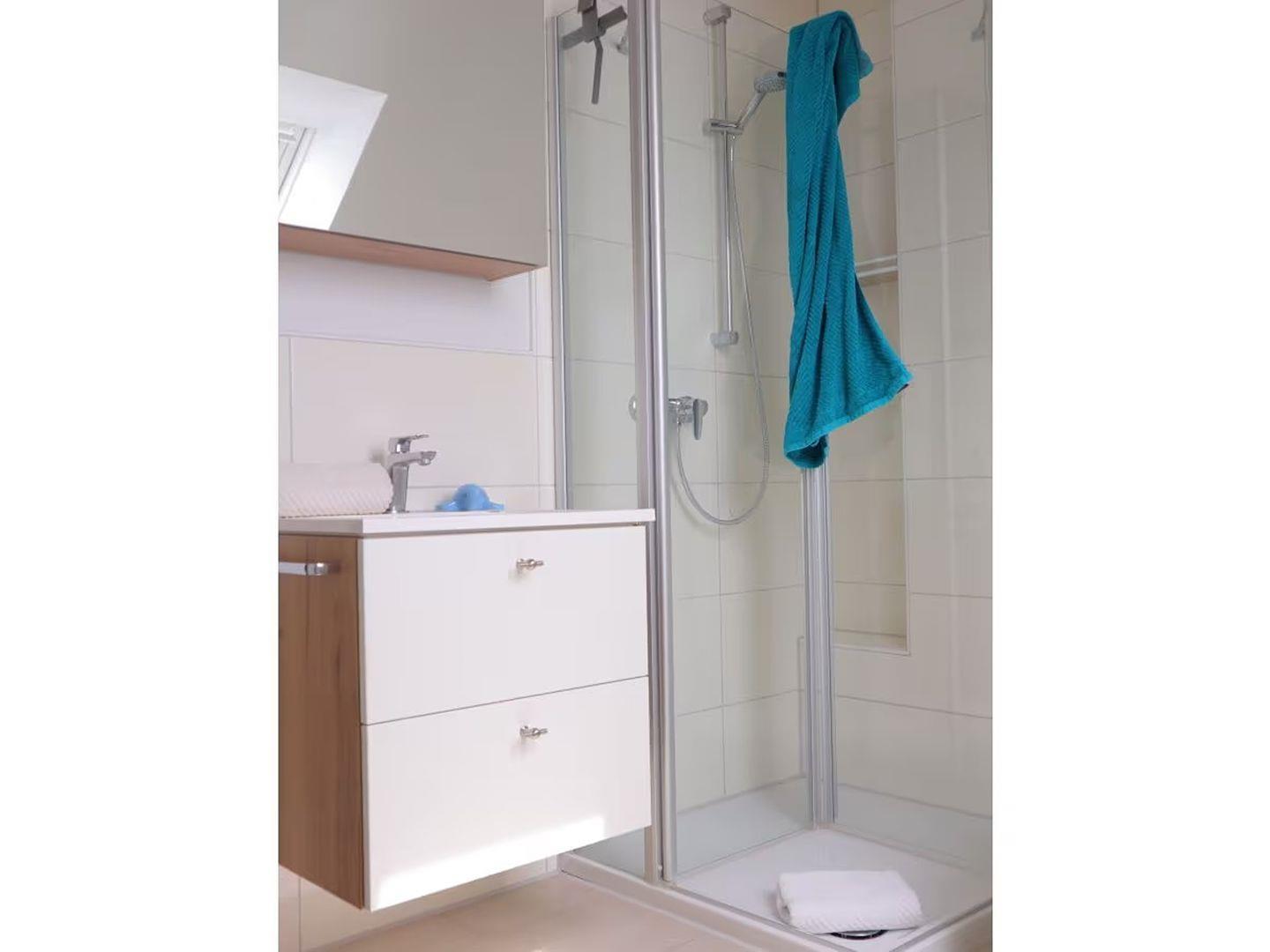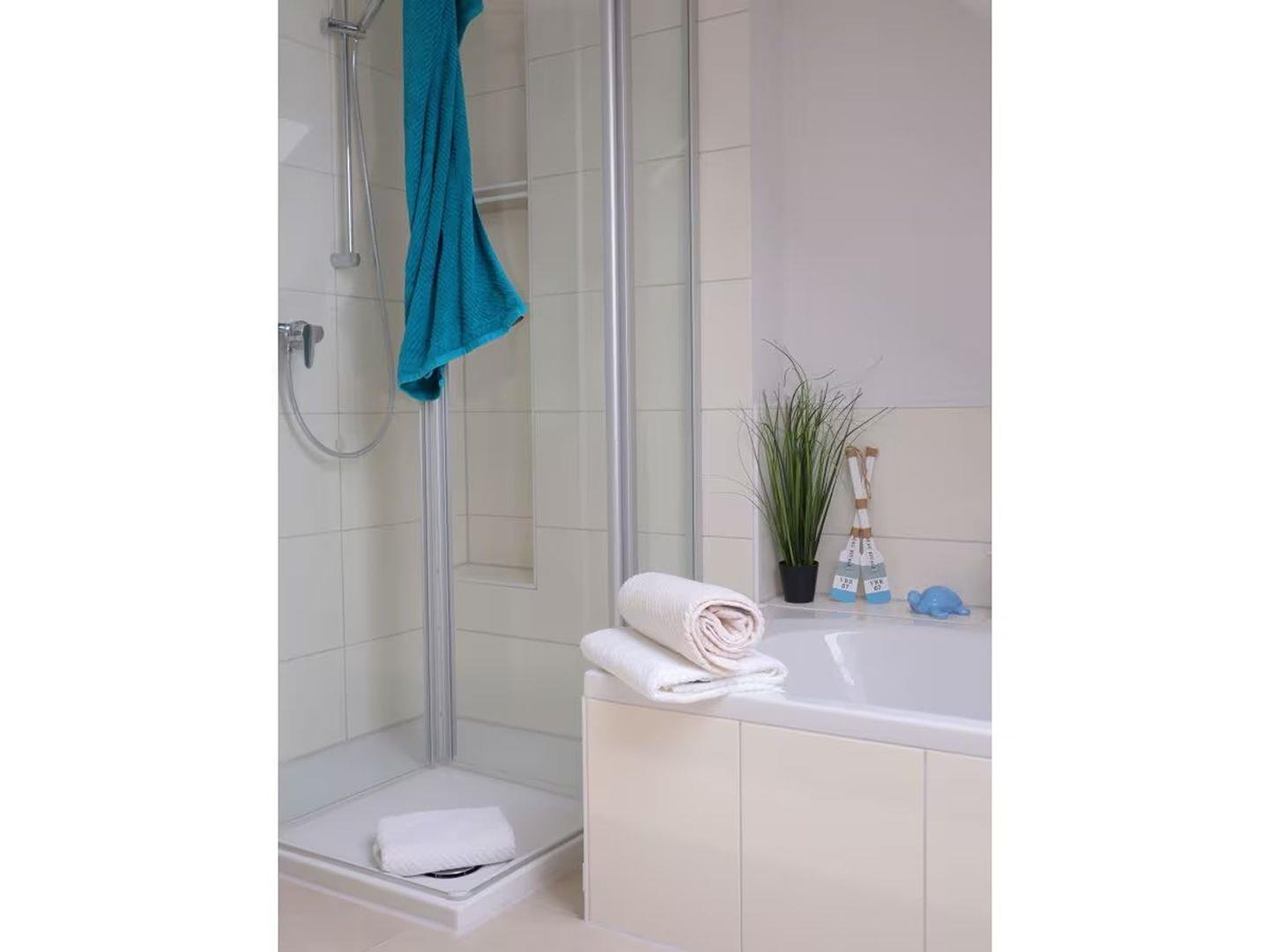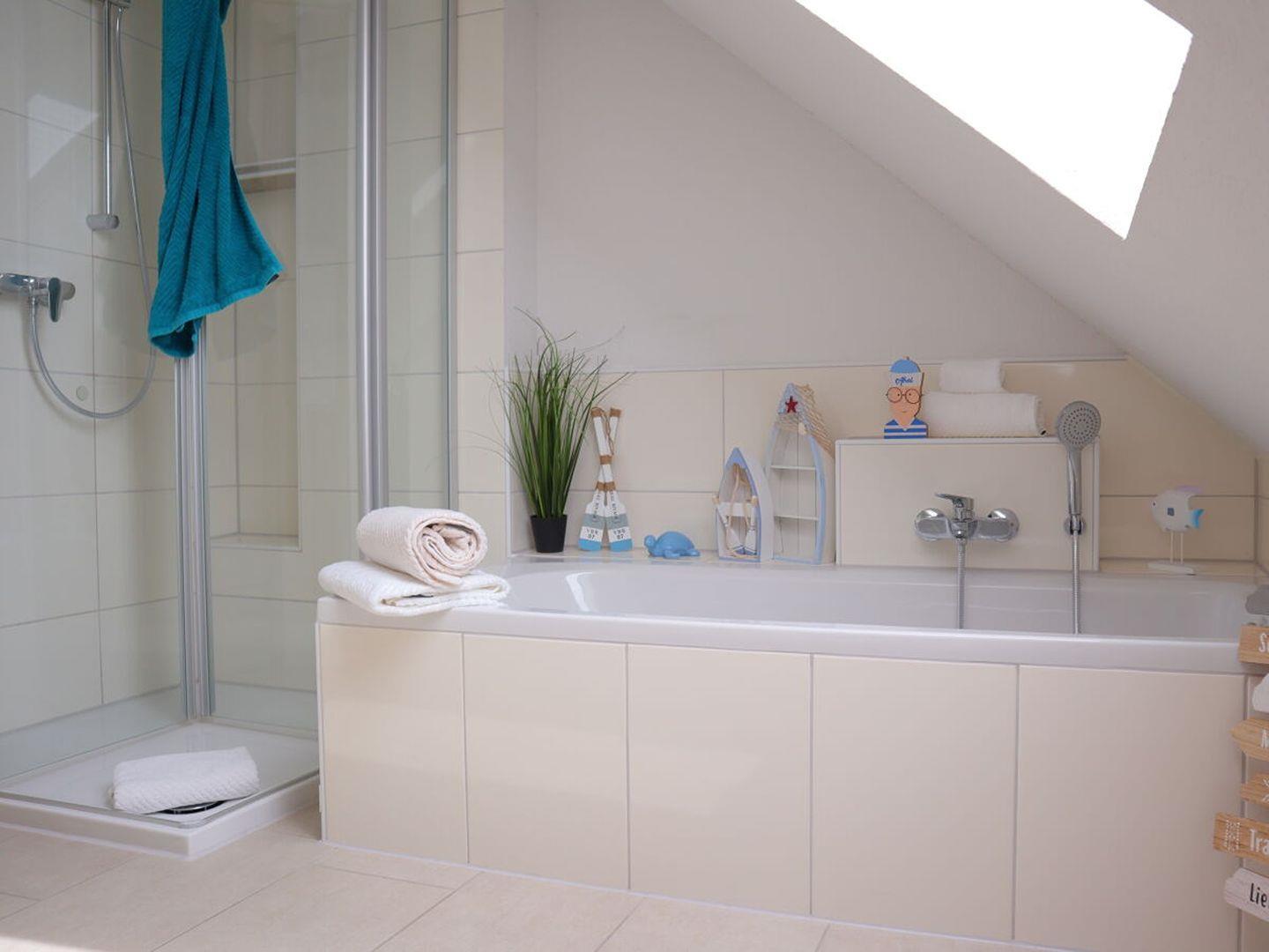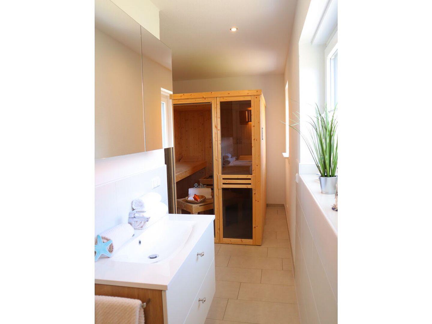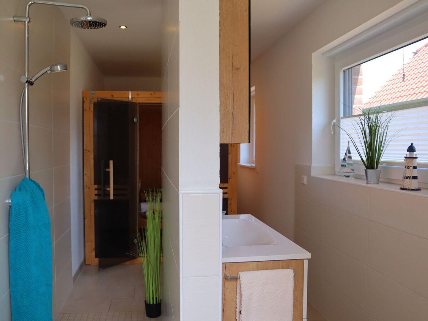 Das Badezimmer im Obergeschoss bietet sowohl eine Dusche als auch eine Badewanne, ideal für erholsame Bäder nach einem Tag voller Abenteuer an der Nordseeküste. Ein besonderes Highlight des Hauses ist die im Untergeschoss gelegene private Sauna, die zu entspannten Wellness-Momenten einlädt. Nach einem erfrischenden Saunagang können Sie unter der großen Regendusche Ihren Kreislauf wieder in Schwung bringen.