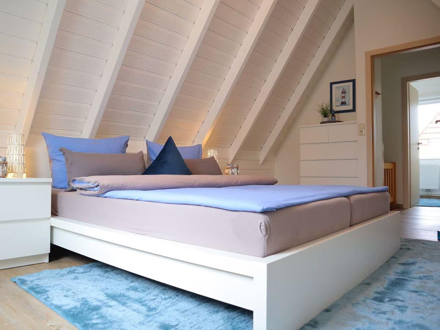 Im Obergeschoss finden Sie zwei einladende Schlafzimmer, die mit nordischem Charme und Komfort gestaltet sind und Platz für bis zu 4 Personen bieten. Die gemütliche Sofaecke mit einem Fernseher und einem einladenden Kaminofen lädt zu entspannten Stunden ein, sei es beim Lesen eines Buches oder beim gemeinsamen Spielen.