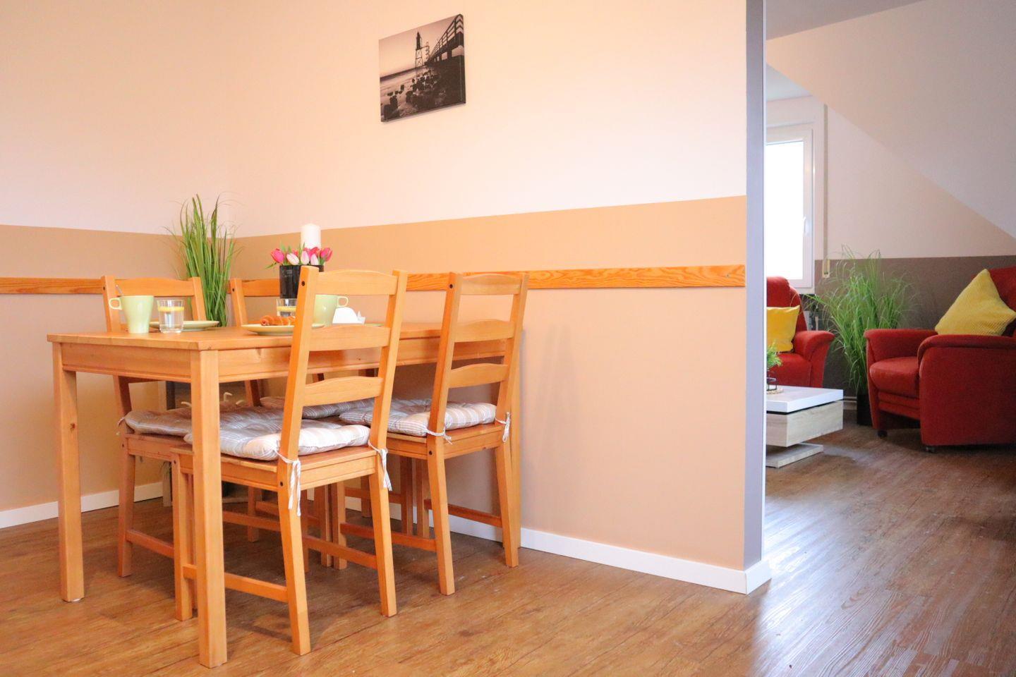 Die vollausgestattete Küche lädt zu kulinarischen Abenteuern ein, während Sie im Essbereich die Aussicht auf den grünen Deich genießen können – mit spektakulären Sonnenuntergängen als Bonus!