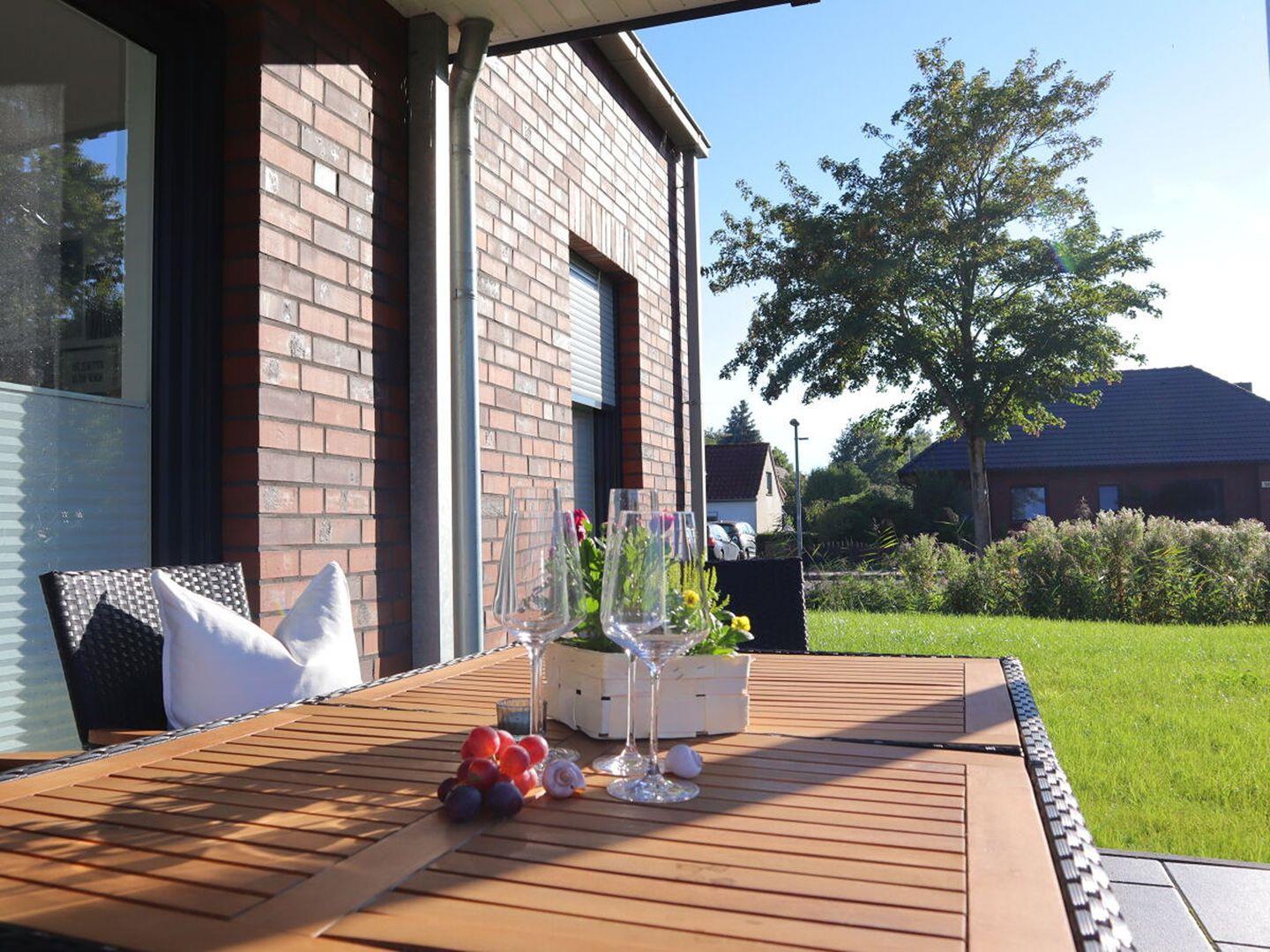 Die moderne Ferienwohnung Wat Mutt an der Nordseeküste bietet Komfort, eine Infrarotsauna und eine sonnige Terrasse für erholsame Urlaubstage.