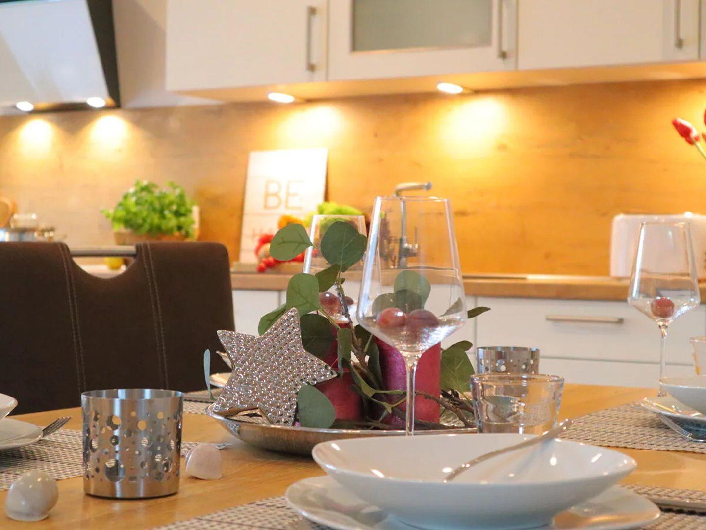 Im Erdgeschoss eines Zweifamilienhauses erwartet Sie ein gemütlicher Wohn- und Essbereich mit vollausgestatteter Küche und Zugang zur Sonnenterrasse. Die drei Schlafzimmer sind mit zwei Doppelbetten und zwei Einzelbetten ausgestattet. Zwei Badezimmer sorgen für Komfort und eine private Infrarotsauna im Schlafzimmer bietet besondere Entspannung. Für größere Gruppen steht die benachbarte Ferienwohnung „Dat Mutt“ zur Verfügung.