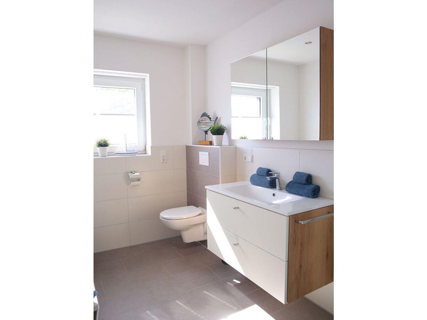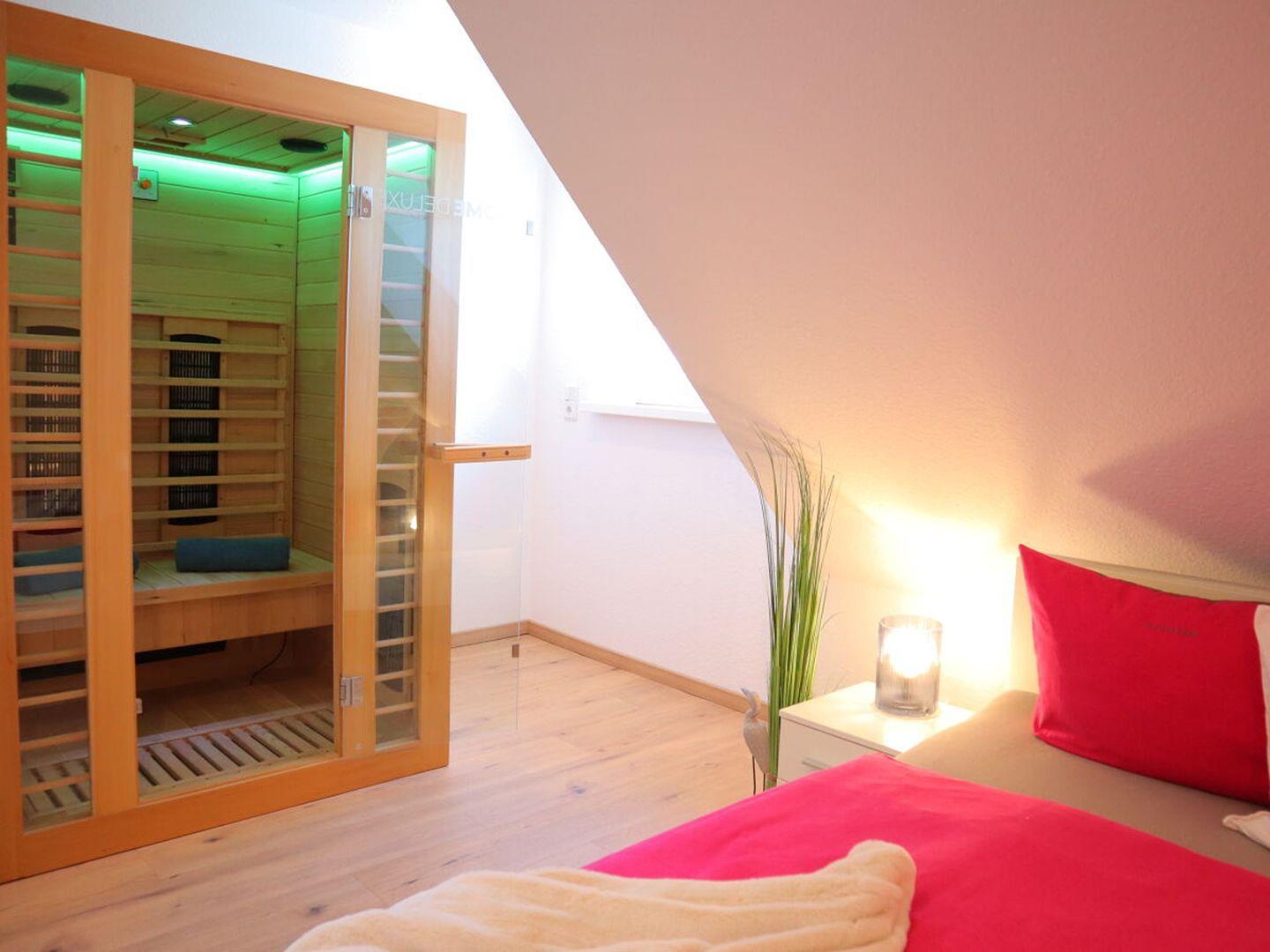 Das Badezimmer verwöhnt mit Dusche und Badewanne für entspannende Momente. Ein besonderes Highlight ist die private Infrarotsauna in einem der Schlafzimmer.