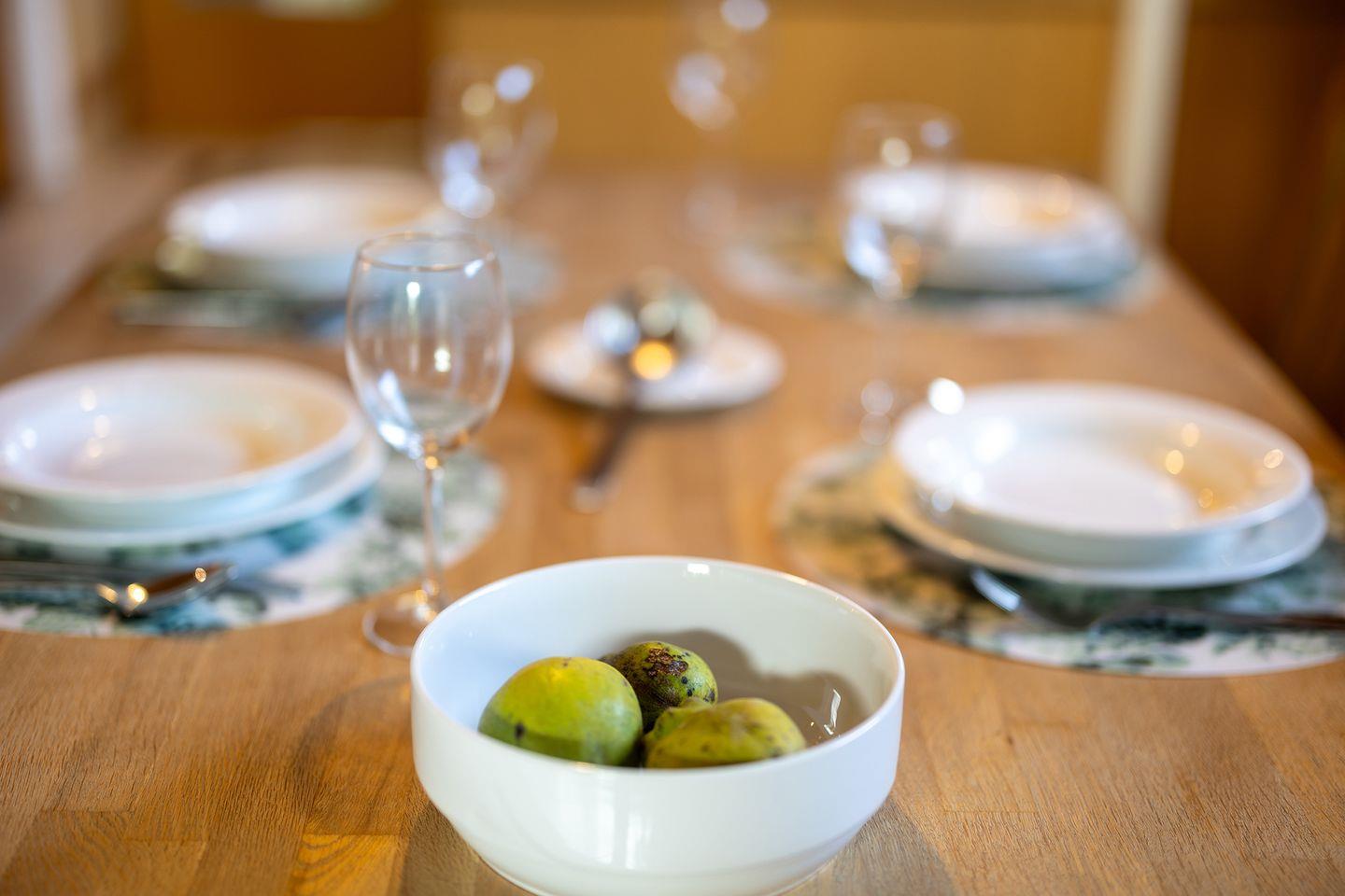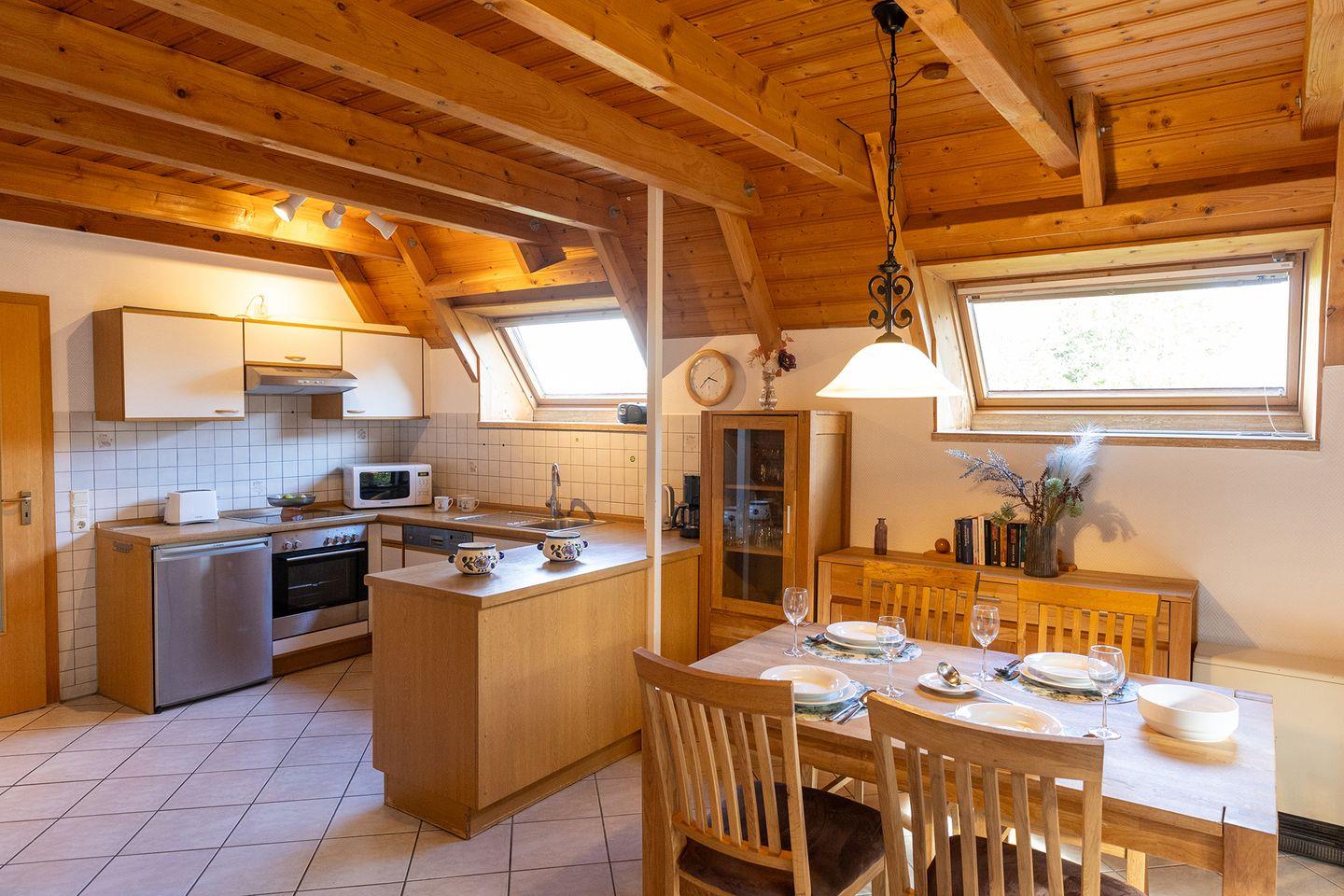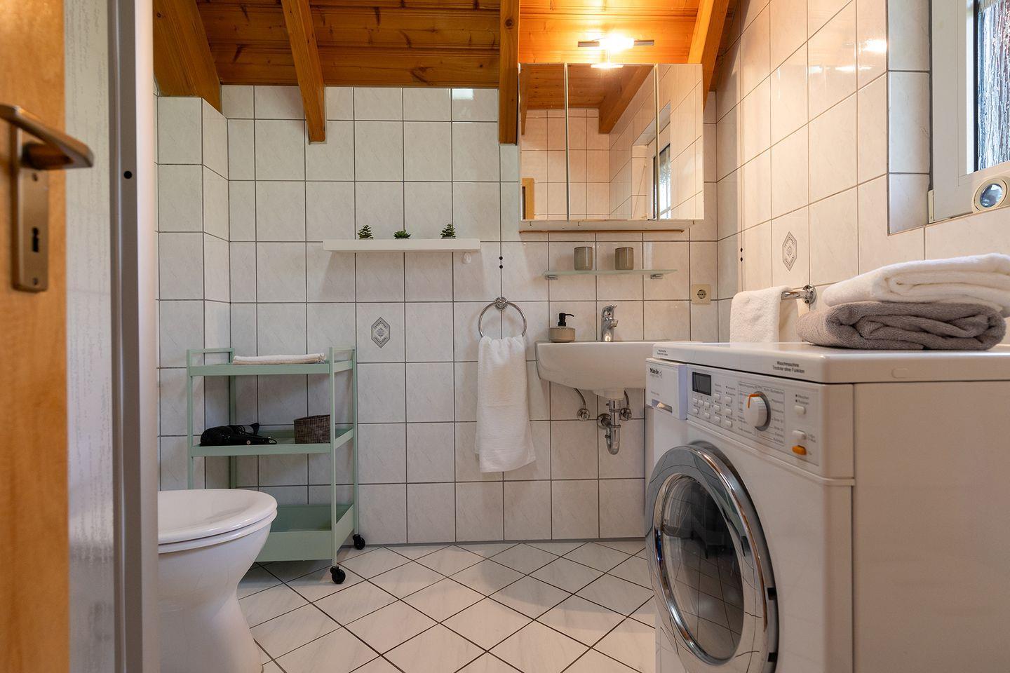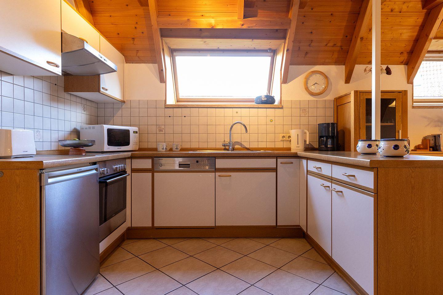 Die offene Küche ist voll ausgestattet mit Spülmaschine, Ceranfeld, Mikrowelle, Kaffeemaschine und allem, was man für den Alltag braucht. WLAN, Telefon und Fliegengitter sind ebenfalls vorhanden. Für kleine Gäste stehen Kinderbett, Hochstuhl und Treppengitter bereit. Das Haus ist rundum familienfreundlich. Eine eigene Waschmaschine macht den Aufenthalt auch bei längeren Ferien unkompliziert.