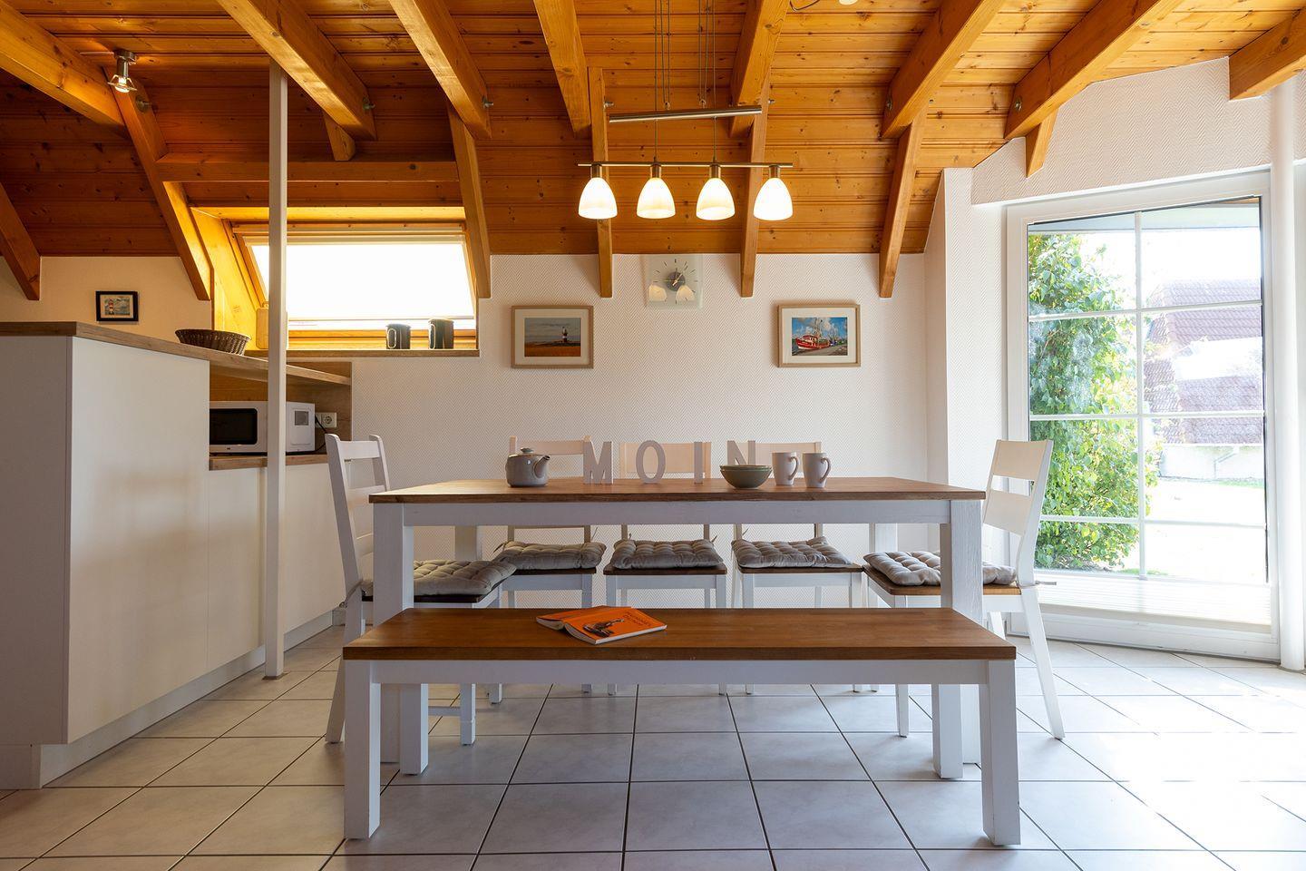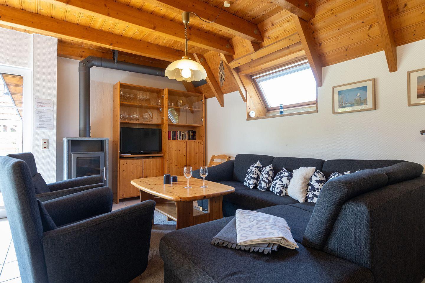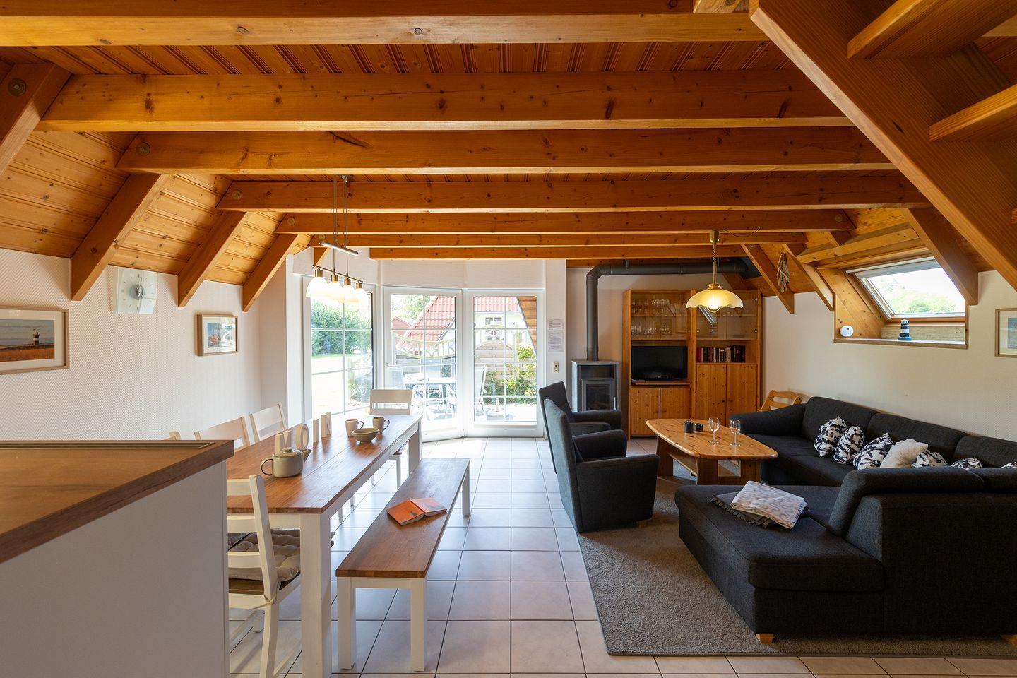 Auf zwei Etagen und 68?m² Wohnfläche gibt es zwei Schlafzimmer, ein Badezimmer mit Wanne und Dusche, ein Gäste-WC und einen offenen Wohnbereich mit Kaminofen und gut ausgestatteter Küche. Für den Nordseeurlaub mit Kindern sind Hochstuhl, Kinderbett, Treppengitter und Waschmaschine vorhanden.