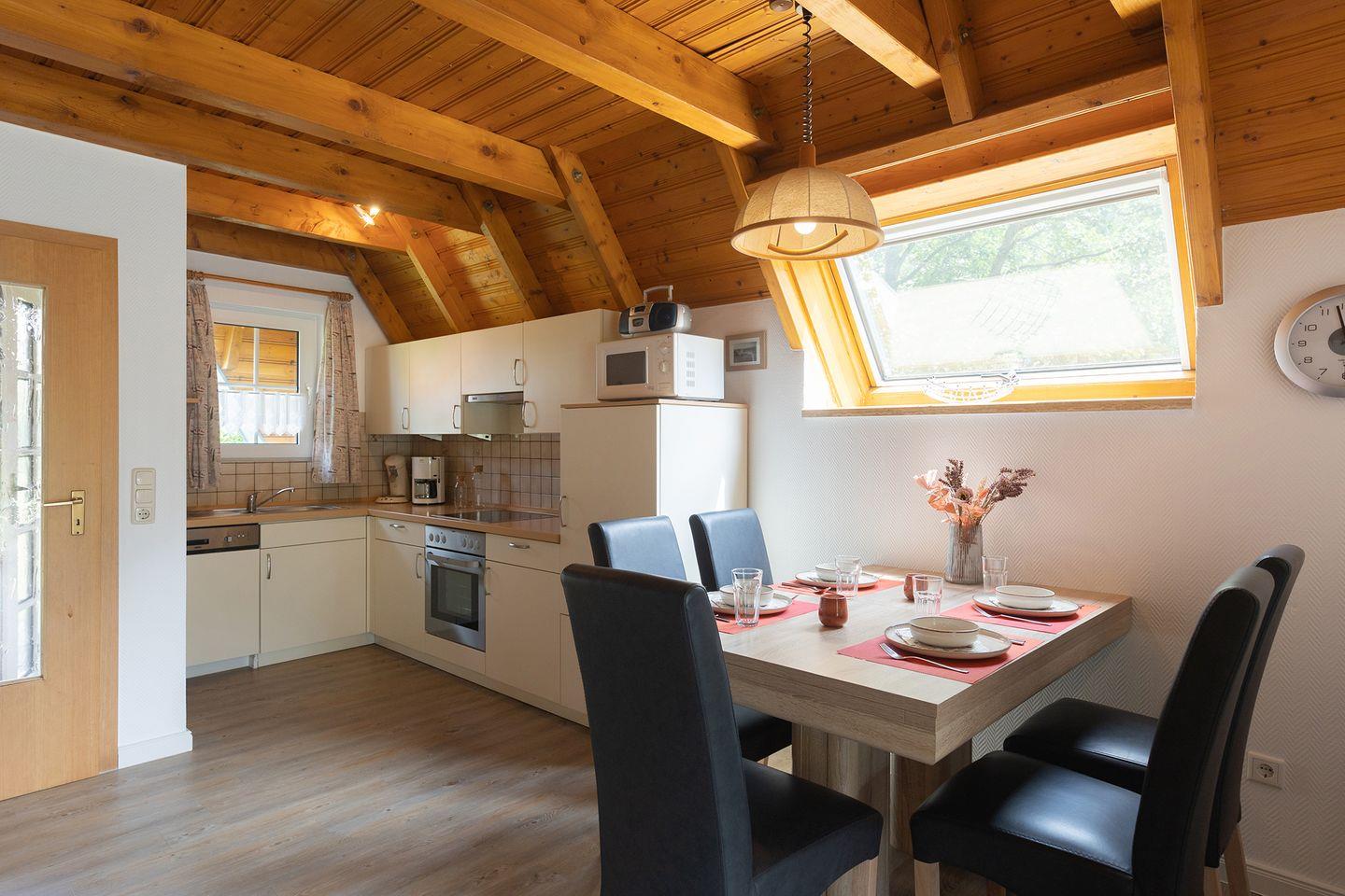 Zwei Schlafzimmer mit Laminat, ein heller Wohnbereich mit Sofaecke, Kabel-TV und Spielen – ideal für entspannte Abende. Die offene Küche ist vollständig ausgestattet, von Ceranfeld über Spülmaschine bis zum Eierkocher. Im Duschbad gibt es eine Waschmaschine, dazu ein Gäste-WC. Kinderbett, Hochstuhl, Treppengitter und Steckdosensicherungen sind vorhanden.