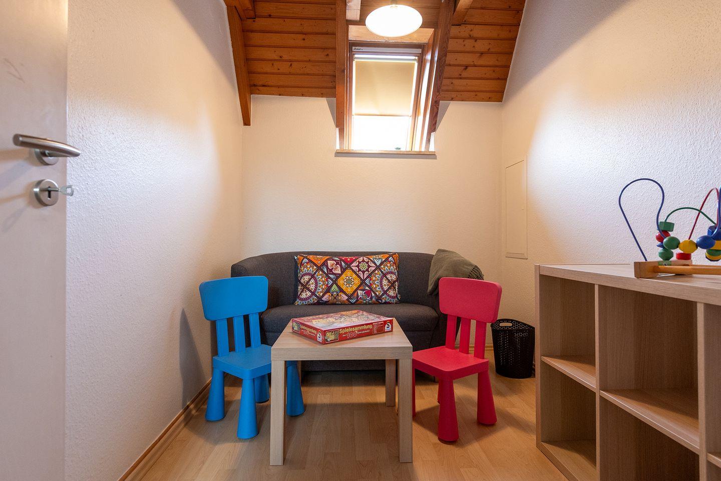 Für kleine Gäste stehen Kinderbett und Hochstuhl bereit. Draußen gibt’s Platz zum Spielen, eine möblierte Terrasse und einen Garten, der zum Durchatmen einlädt. Einfach raus, barfuß über den Rasen: Urlaub eben.