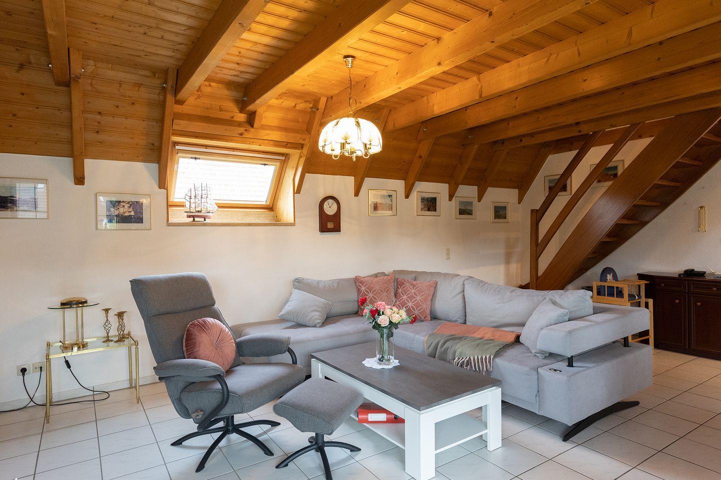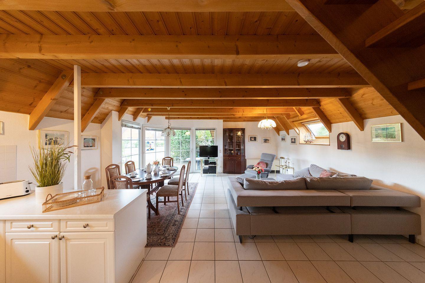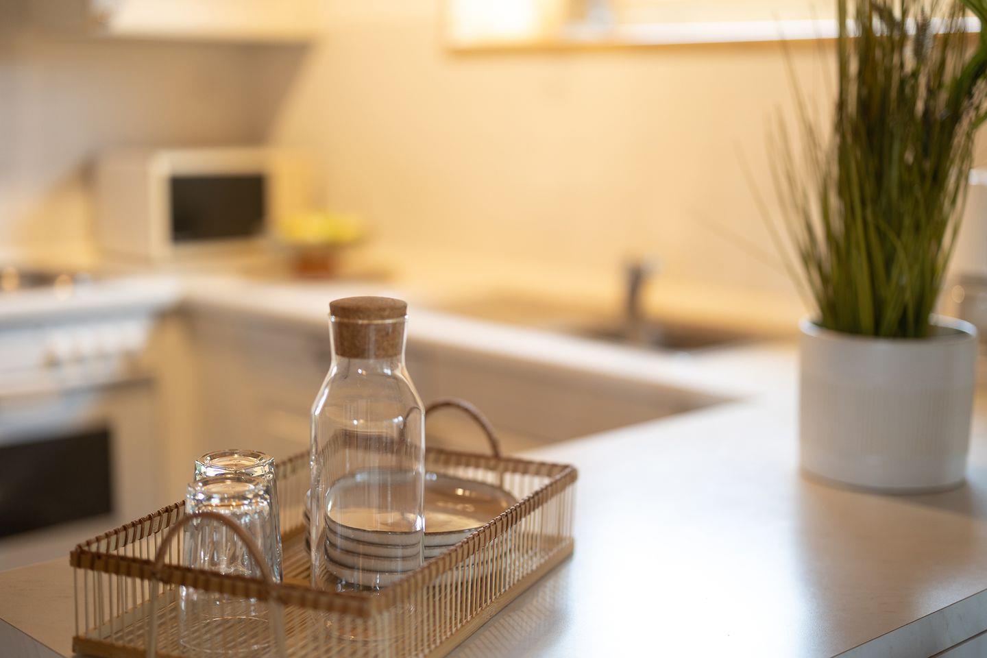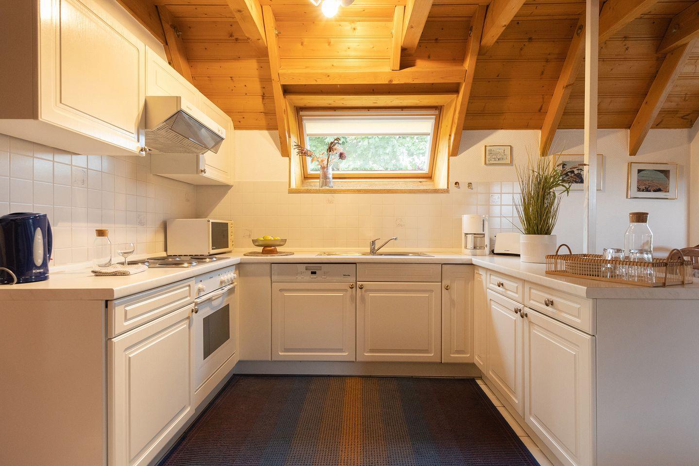 Die offene Küche ist gut ausgestattet: Ceranfeld, Spülmaschine, Mikrowelle, Backofen, Kühlschrank mit Gefrierfach und viele praktische Küchenhelfer machen Selbstversorgung einfach. Auch Waschmaschine, Trockner (gemeinschaftlich) und WLAN gehören zur Ausstattung.