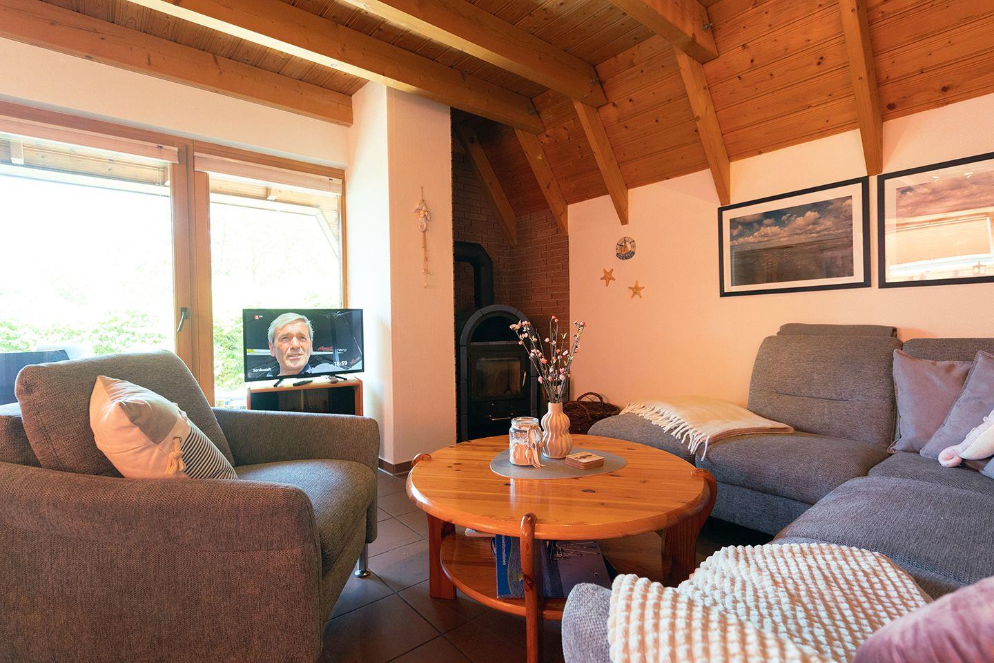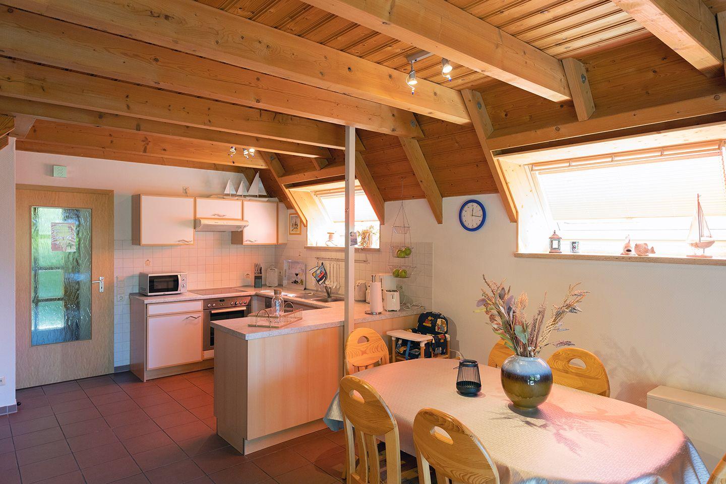 Wenn morgens die ersten Sonnenstrahlen durchs Fenster blitzen und der Duft von frischen Brötchen in der Luft liegt, ist klar: Der Nordseeurlaub mit Kindern hat begonnen. Dieses Ferienhaus für Familien an der Nordsee bietet mit 68?m² Raum für bis zu sechs Personen. Im Erdgeschoss findest du ein großzügiges Wohn-Esszimmer mit gemütlicher Wohnlandschaft, Kaminofen und großem Esstisch sowie eine offene, voll ausgestattete Küche. Das Tageslichtbad mit Fußbodenheizung ist mit Dusche, WC und Waschmaschine ausgestattet - praktisch für Familienalltag und Strandabenteuer.