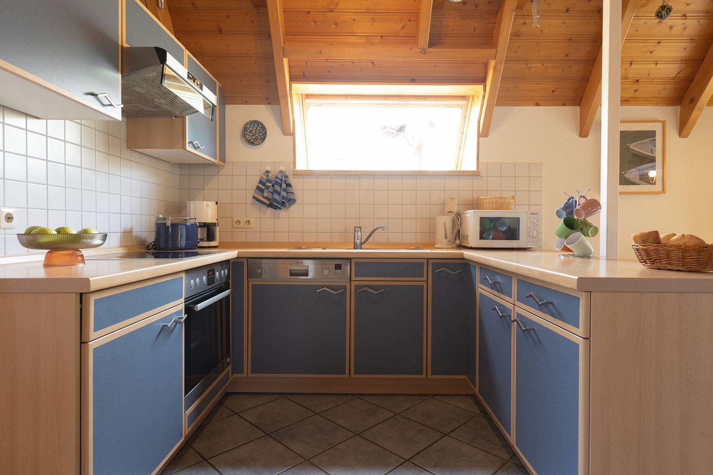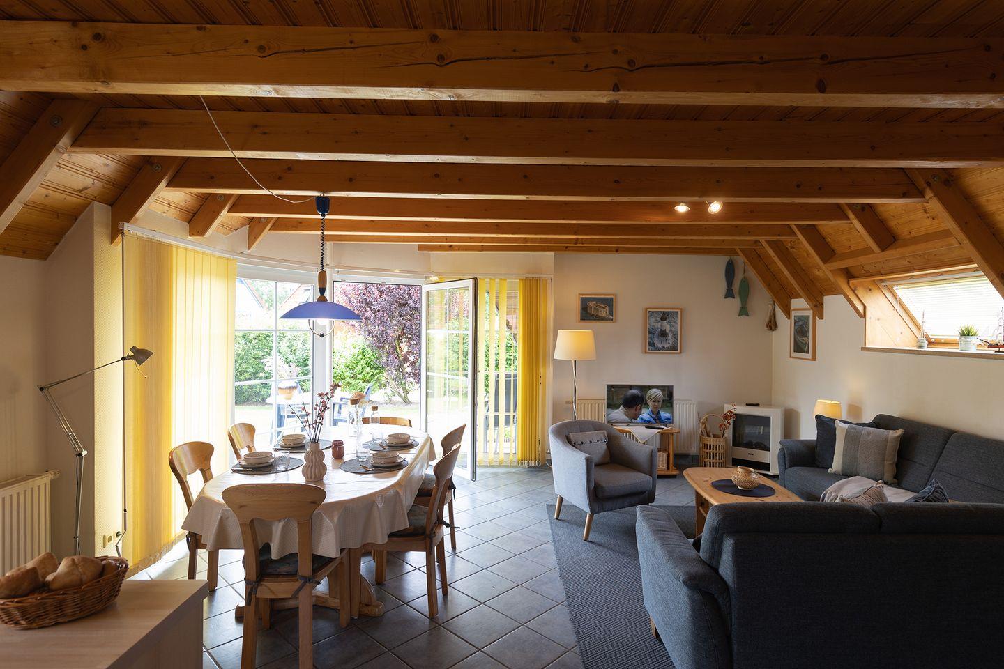 Der offene Wohnbereich mit Kaminofen, Fliesenboden und Sofaecke ist der Mittelpunkt des Hauses. Die gut ausgestattete Küche mit Ceranfeld, Spülmaschine, Mikrowelle und vielem mehr schließt direkt an. Zwei Schlafzimmer mit Teppich sorgen für Rückzugsmomente, das Bad mit Dusche und Wanne sowie ein zusätzliches Gäste-WC bringen Komfort in den Alltag.