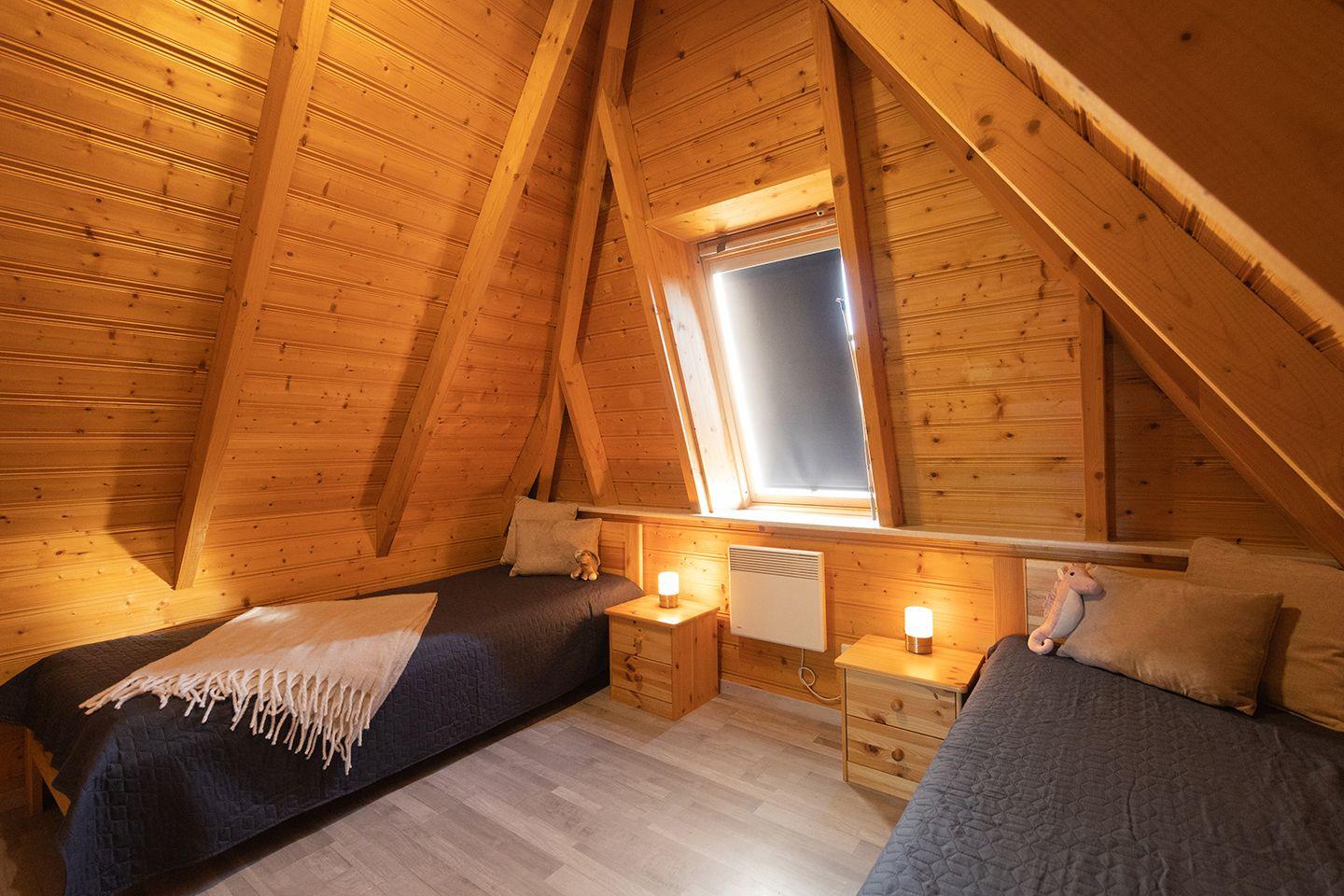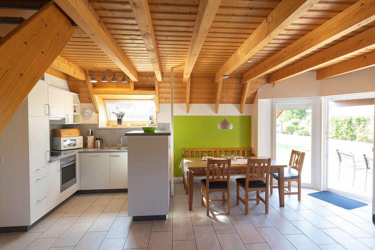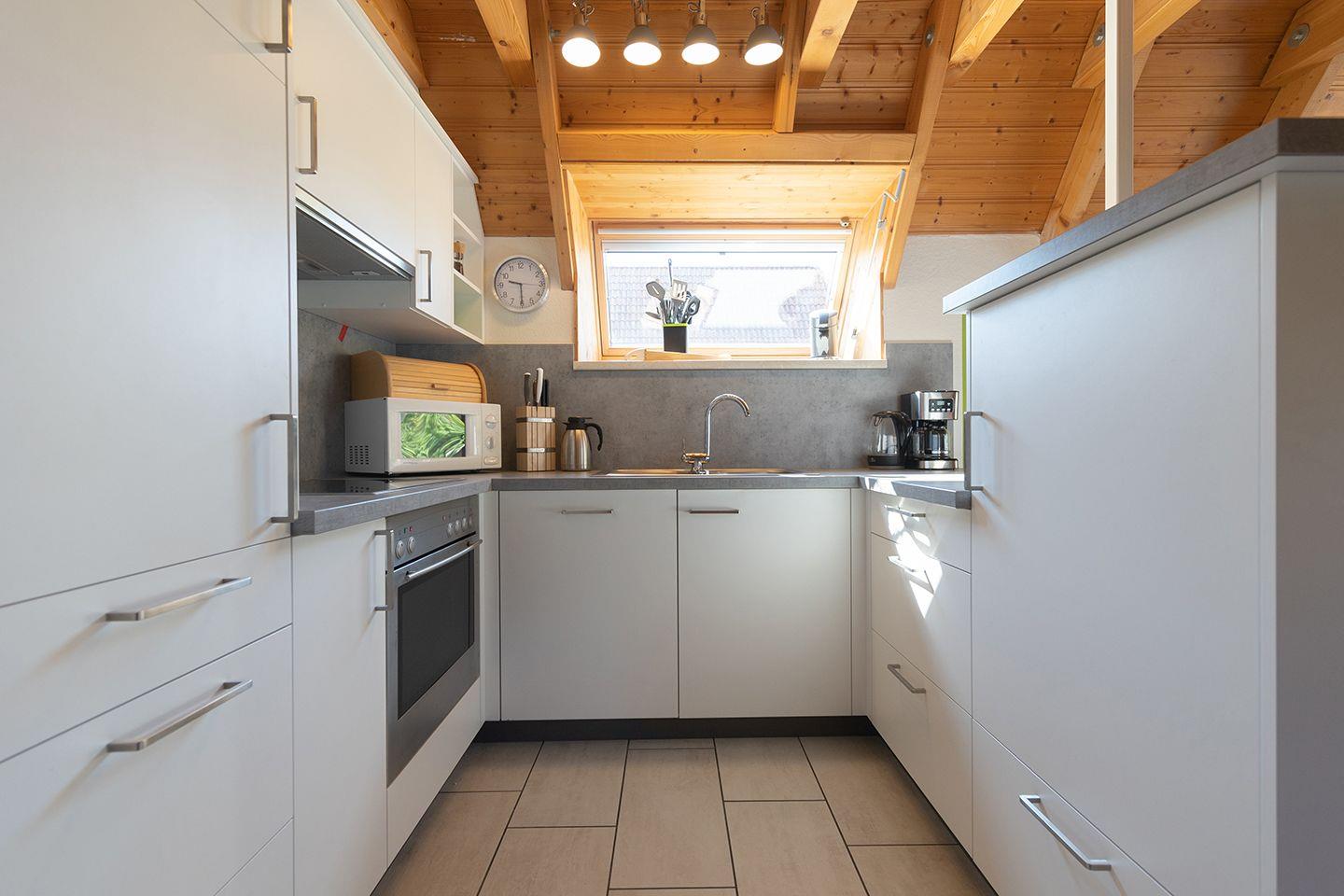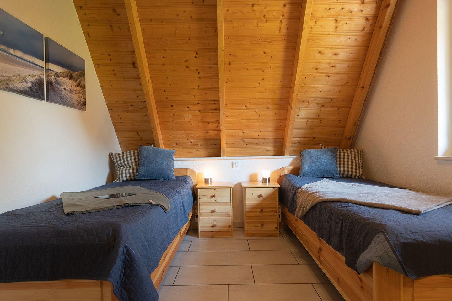 Ein Doppelbett oben, getrennte Betten in beiden weiteren Zimmern - kindgerecht und praktisch. Im Erdgeschoss: ein offener Wohn-Essbereich mit voll ausgestatteter Küche, dazu ein Bad mit Dusche. Laminat und Fliesen halten dem Nordseealltag stand.