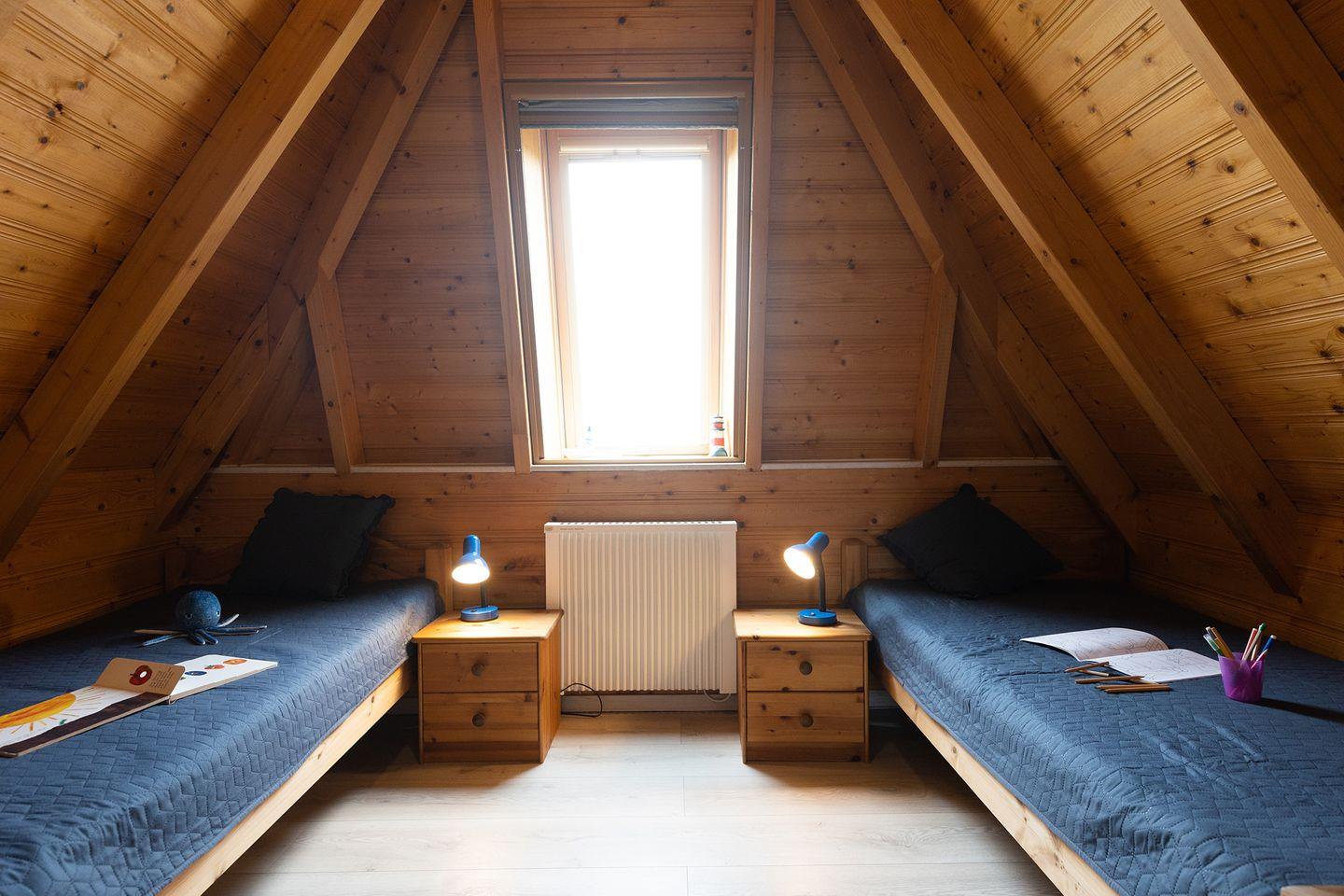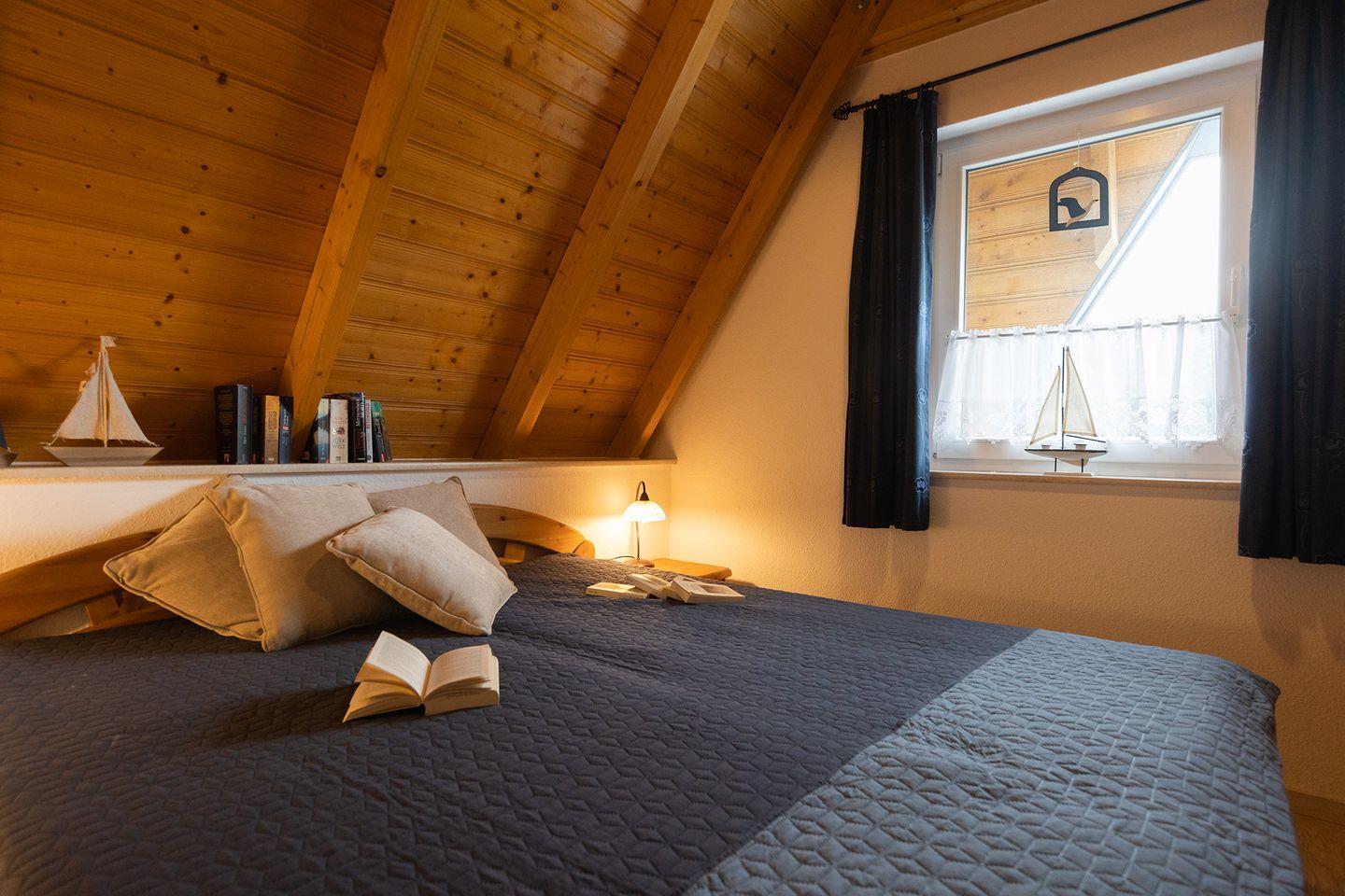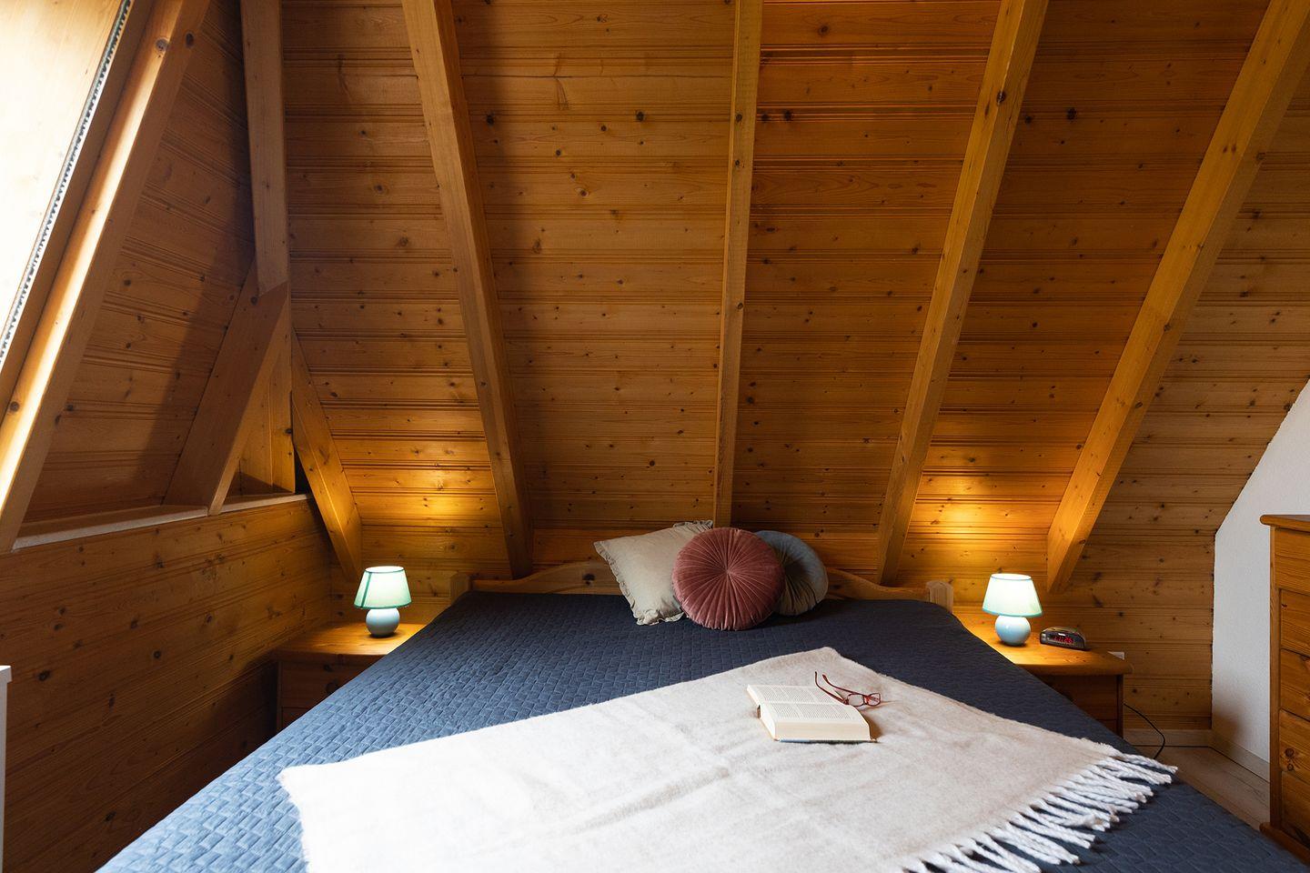Oben erwarten euch ein Elternschlafzimmer mit Doppelbett und ein weiteres Zimmer mit zwei getrennt stehenden Betten sowie ein zusätzliches WC. Helle Laminatböden und abdunkelbare Rollos sorgen für erholsame Nächte. Glasfaser-WLAN und die E-Ladestation an der Rezeption garantieren zeitgemäßen Komfort.