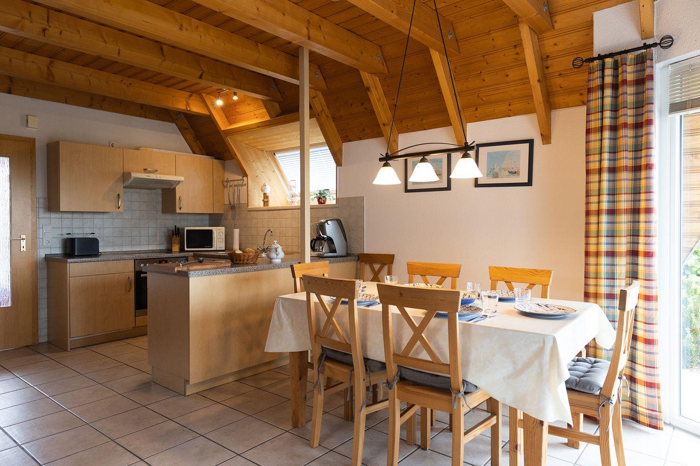 Wenn der erste Sonnenstrahl auf die Süd-Terrasse fällt, beginnt der Tag im Ferienhaus wie von selbst. Auf zwei Ebenen verteilen sich 85 m² für bis zu sechs Personen: Im Erdgeschoss verschmelzen das geflieste Wohn-Esszimmer mit Kaminofen und der große Esstisch mit einer voll ausgestatteten, offenen Küche. Daneben liegen das Schlafzimmer mit Doppelbett und ein helles Duschbad mit Waschmaschine.
