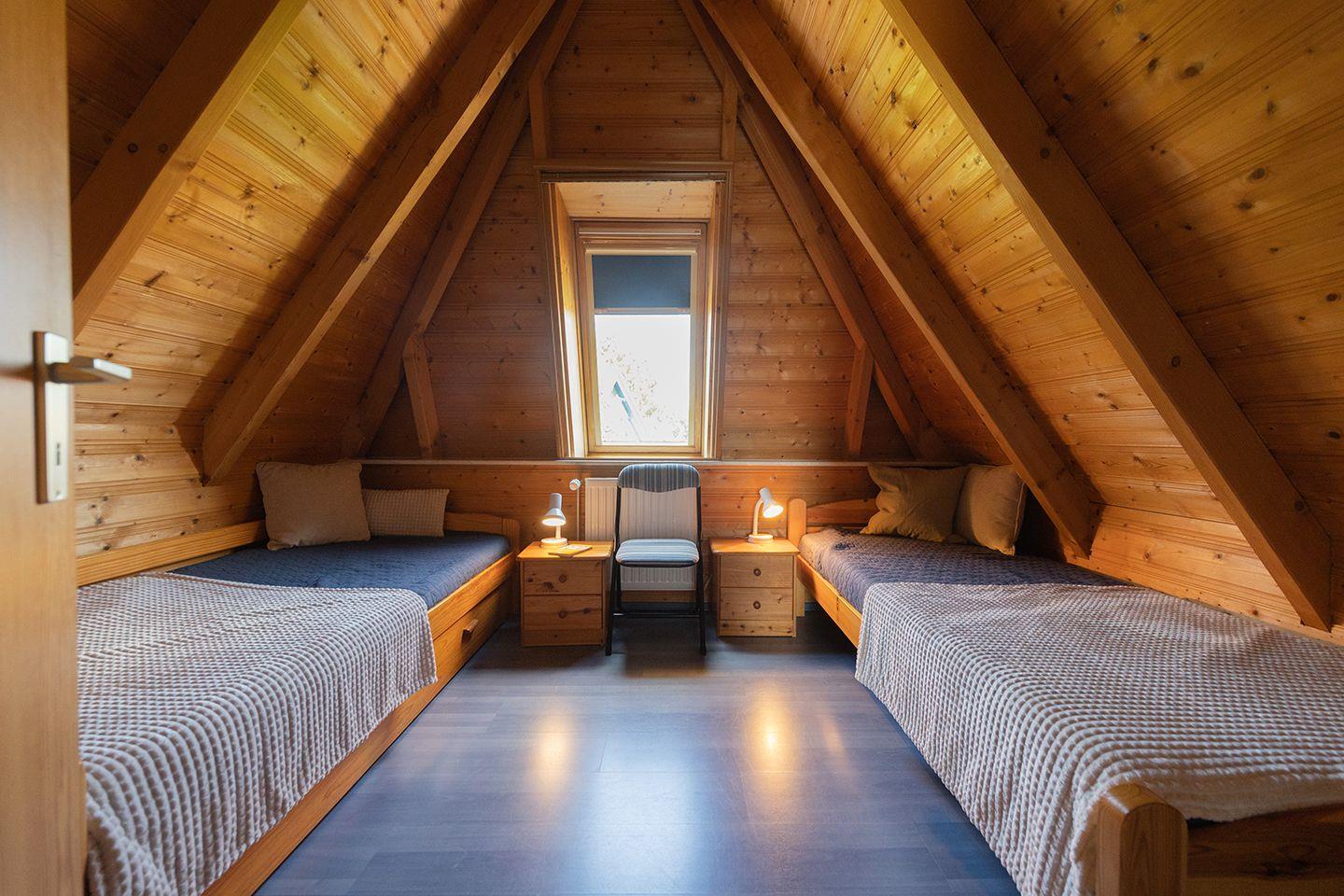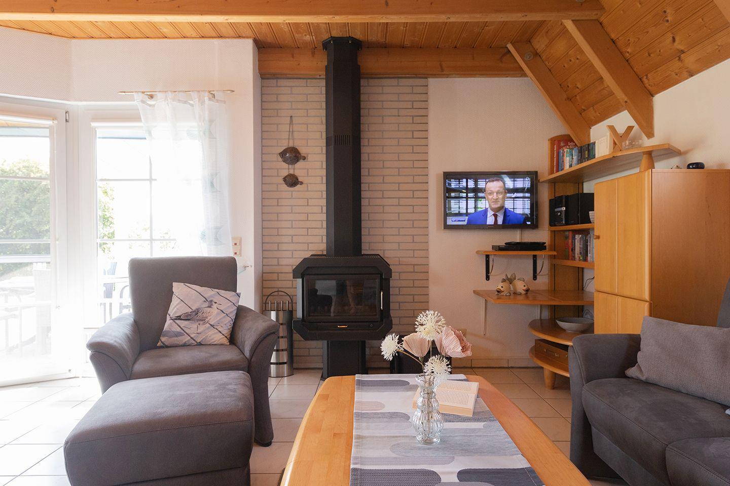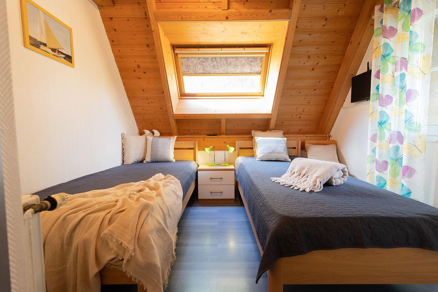 Im Erdgeschoss erwarten euch ein heller Wohn-Essbereich mit Kaminofen, eine offene, gut ausgestattete Küche, ein Schlafzimmer mit zwei Einzelbetten sowie ein modernes Duschbad. Oben liegen das Elternschlafzimmer mit Doppelbett, ein weiteres Zimmer mit getrennten Betten und ein zusätzliches WC. Alle Schlafzimmer haben Laminatboden, der Wohnbereich ist gefliest - praktisch für den Familienalltag.