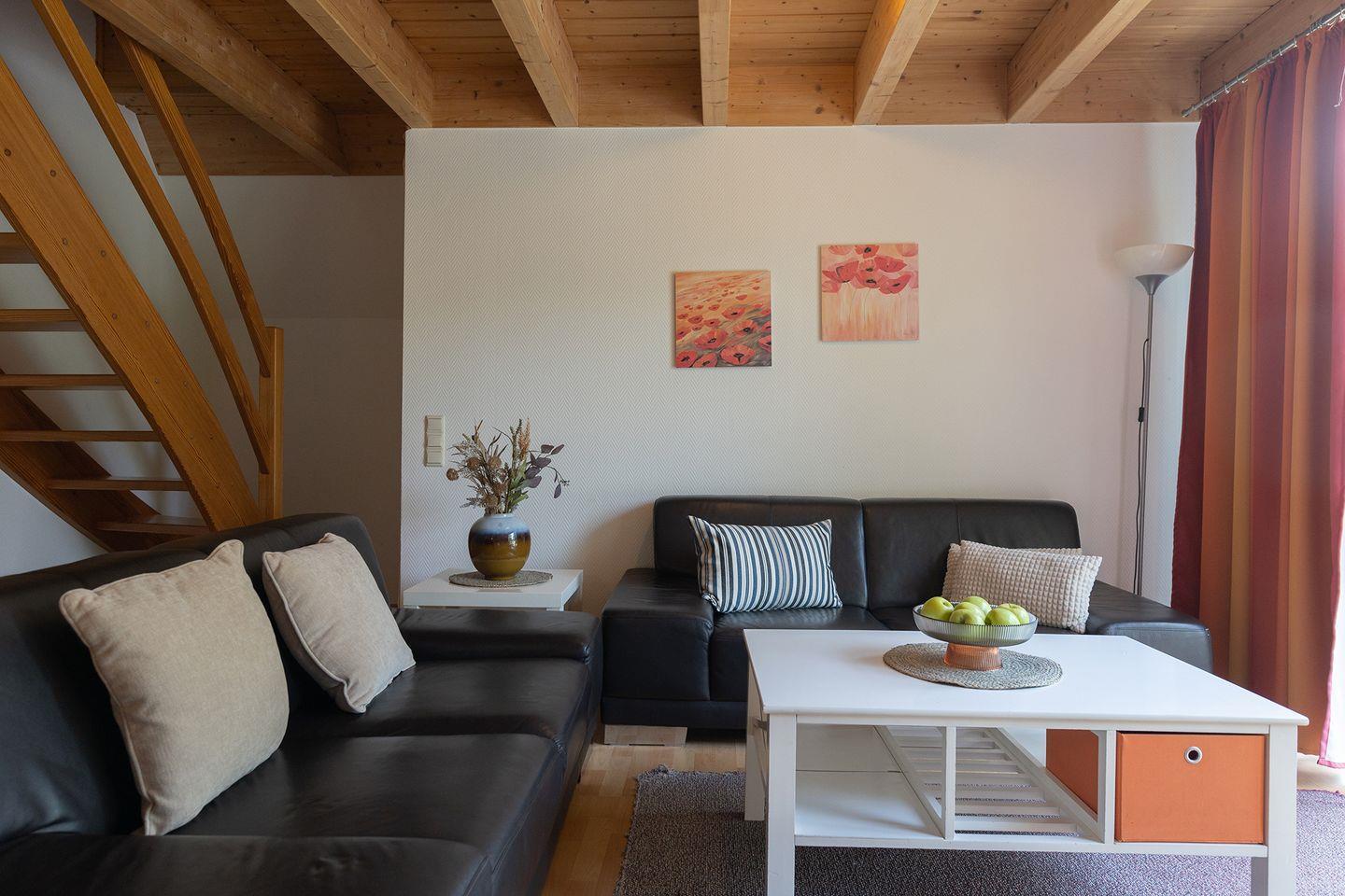 Der Wohnbereich mit Laminatboden, Sofaecke, Essplatz und zwei Fernsehern ist gemütlich und praktisch zugleich. Für Unterhaltung sorgen Blu-ray- und DVD-Player, Radio, CD-Spieler, WLAN und Spiele. Die offene Küche ist voll ausgestattet mi8t Ceranfeld, Backofen, Spülmaschine, Mikrowelle, Kaffeemaschine und mehr. Zwei Schlafzimmer mit Teppichboden bieten Rückzugsorte, ein Kinderbett und Hochstuhl sind vorhanden.