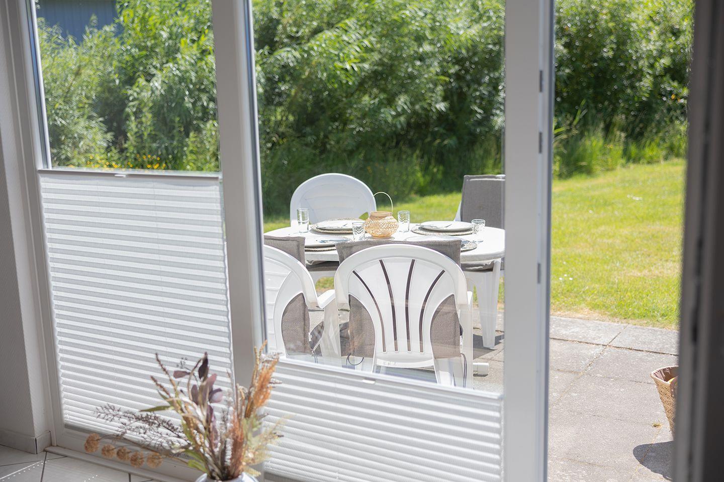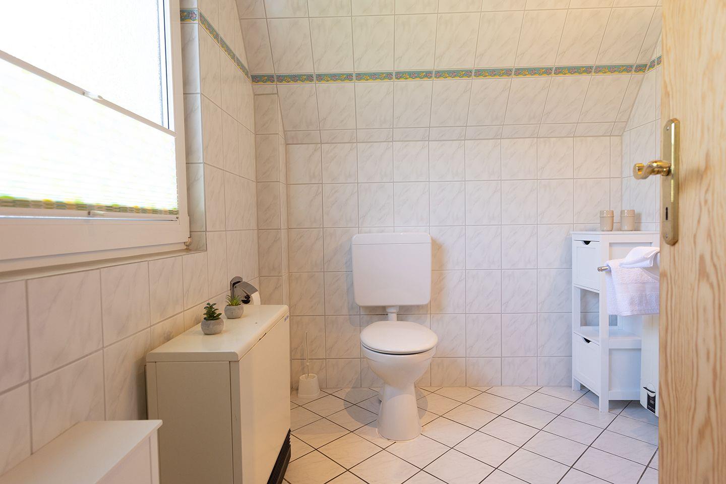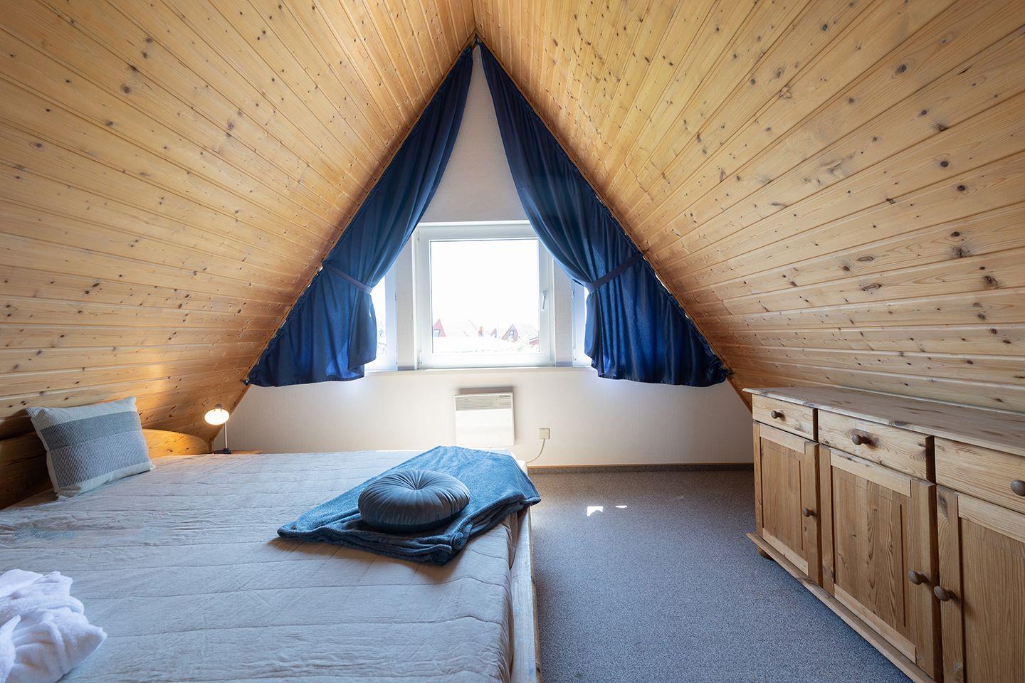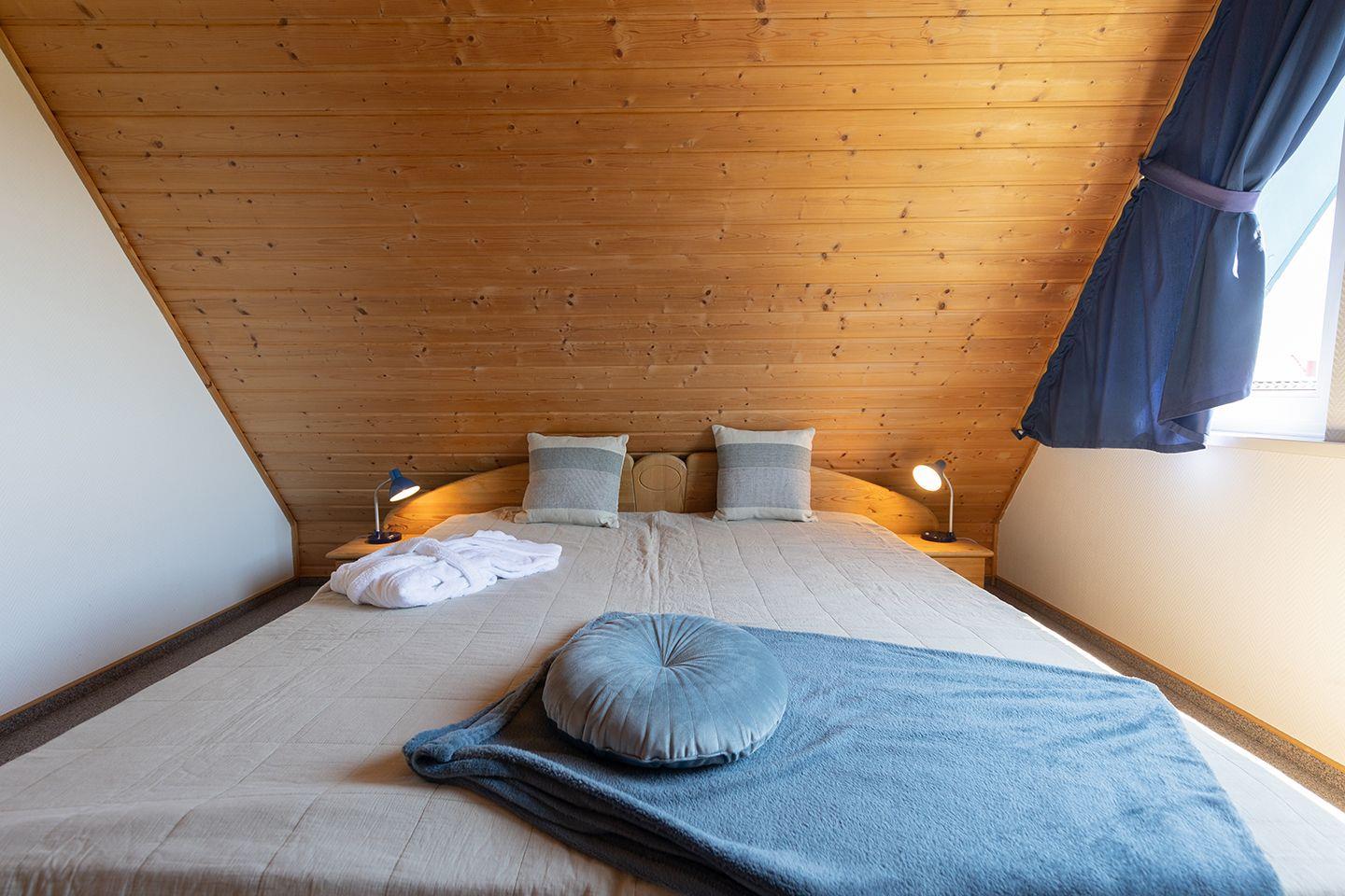 Im Obergeschoss liegen ein Schlafzimmer mit Doppelbett und ein separates Kinderzimmer mit zwei Einzelbetten. Insektenschutz und Verdunklungsrollos sorgen für ruhige Nächte, pflegeleichter Vinylboden für ein unkompliziertes Urlaubsgefühl. Kinderbett, Hochstuhl und Treppengitter sind natürlich vorhanden – ideal für den Nordseeurlaub mit Kindern.