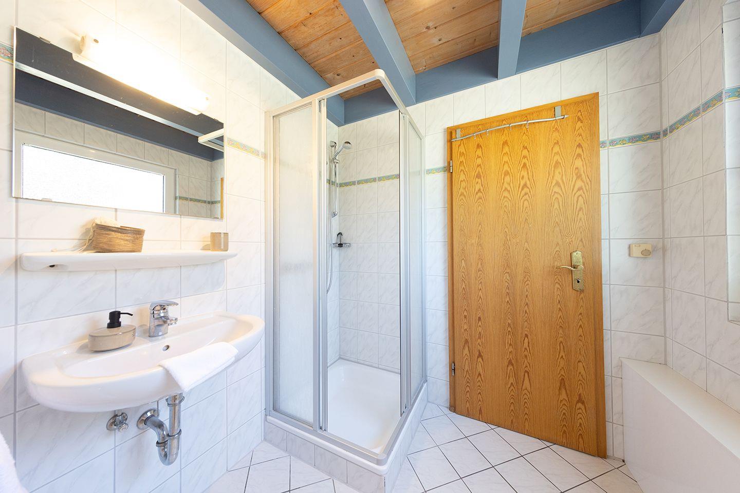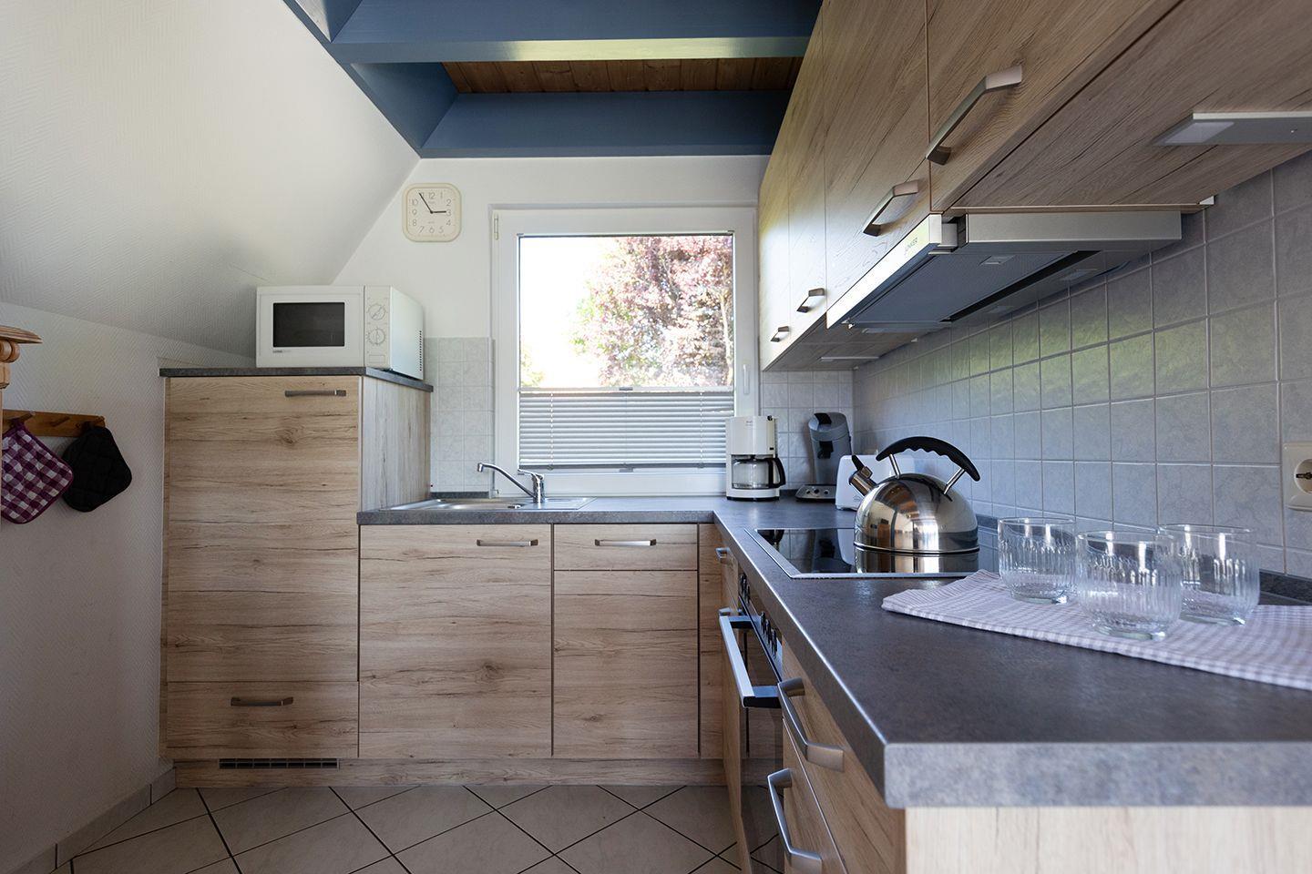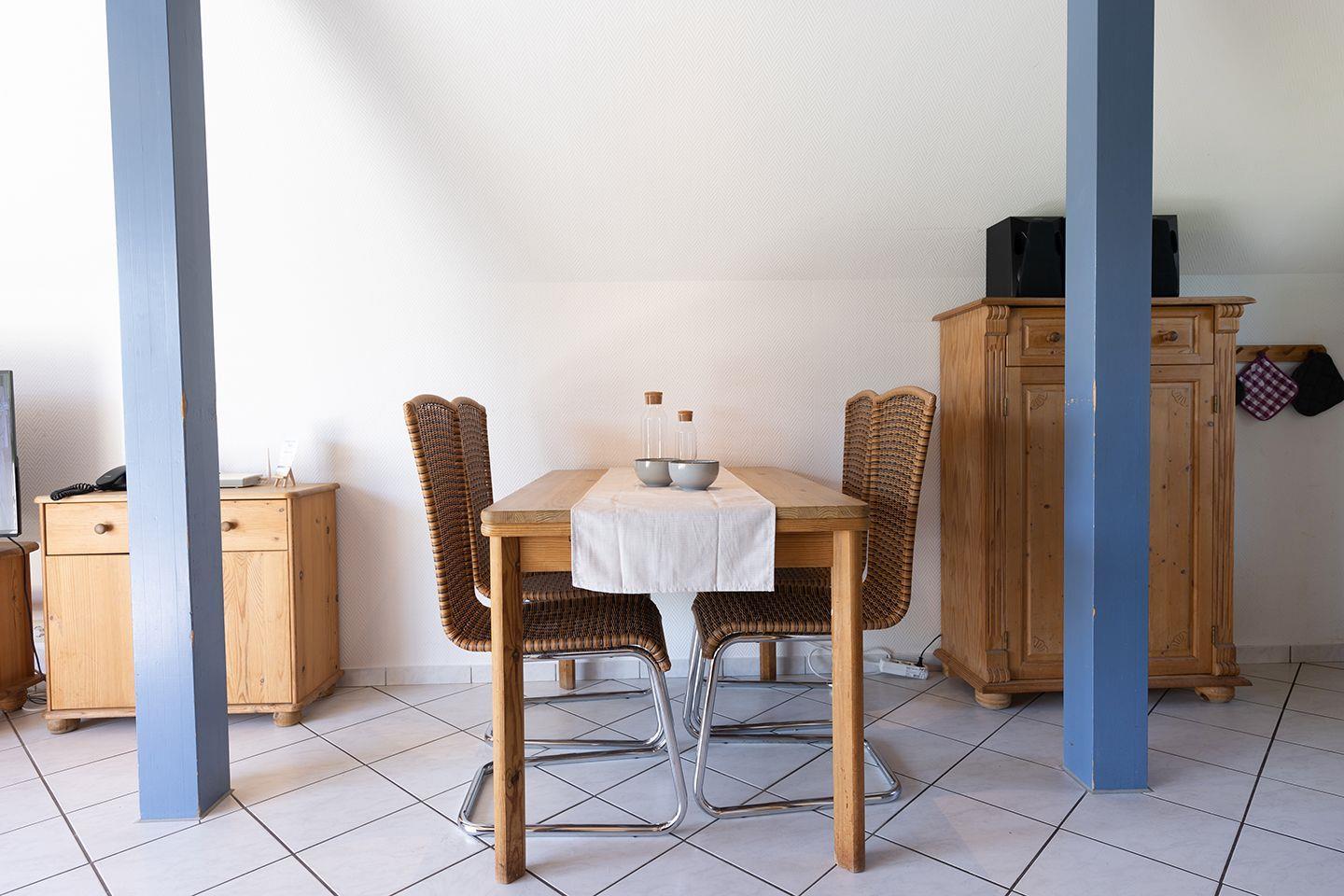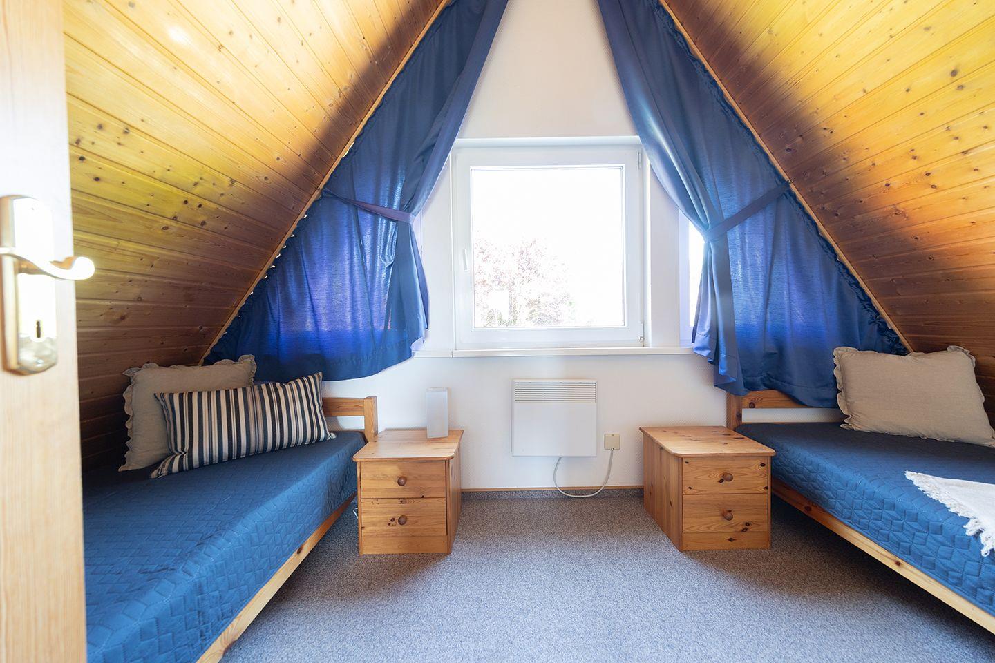 Im Obergeschoss liegen ein Schlafzimmer mit Doppelbett und ein separates Kinderzimmer mit zwei Einzelbetten. Insektenschutz und Verdunklungsrollos sorgen für ruhige Nächte, pflegeleichter Vinylboden für ein unkompliziertes Urlaubsgefühl. Kinderbett, Hochstuhl und Treppengitter sind natürlich vorhanden – ideal für den Nordseeurlaub mit Kindern.