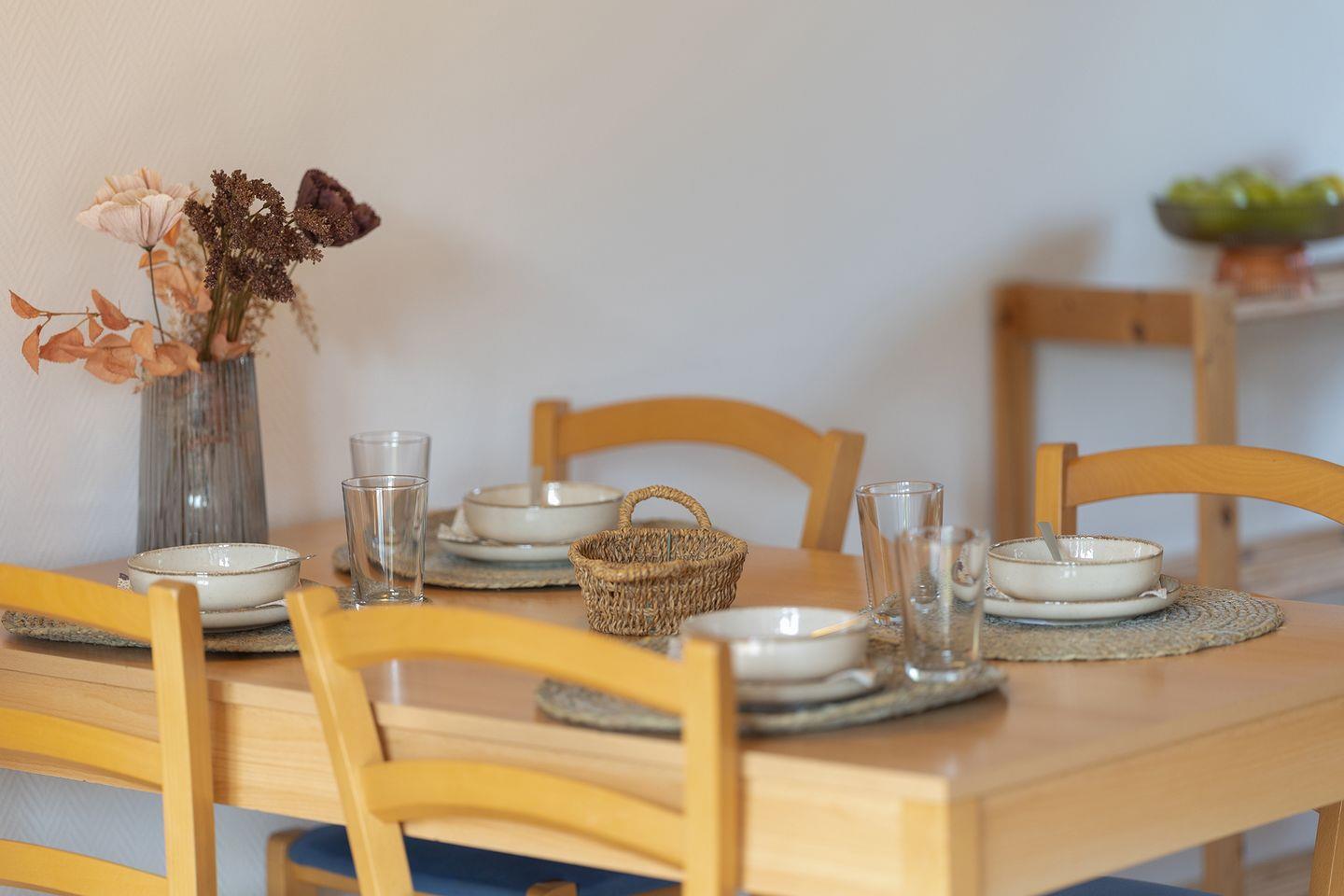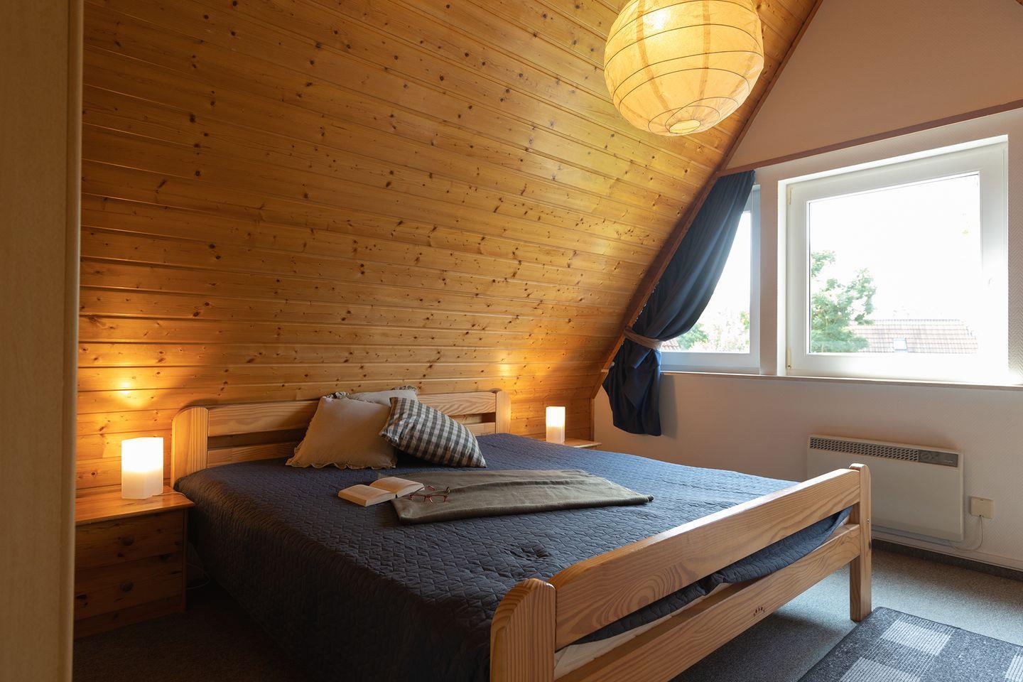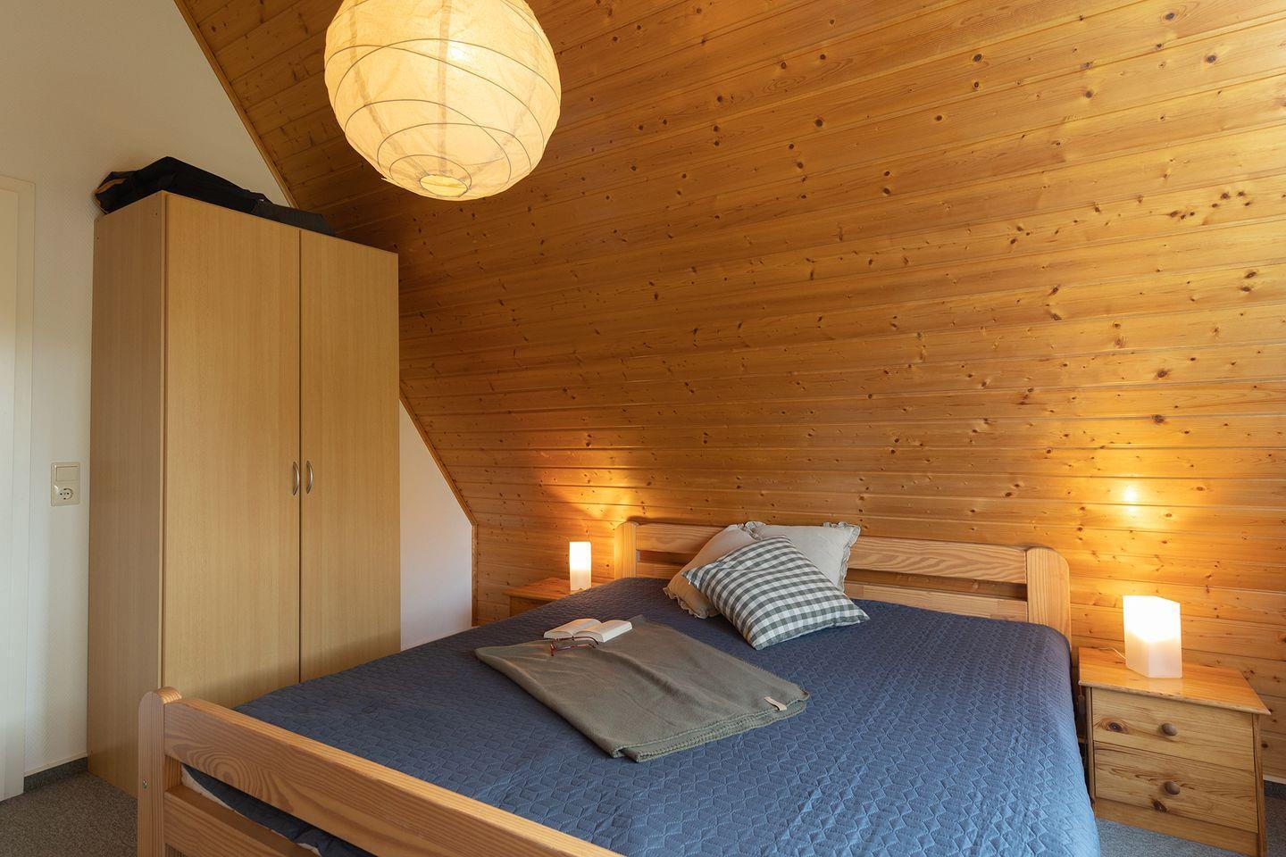 Im Wohnbereich mit Laminatboden sorgen Sofaecke, Essplatz, WLAN, zwei Fernseher, DVD- und CD-Player sowie Gesellschaftsspiele für Komfort und Unterhaltung. Die offene Küche ist voll ausgestattet: Ceranfeld, Spülmaschine, Backofen, Mikrowelle, Kühlschrank mit Gefrierfach, Kaffeemaschine und mehr. Zwei Schlafzimmer mit Teppichboden, ein Babybett, Hochstuhl und Treppengitter machen das Haus familienfreundlich.
